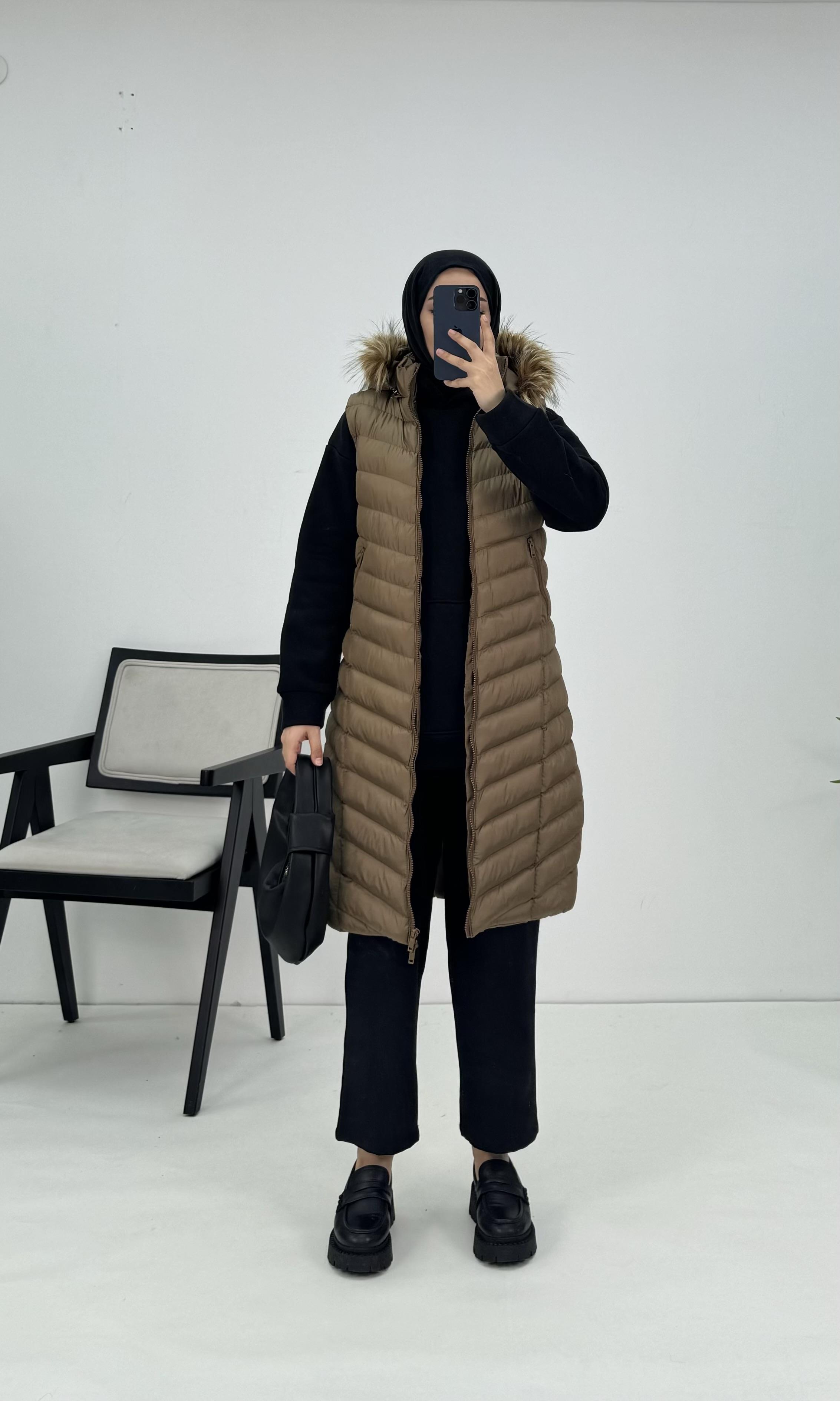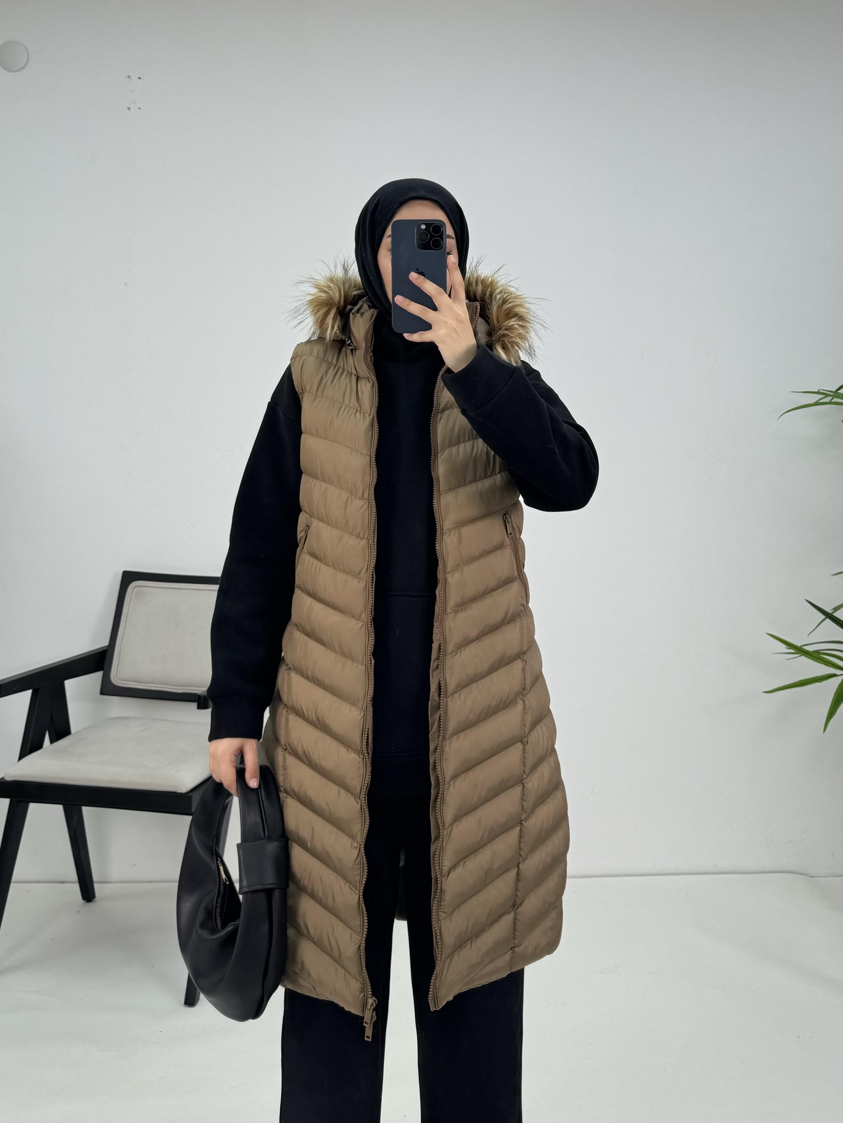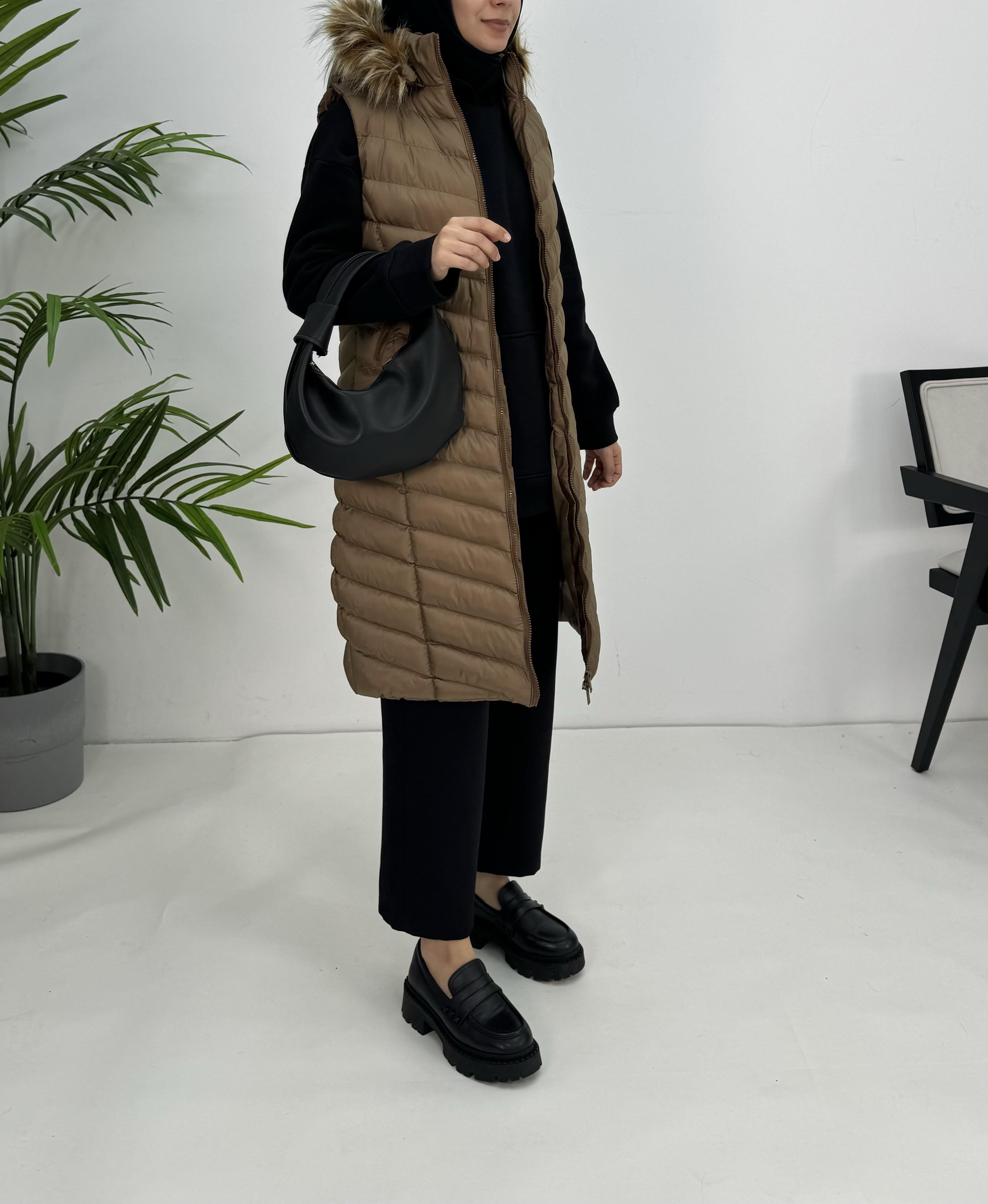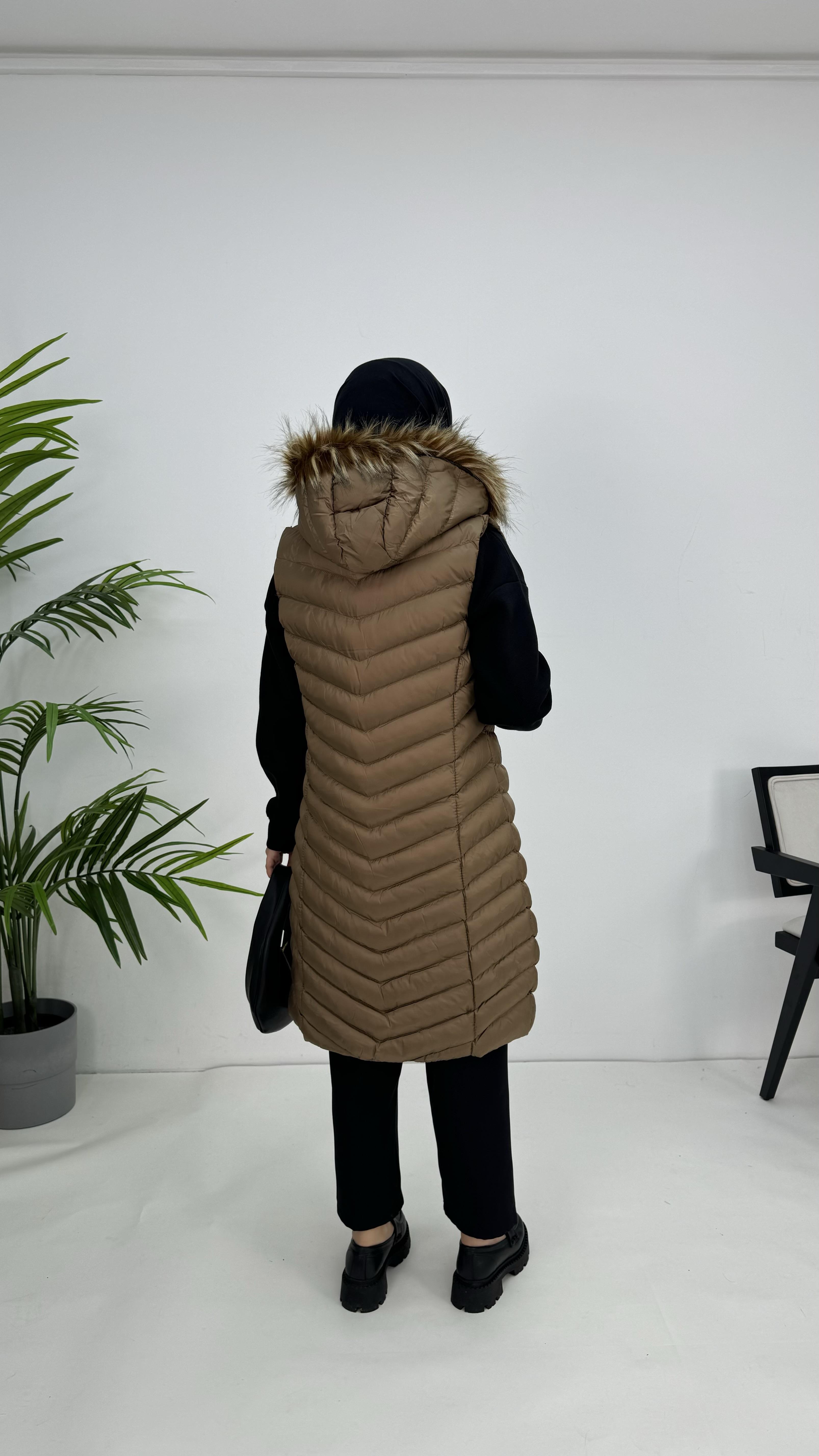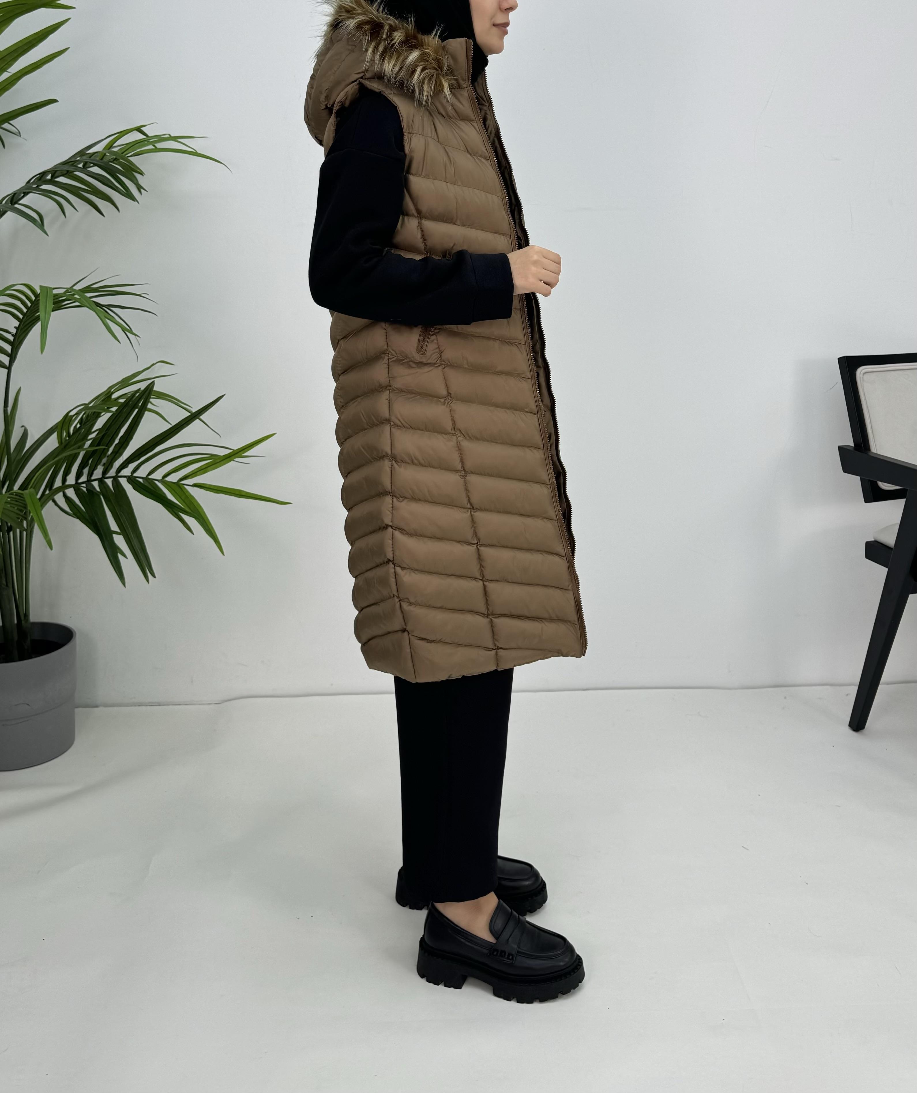 0017-kapşonu peluşlu ince V dikişli şişme yelek-taba (0017)