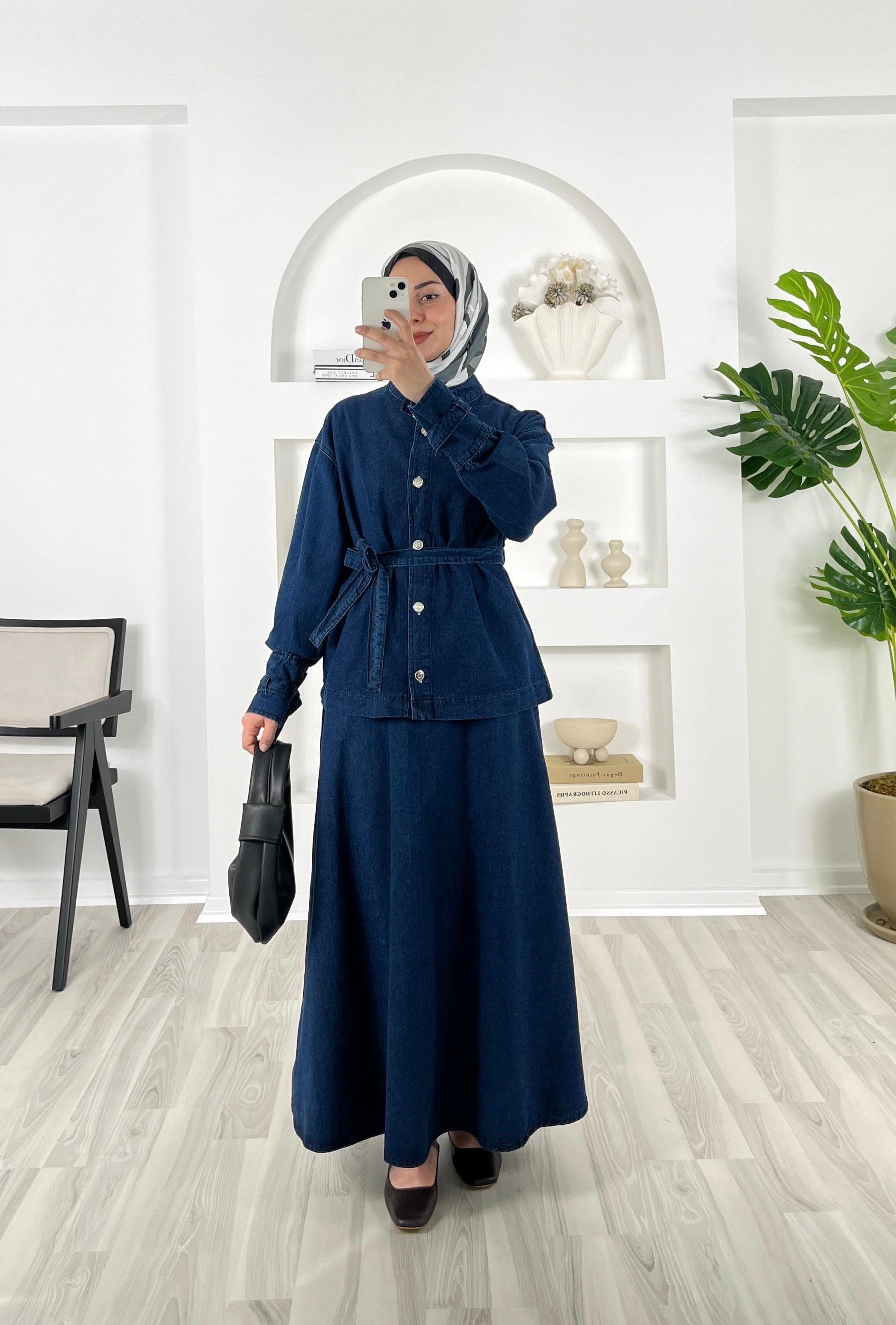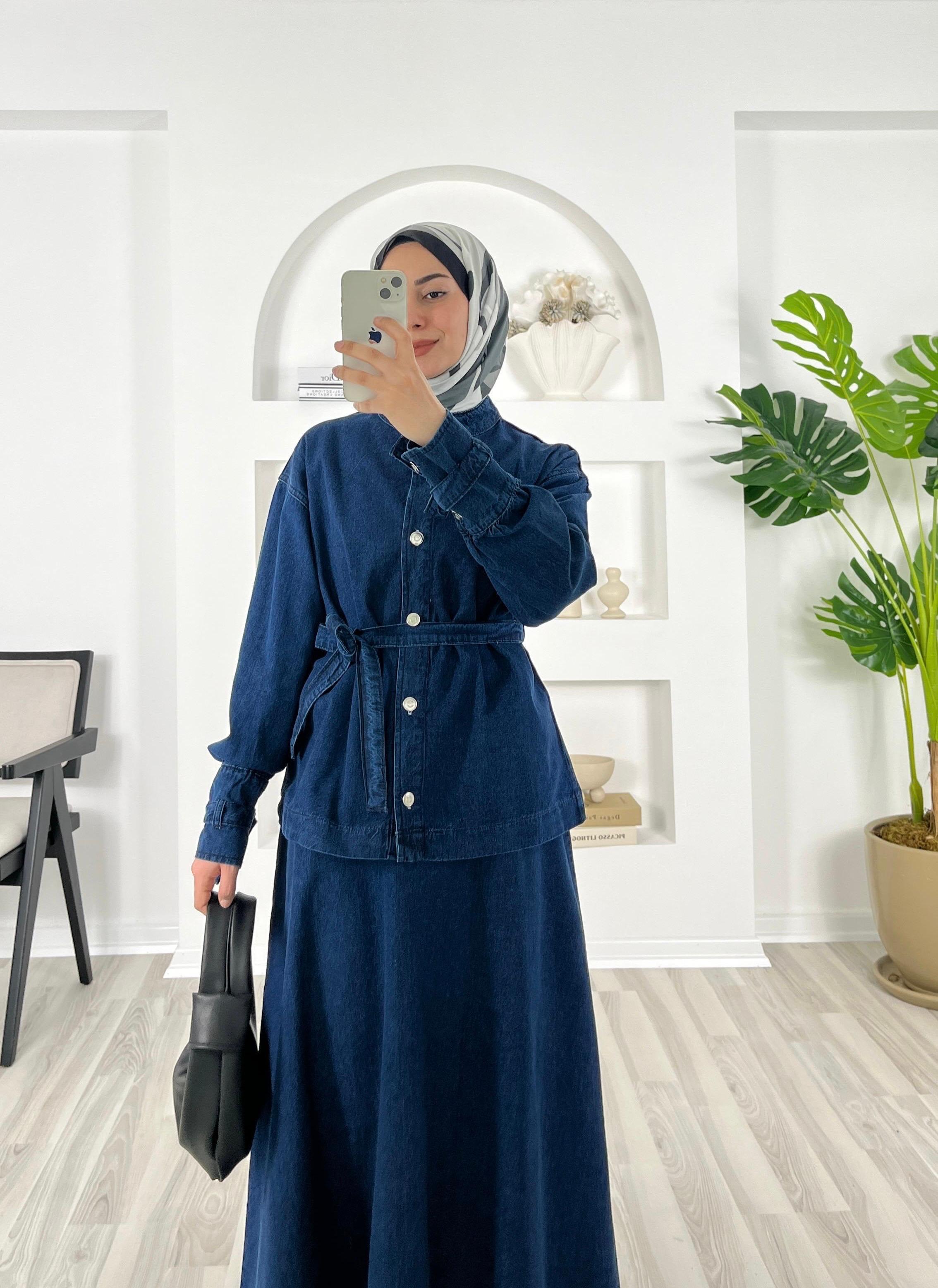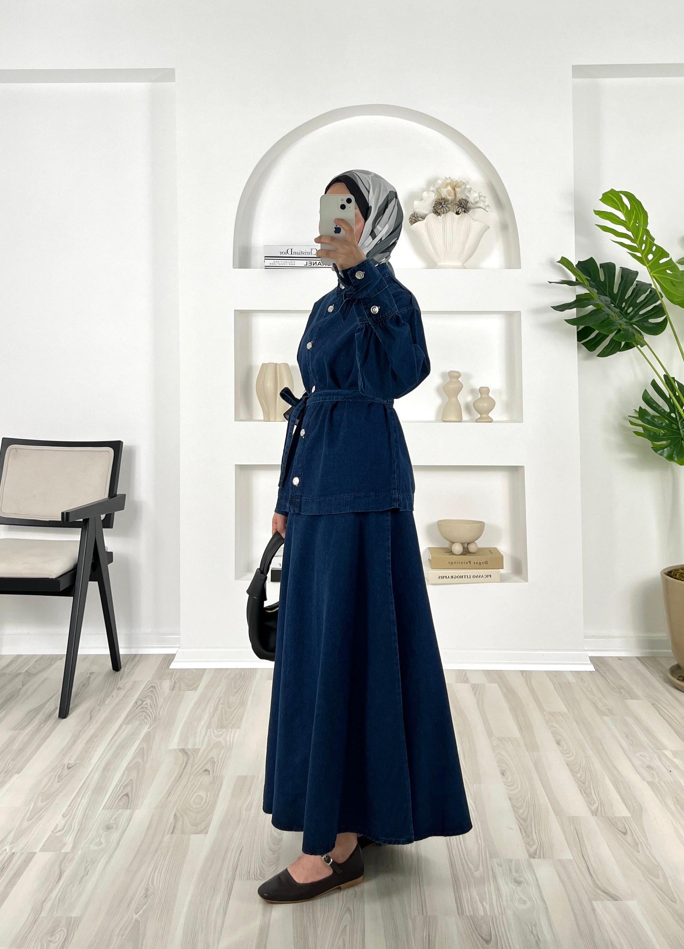 önü düğmeli kemerli bilek ucu bağlama detaylı etekli takım