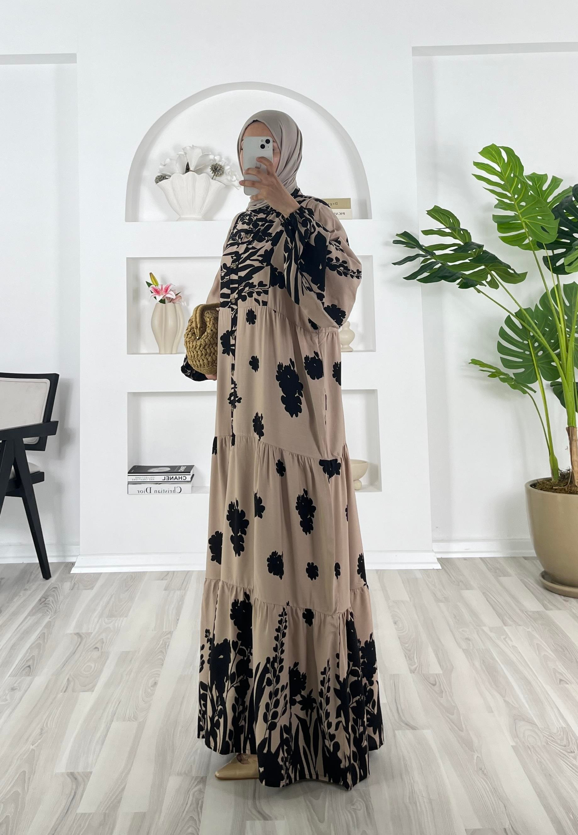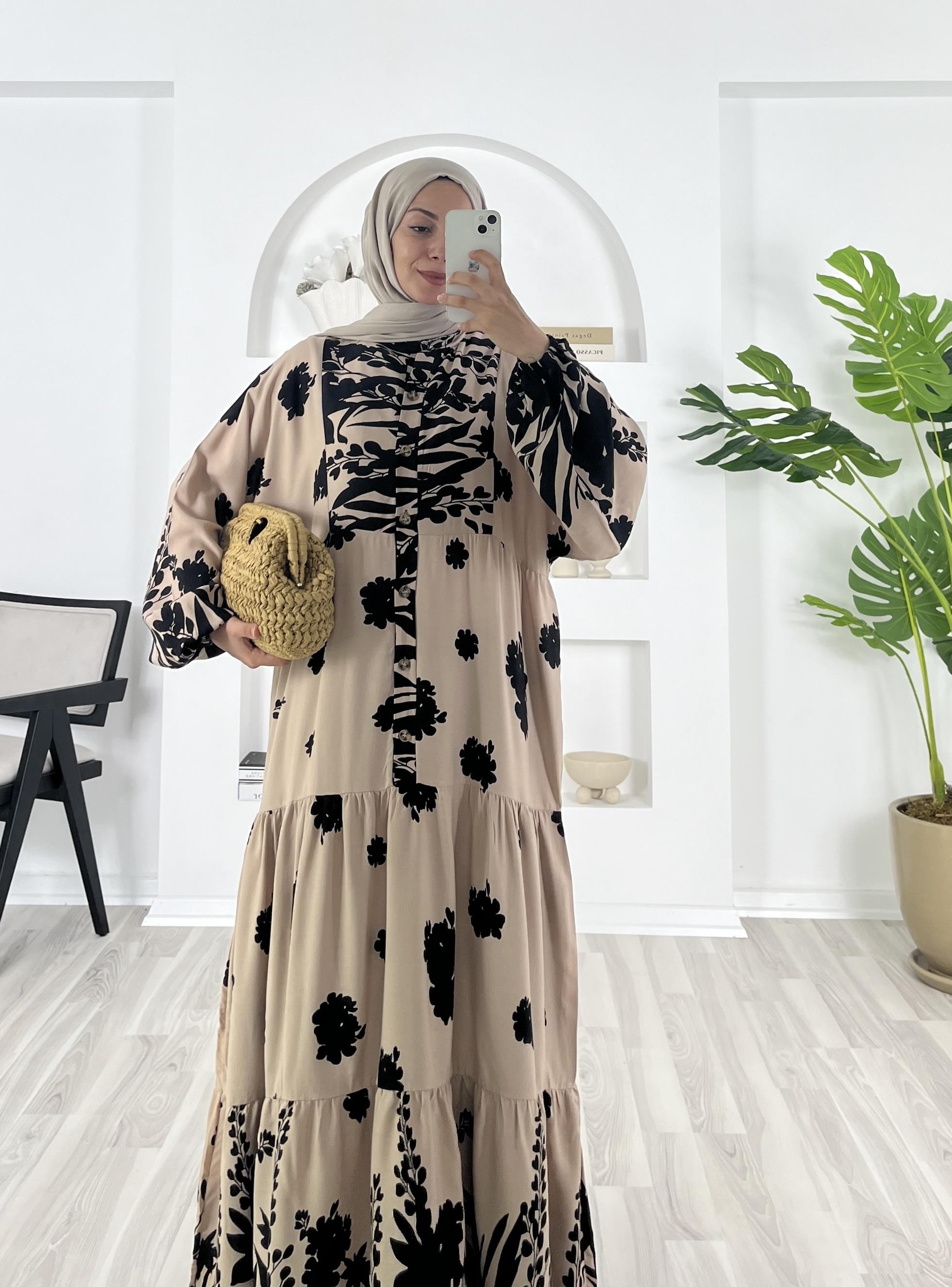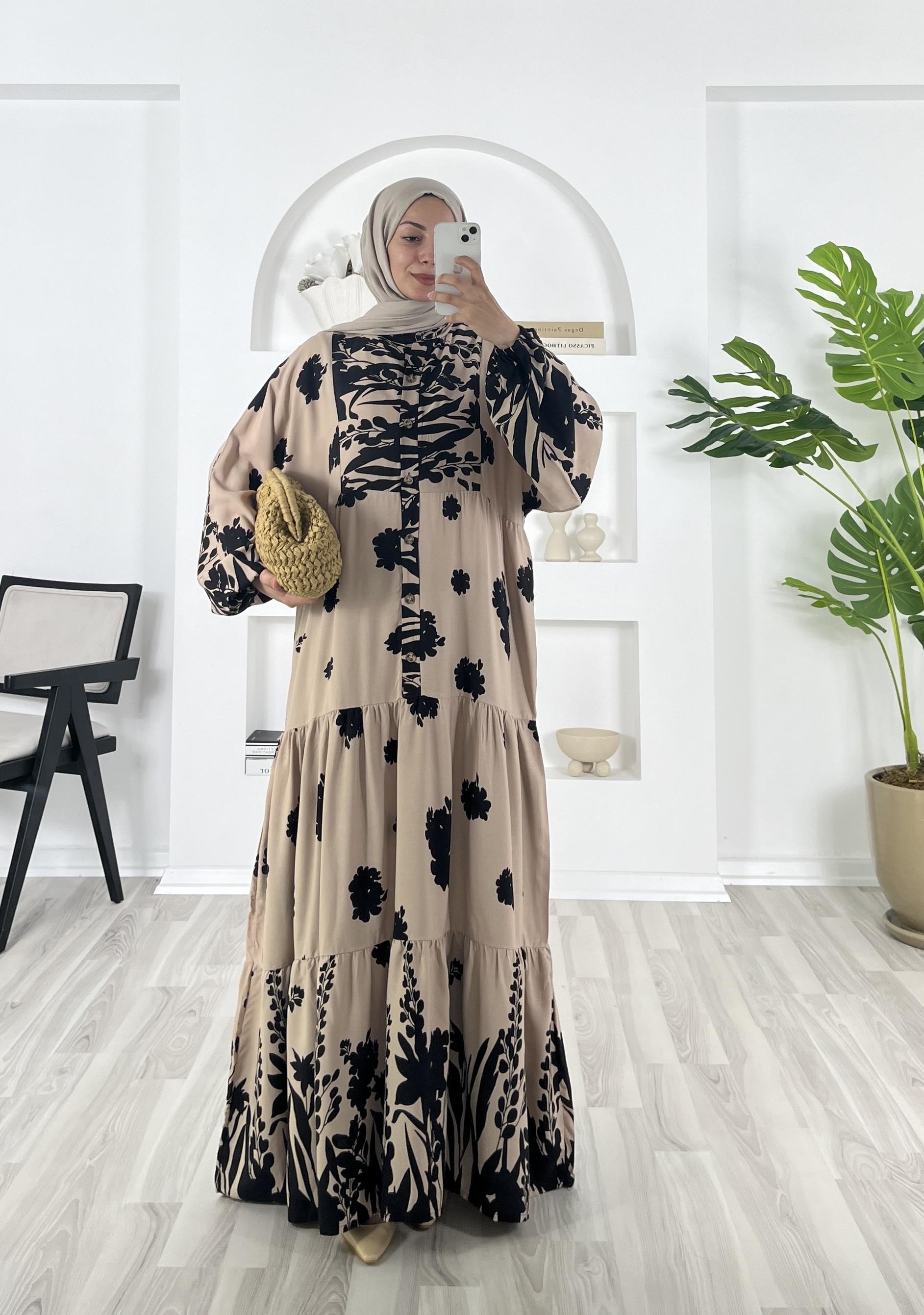0164 - viskon kumaş dügmeli kolları lastilkli elbise - sütlü kahve (0164)