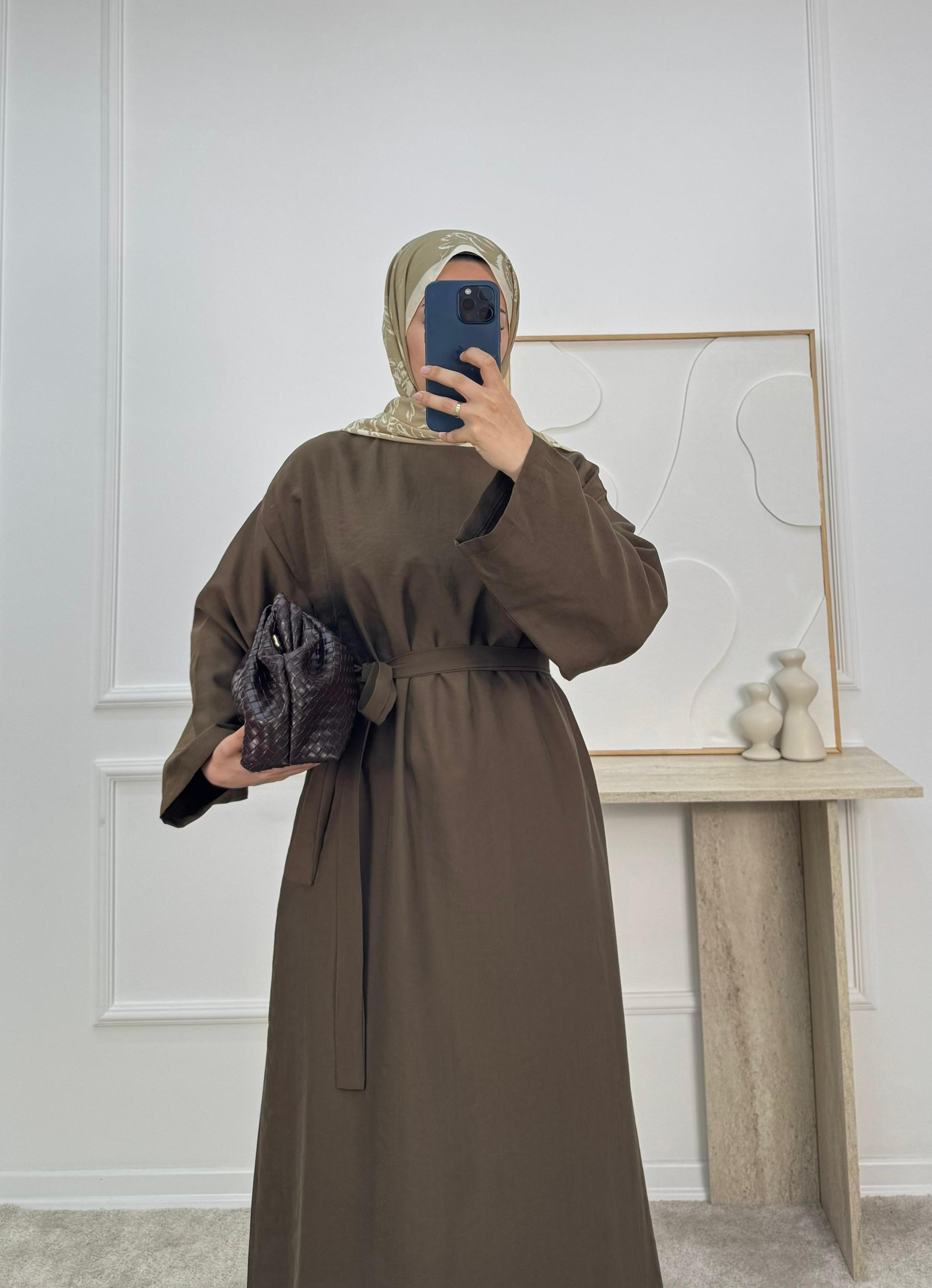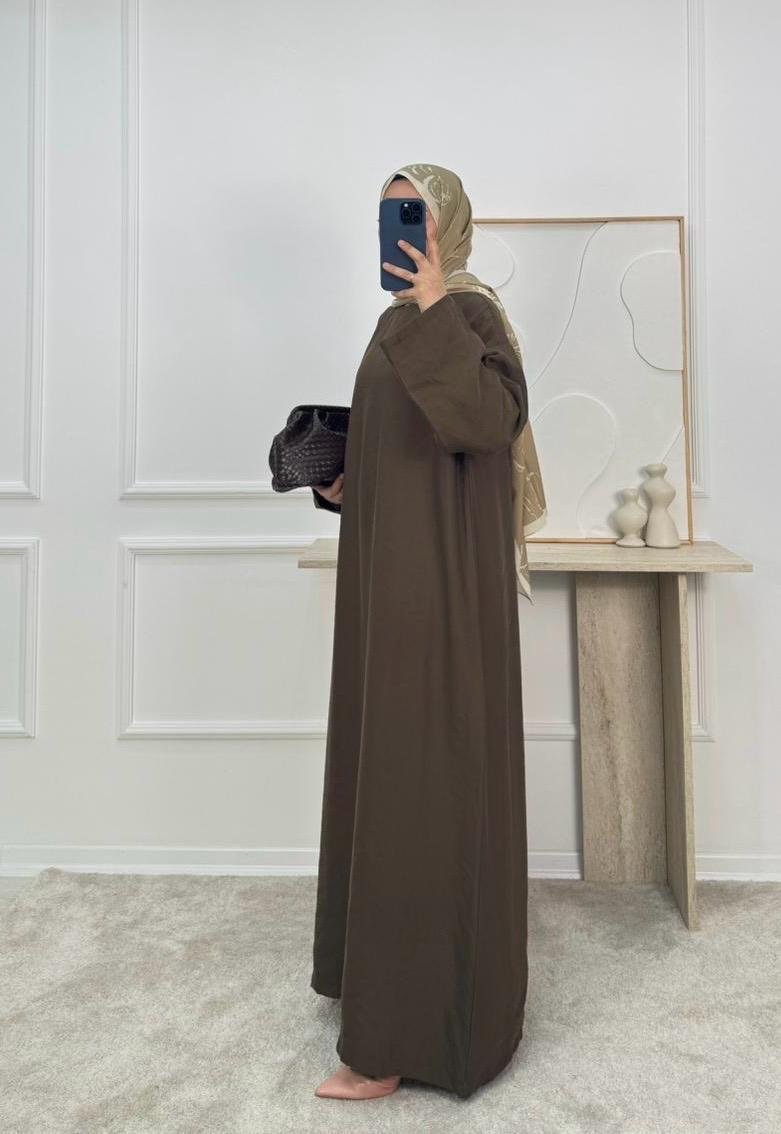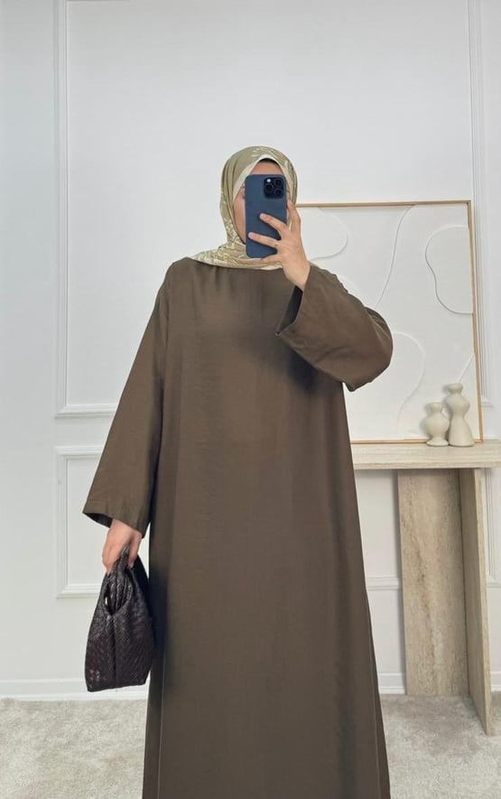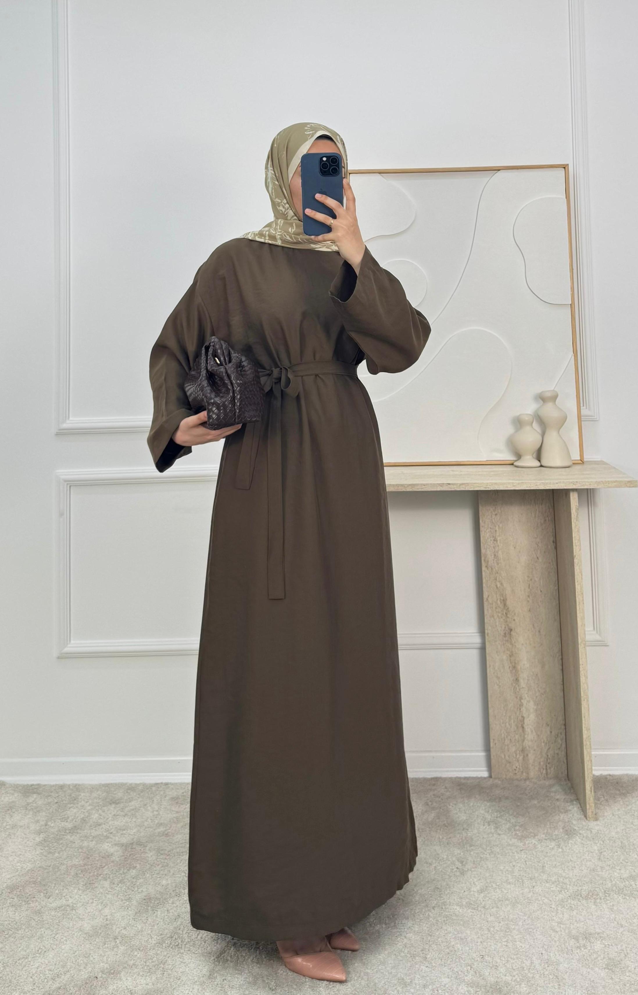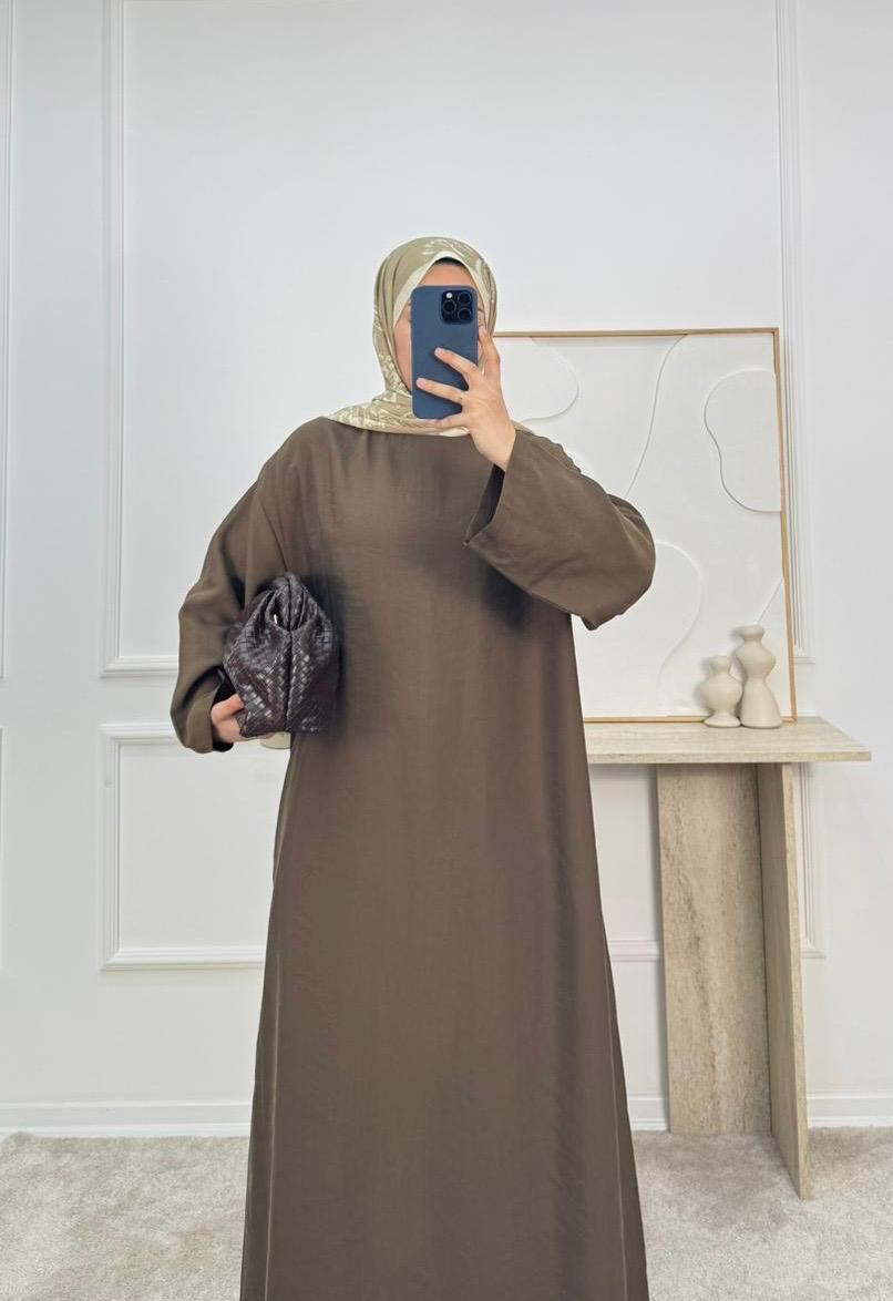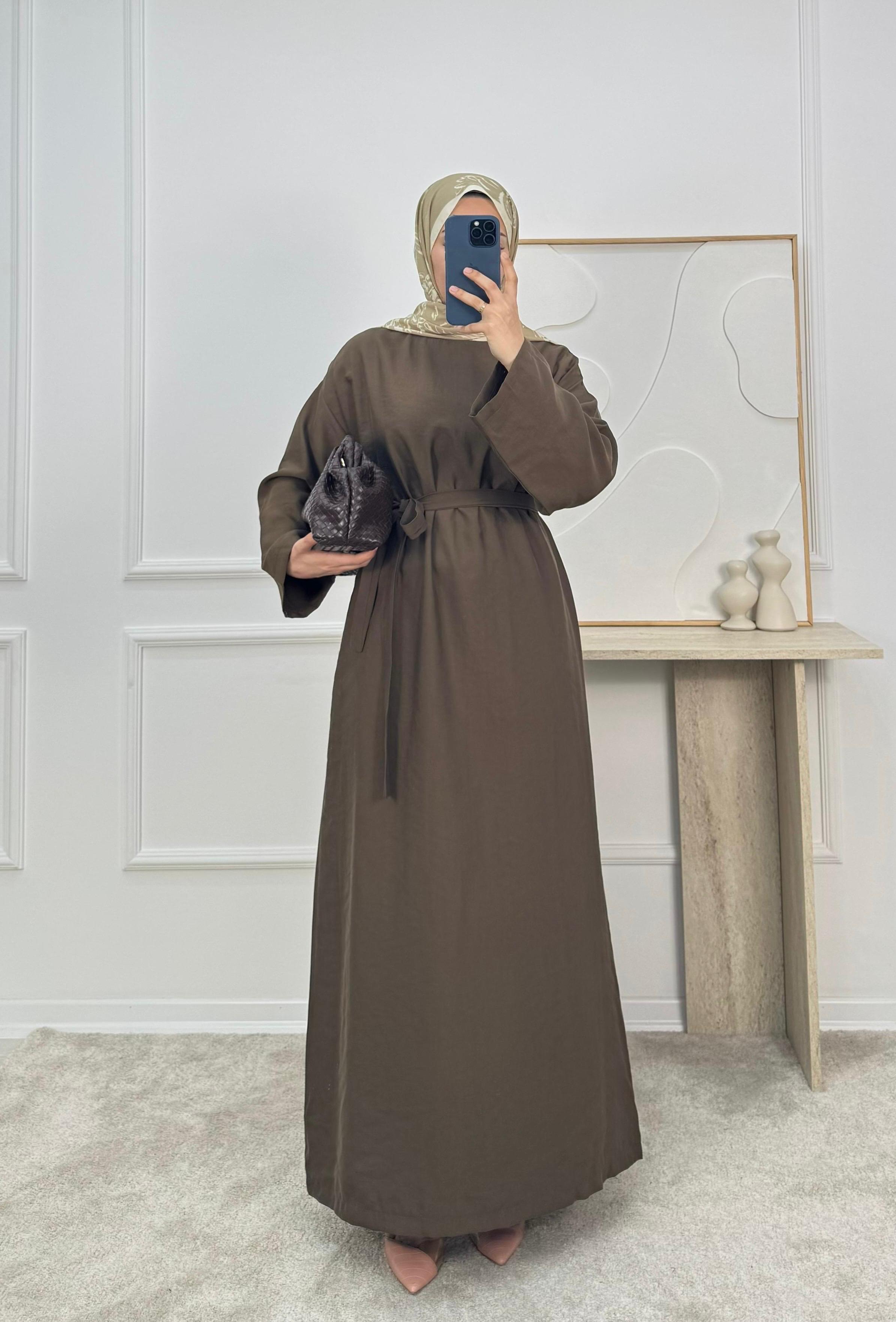 0183-cupra kumaş kuşaklı düz elbise-kahve (0183)