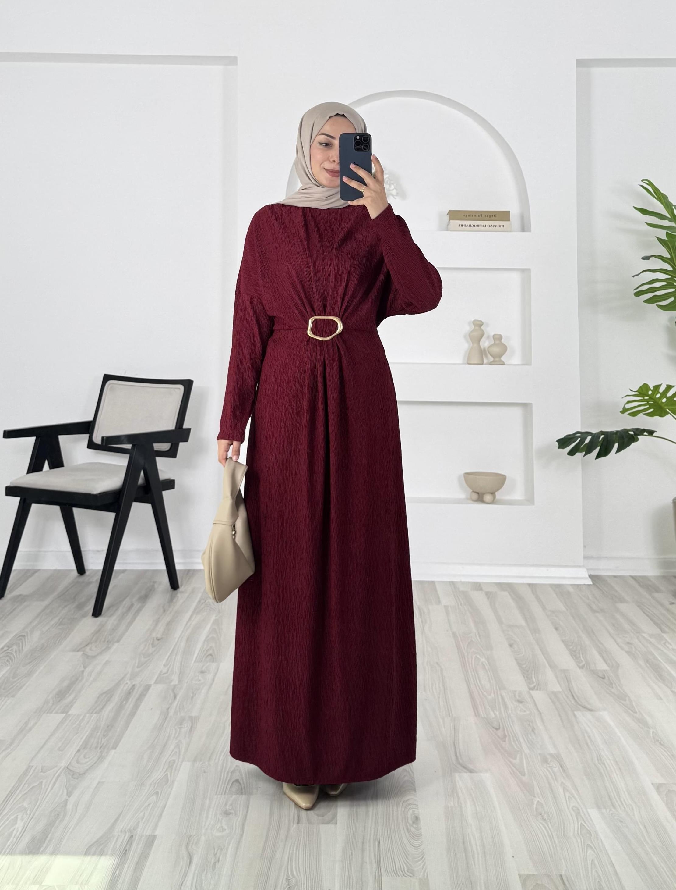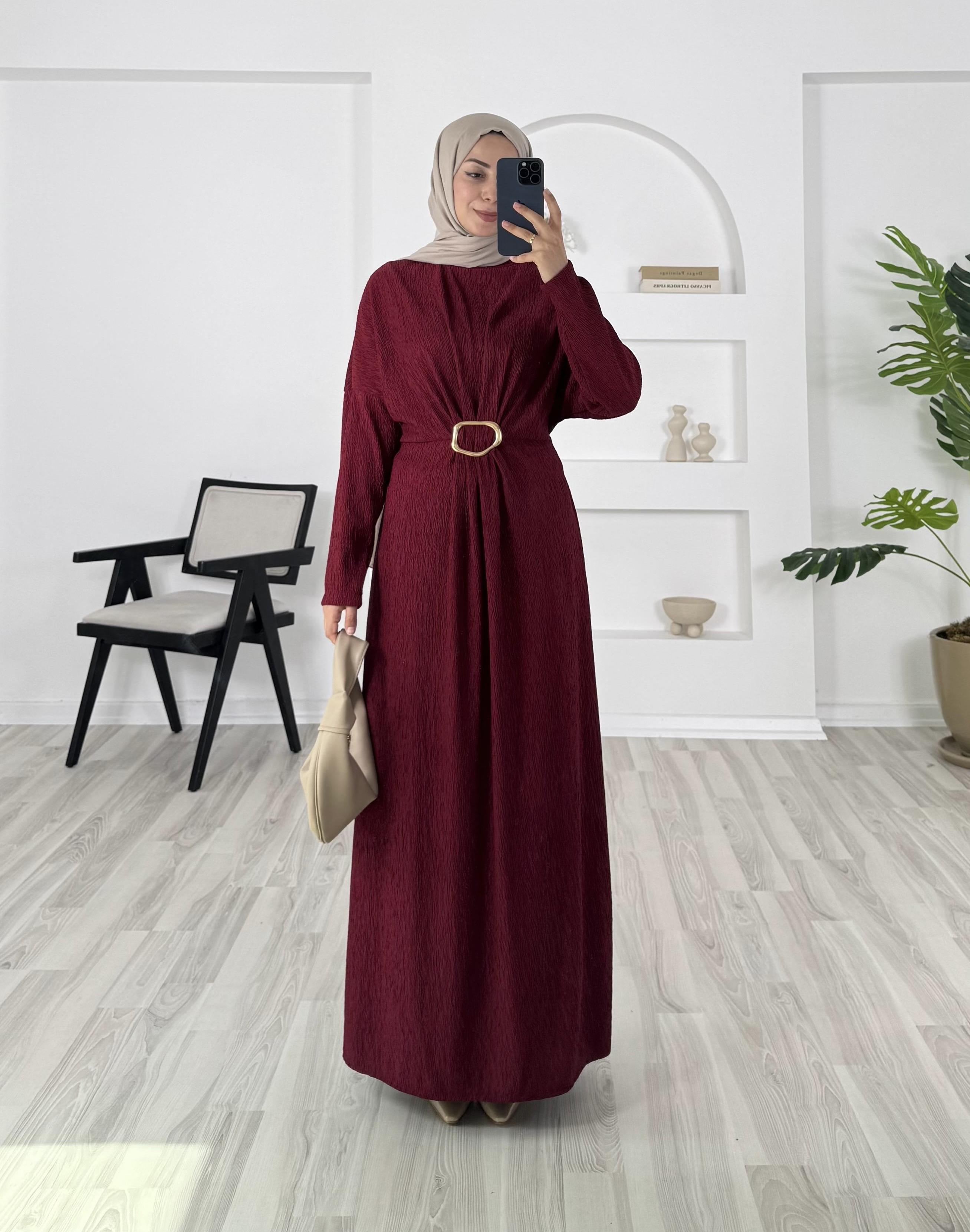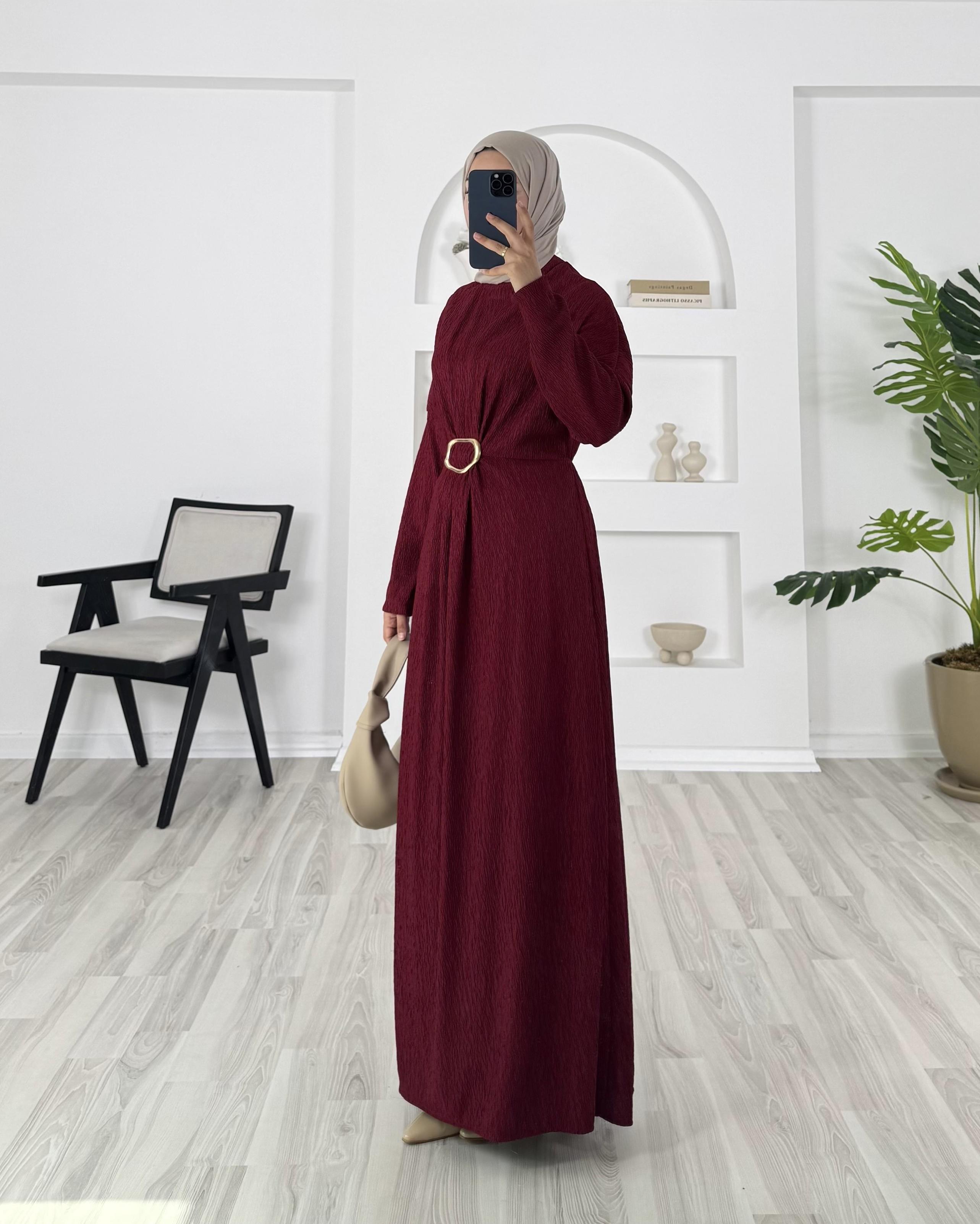 0369 - damla kumaş önü tokalı kalın elbise - bordo (0369)