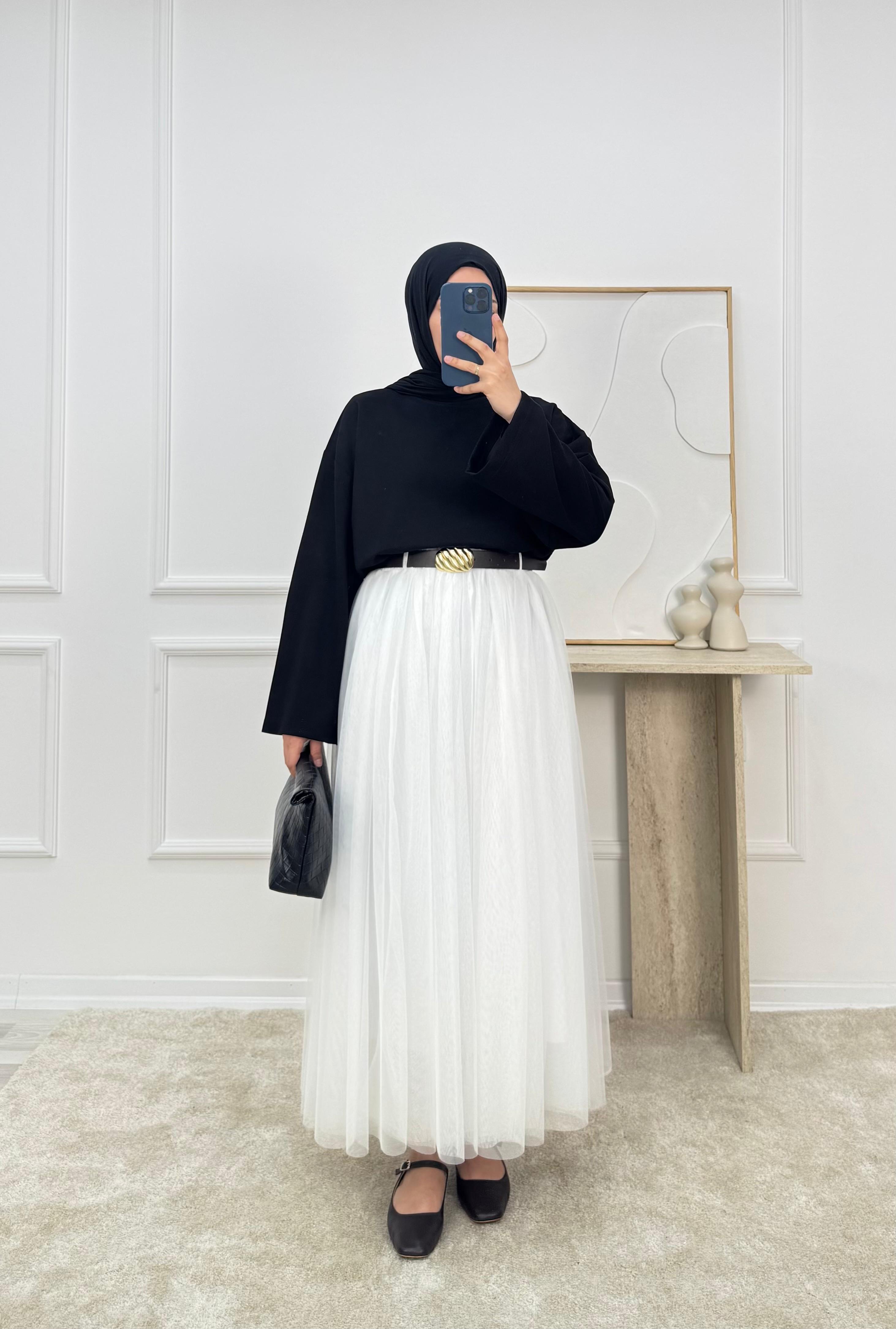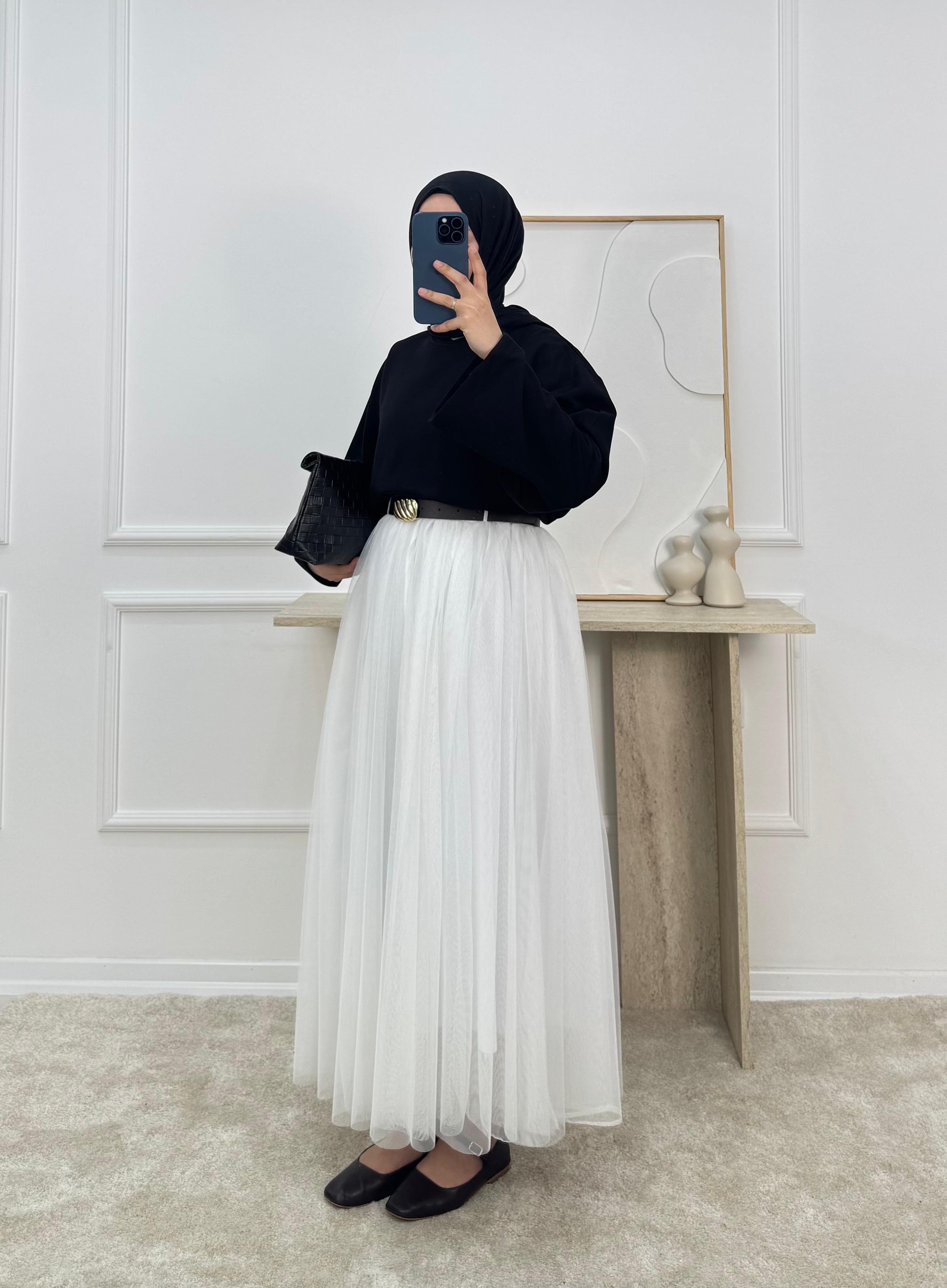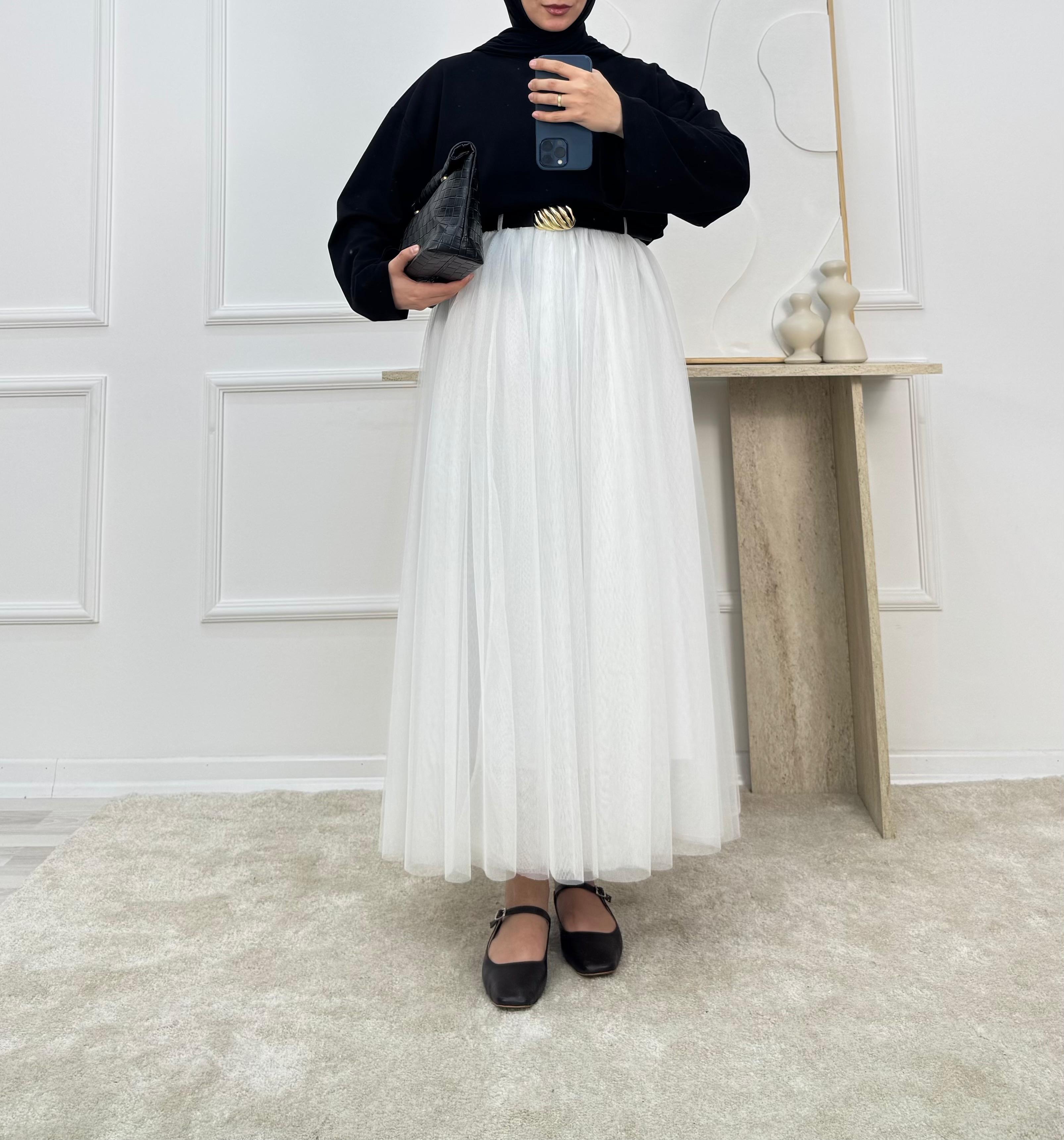 0864-pileli kemerli tül etek-beyaz (0864)