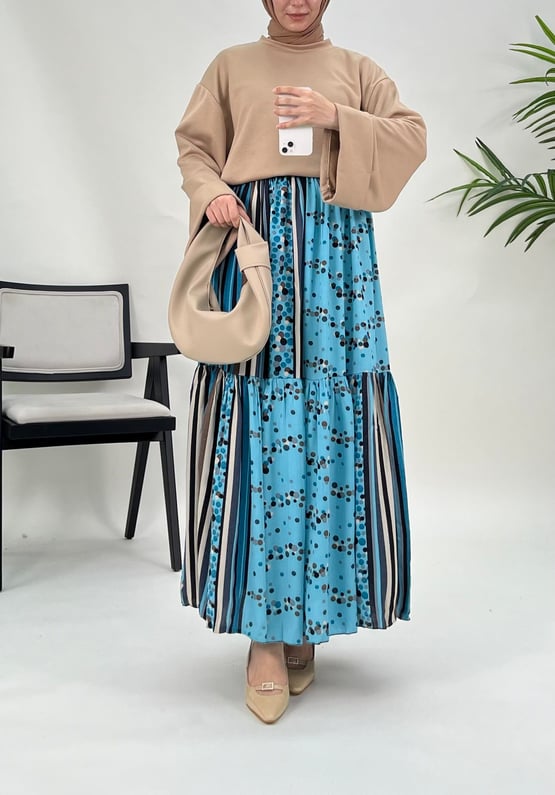 0880-krep kumaş-etnik desenli beli lastikli etek-mavi (0880)