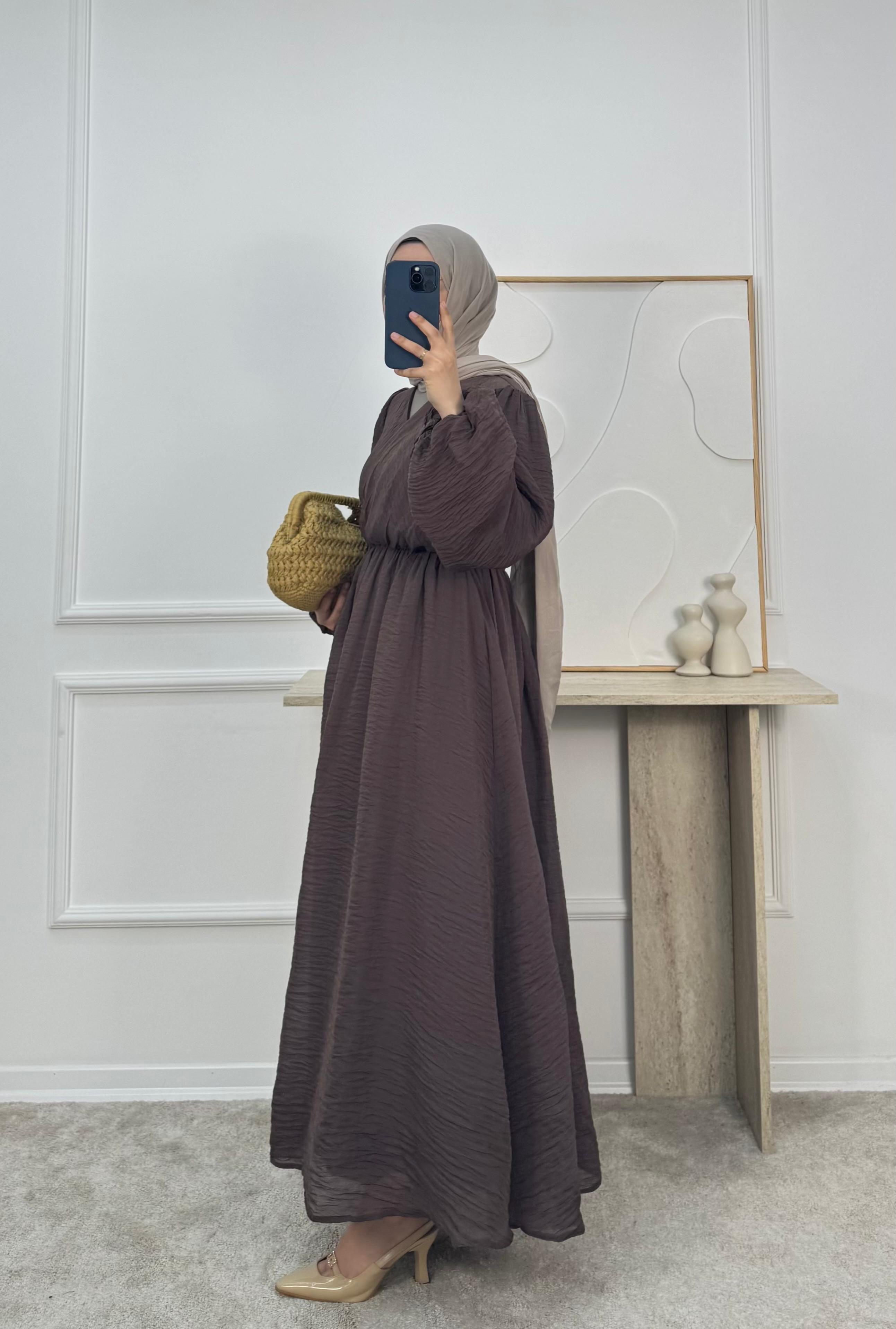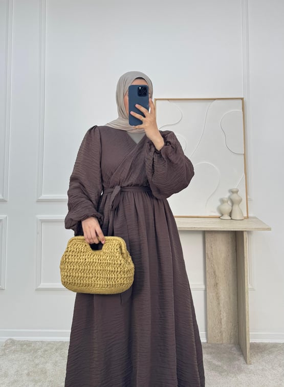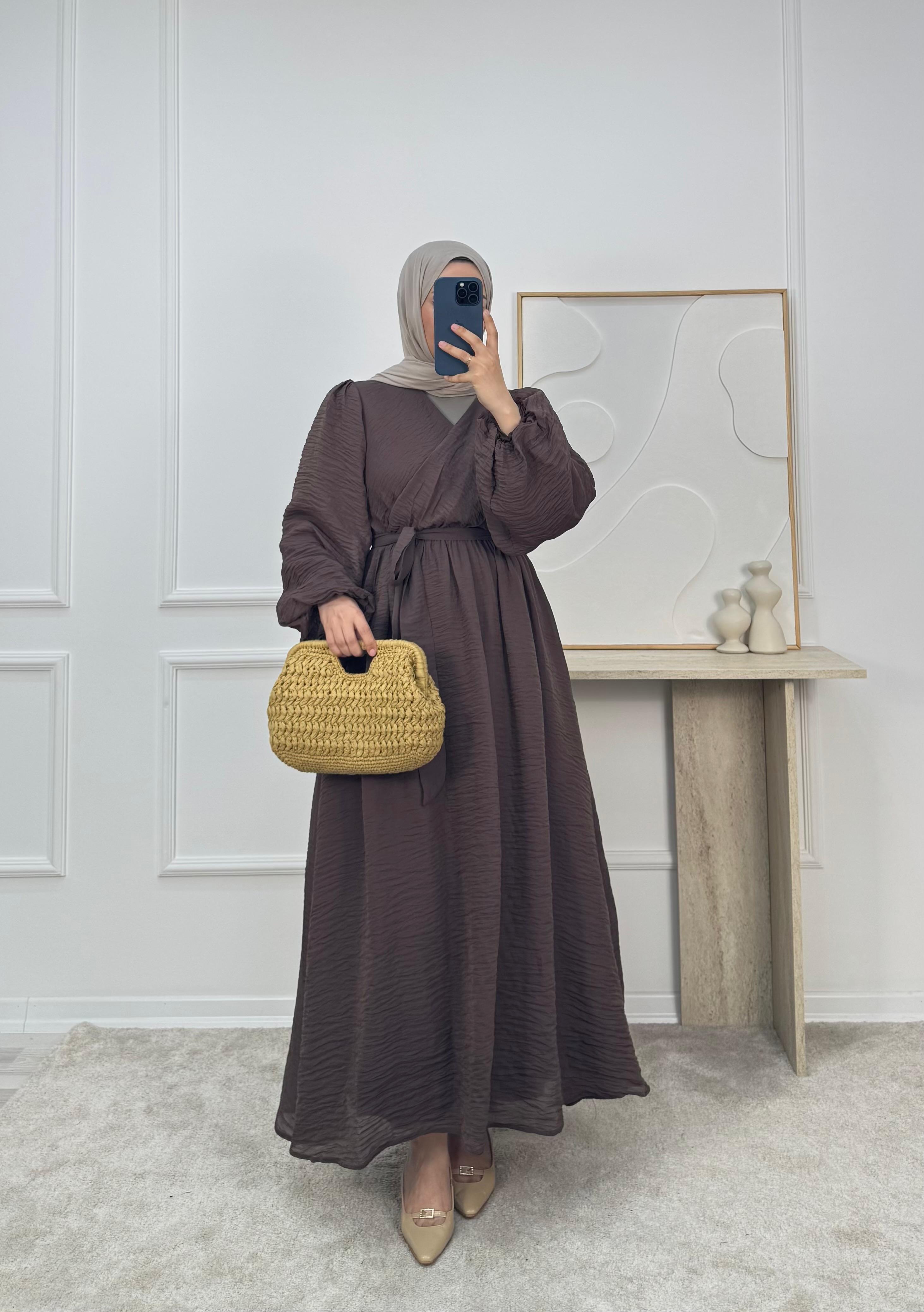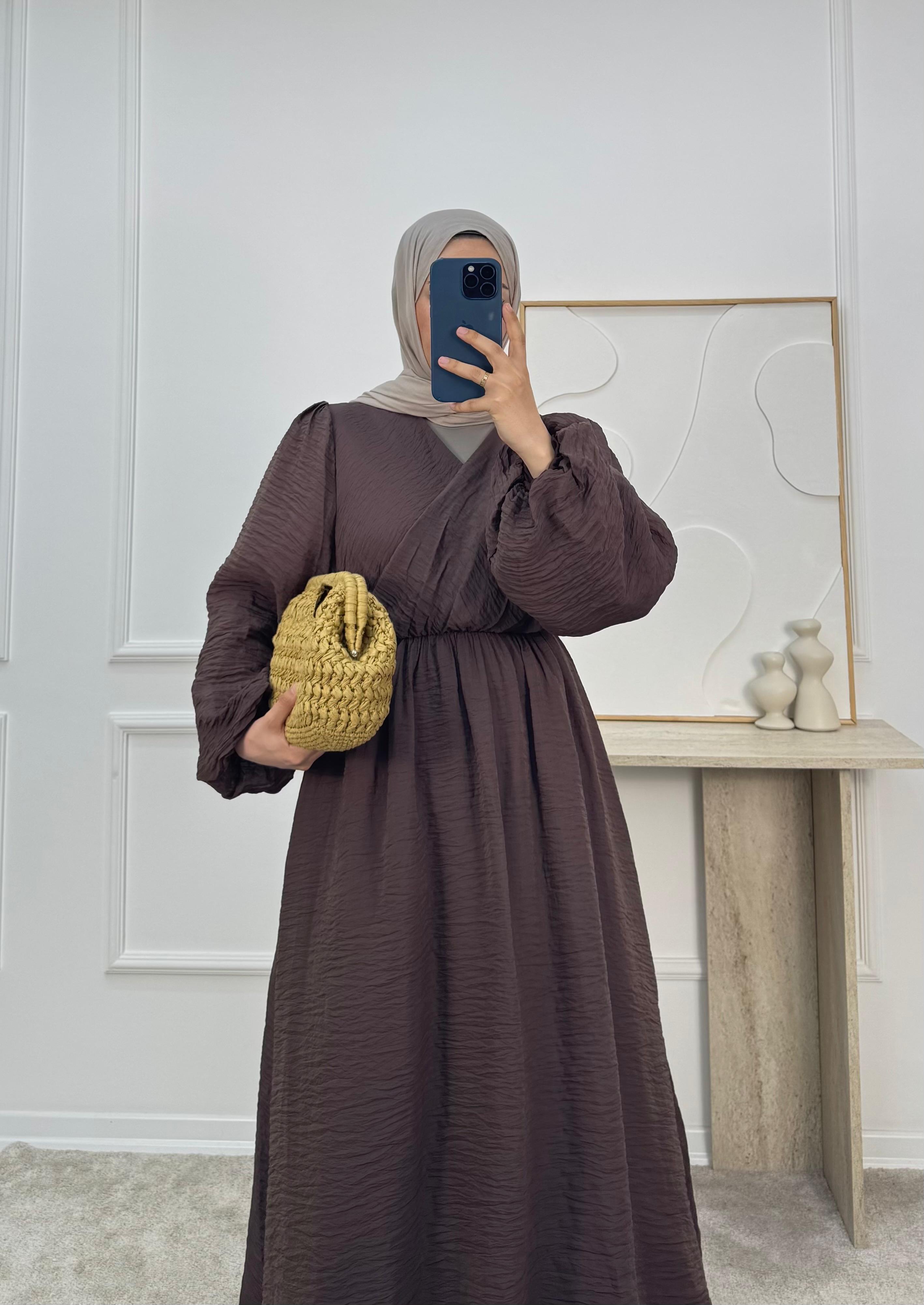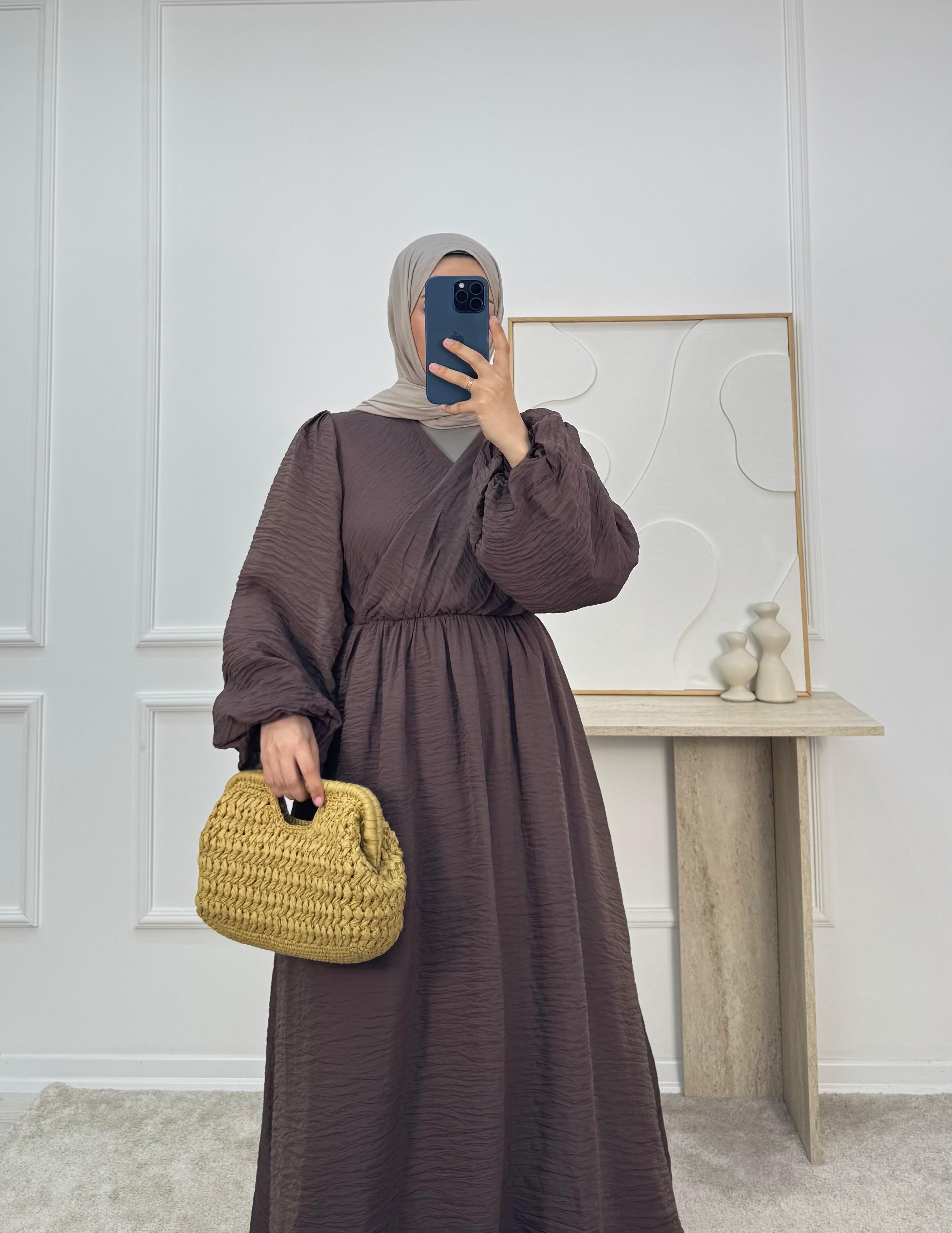 0937-organze kumaş lastikli önü çapraz elbise-kahve (0937)