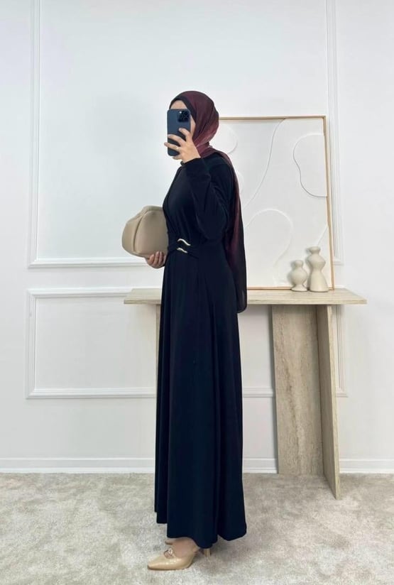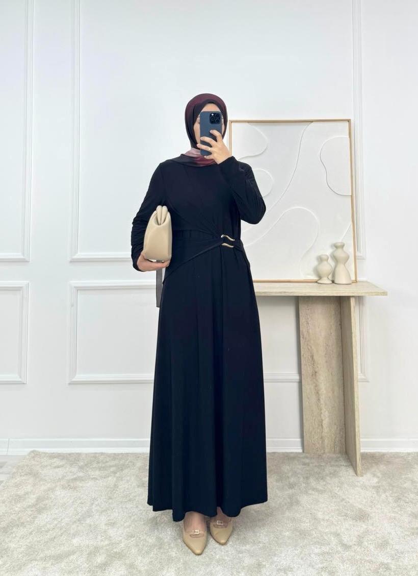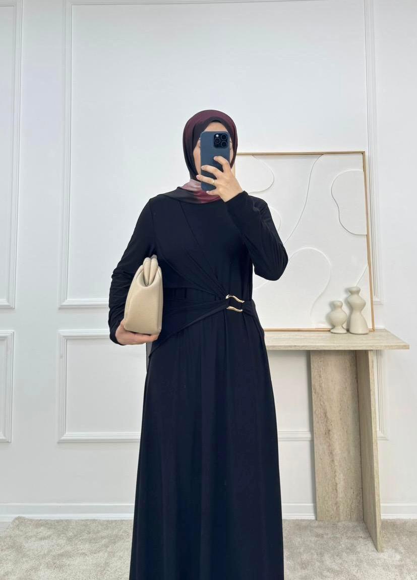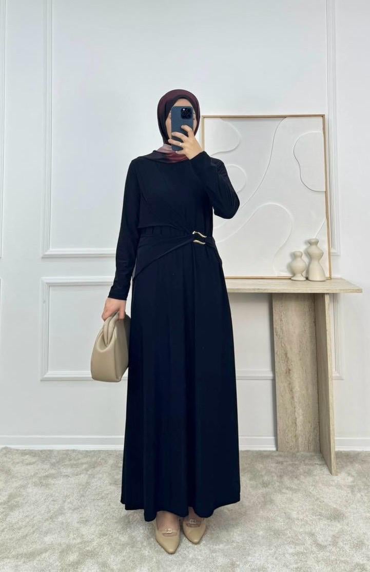 1002-sandy kumaş önü tokalı büzgülü elbise-siyah (1002)
