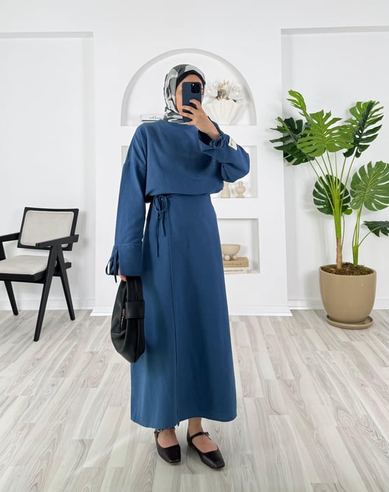 1013-keten kumaş-kolları ipli tek kolu etiket detaylı etekli takım-mavi (1013)