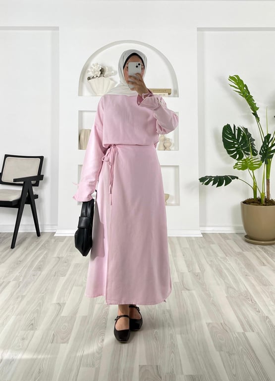 1013-keten kumaş-kolları ipli tek kolu etiket detaylı etekli takım-pembe (1013)