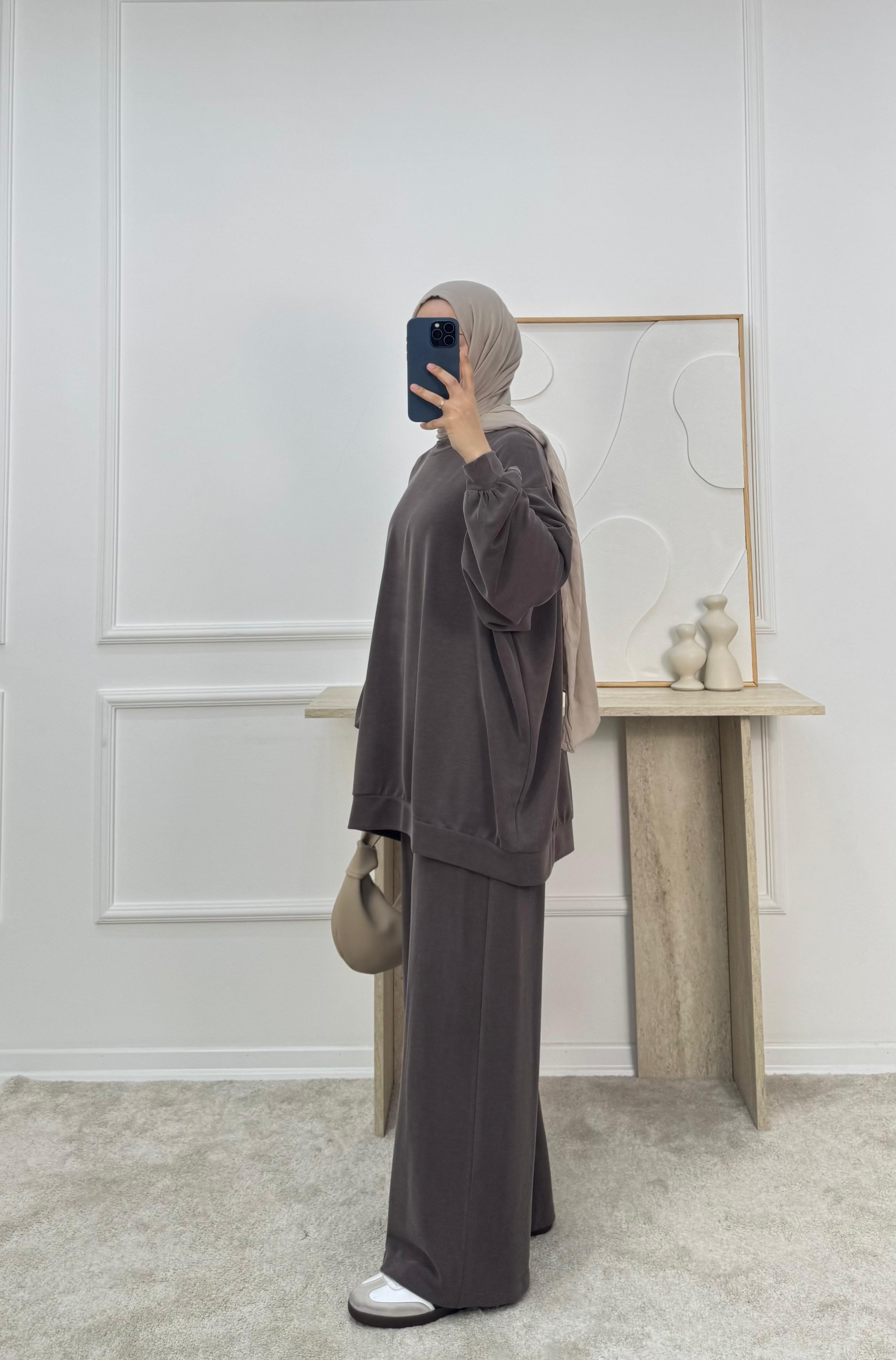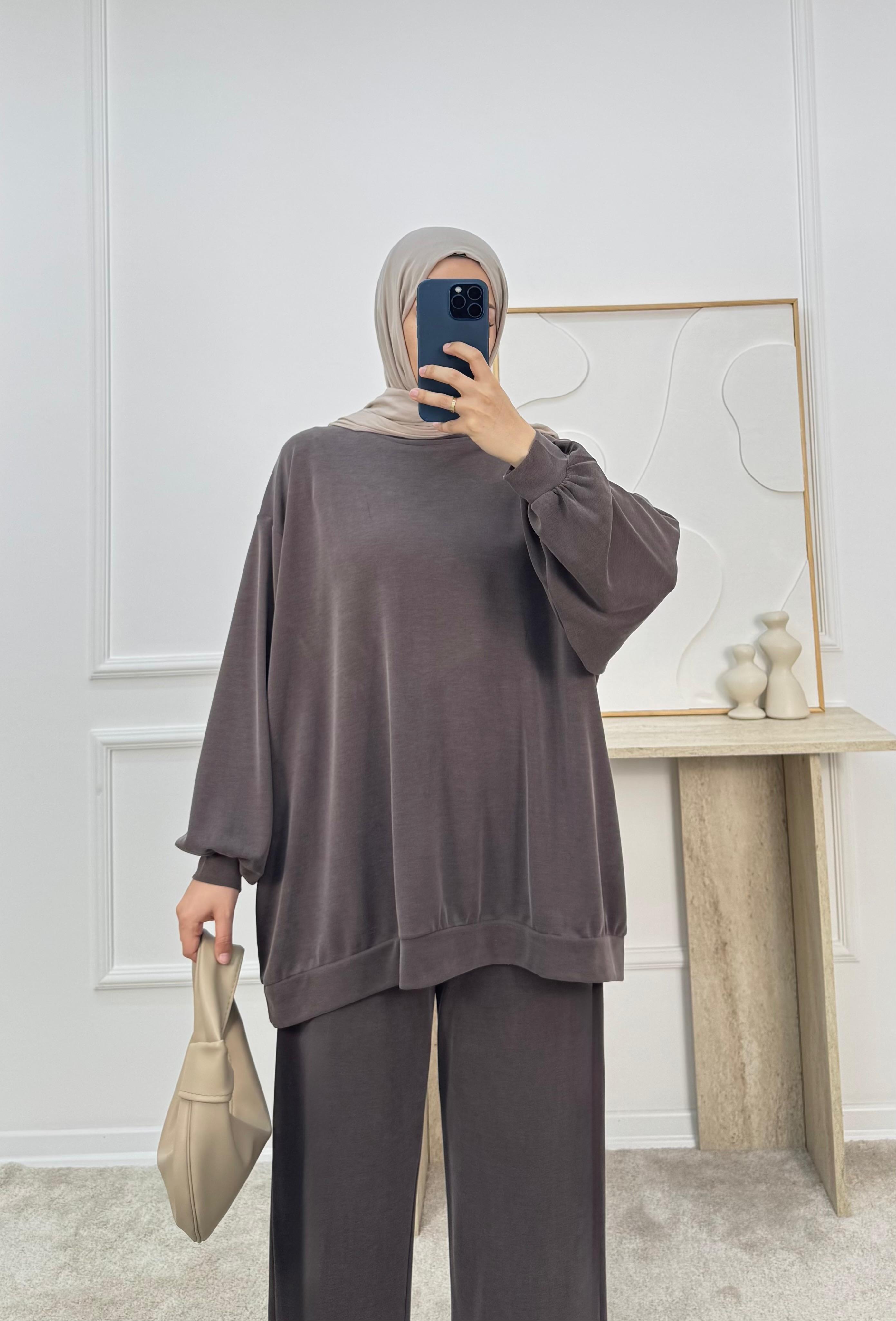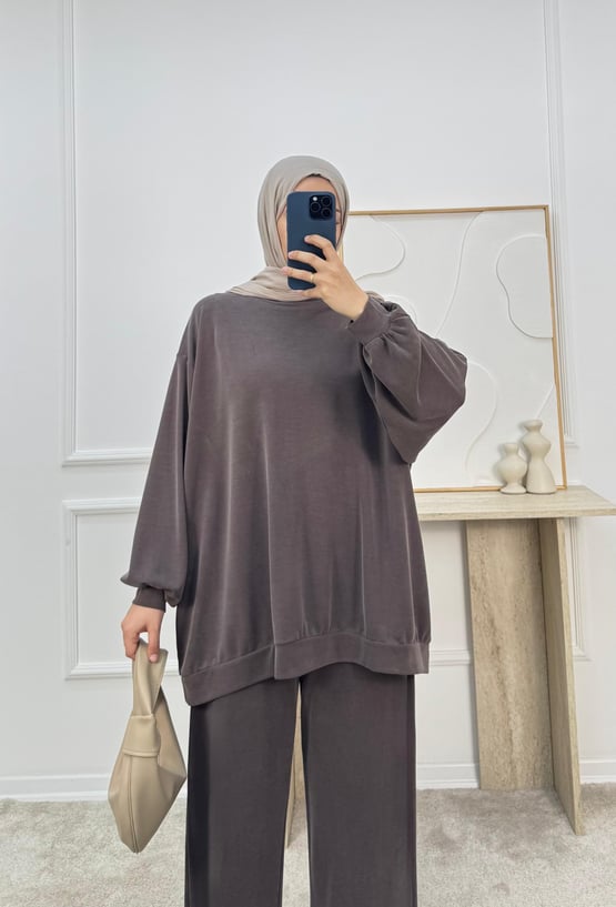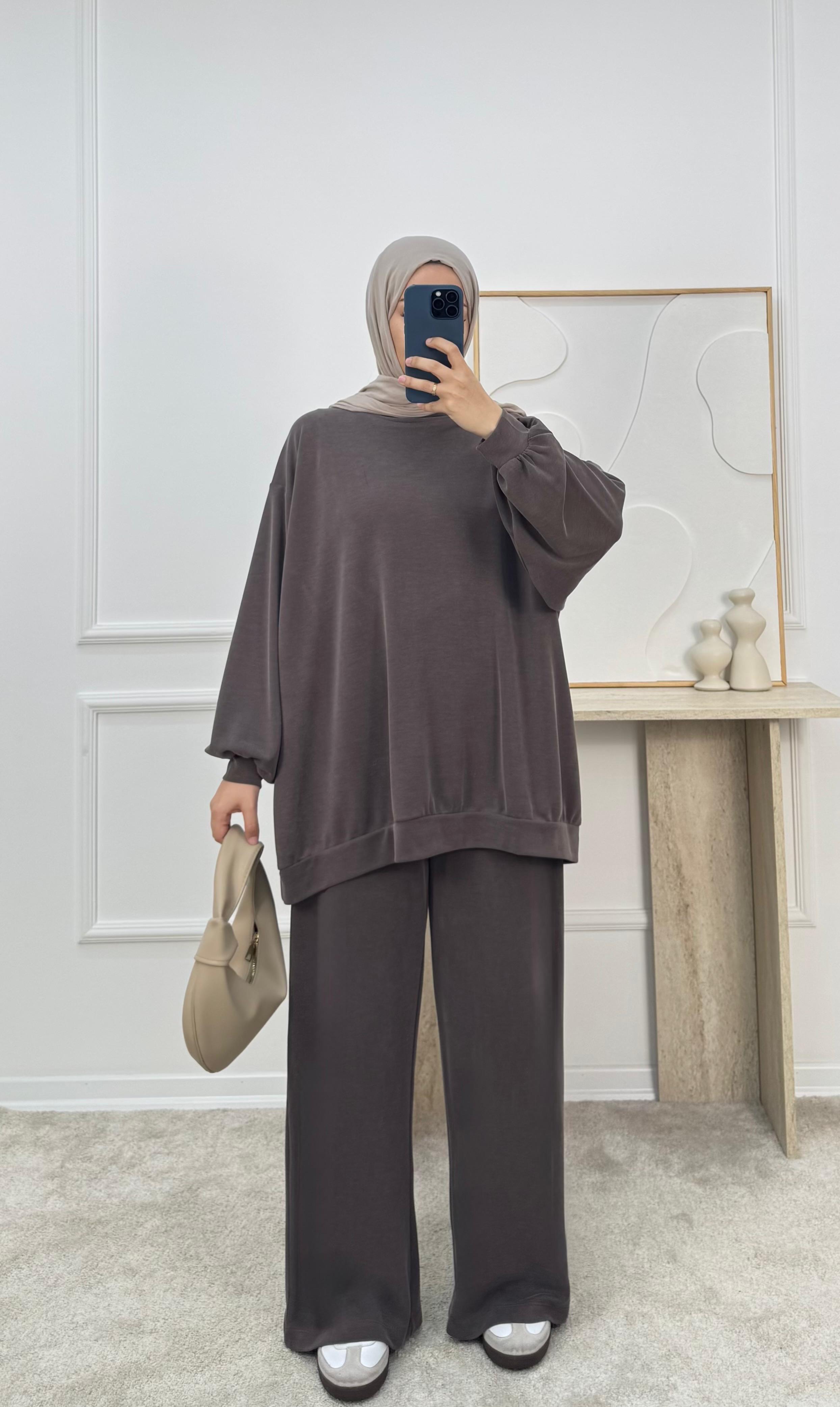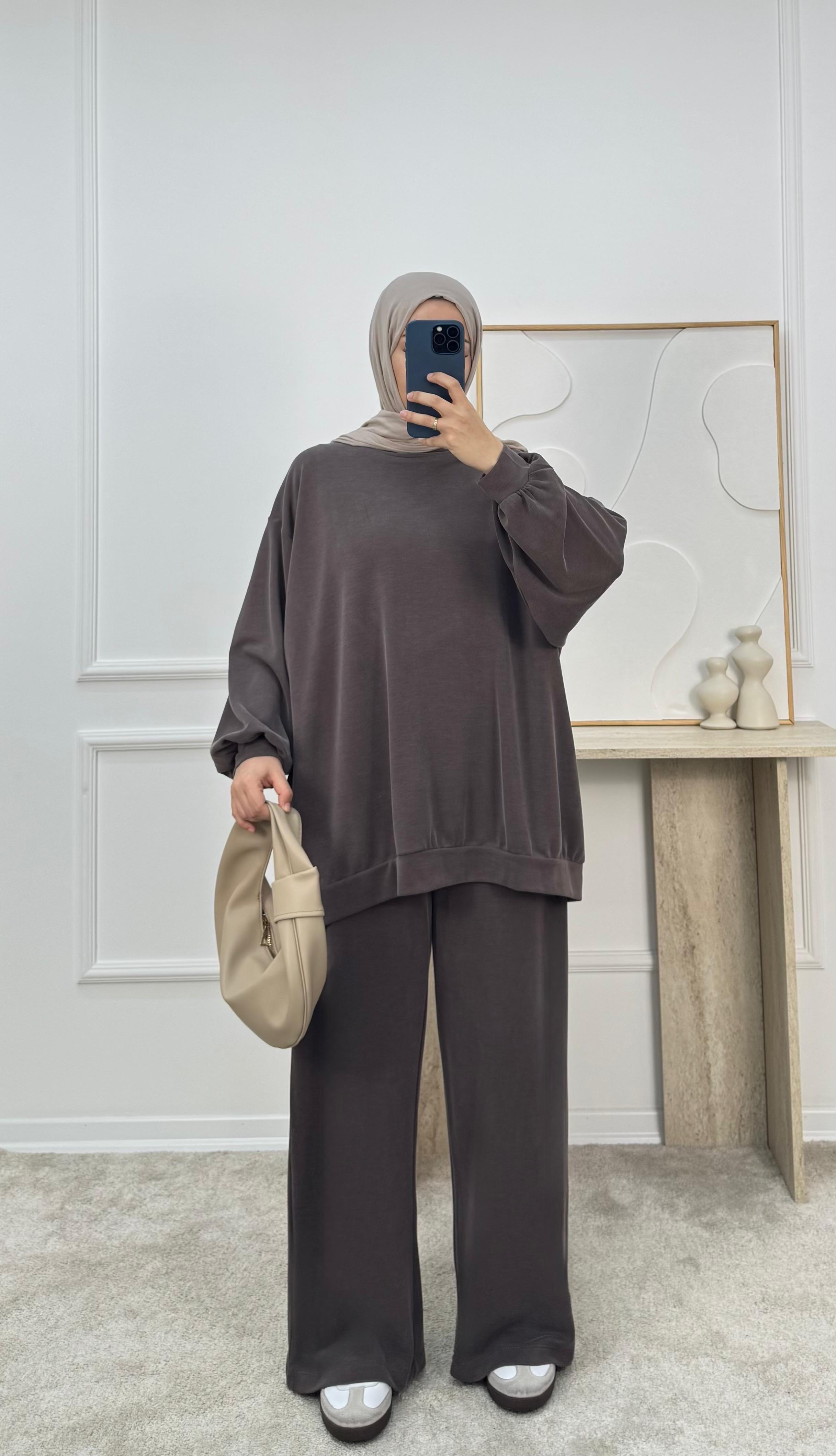 1148-ecem pike kumaş oversize pantolonlu takım-acı kahve (1148)