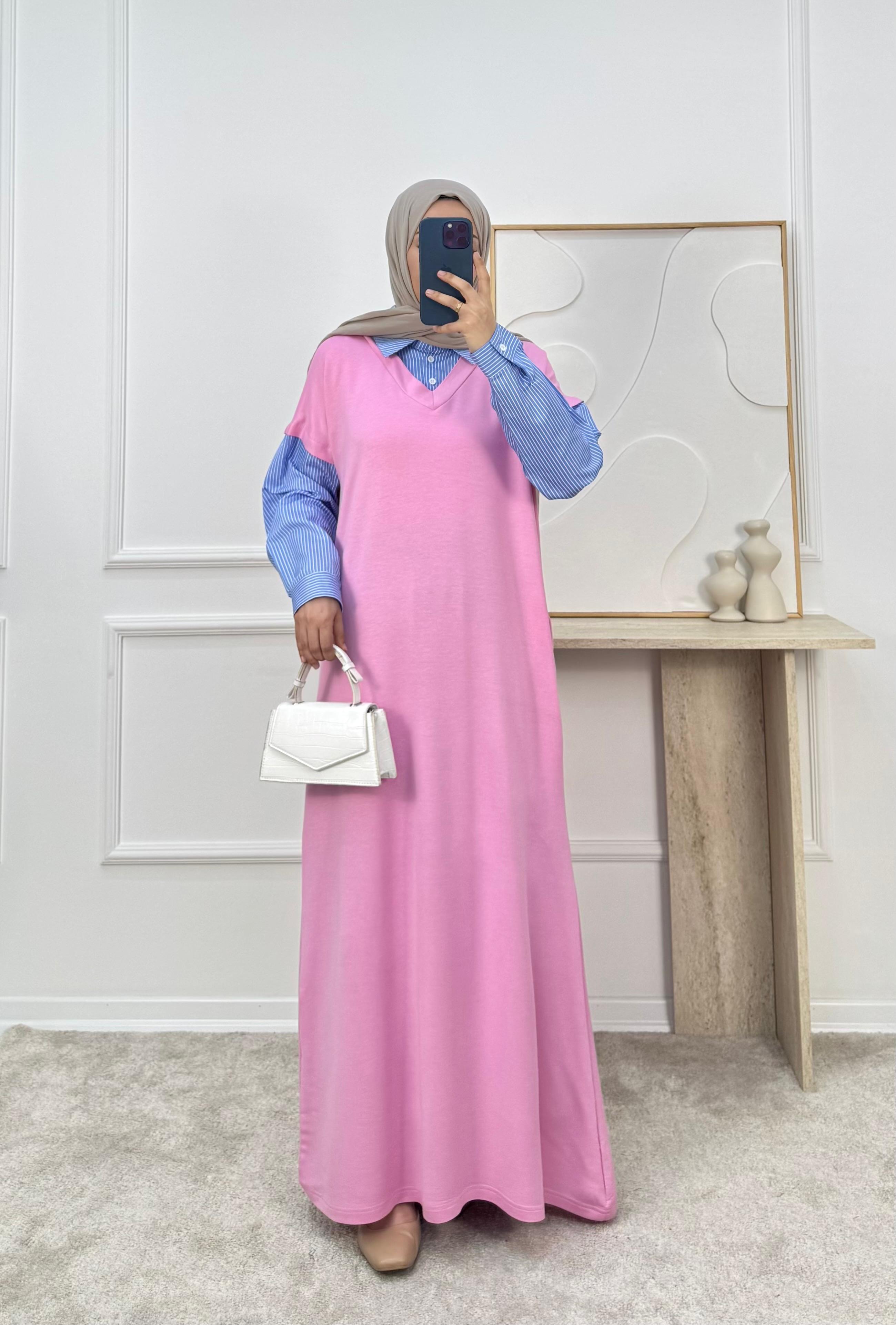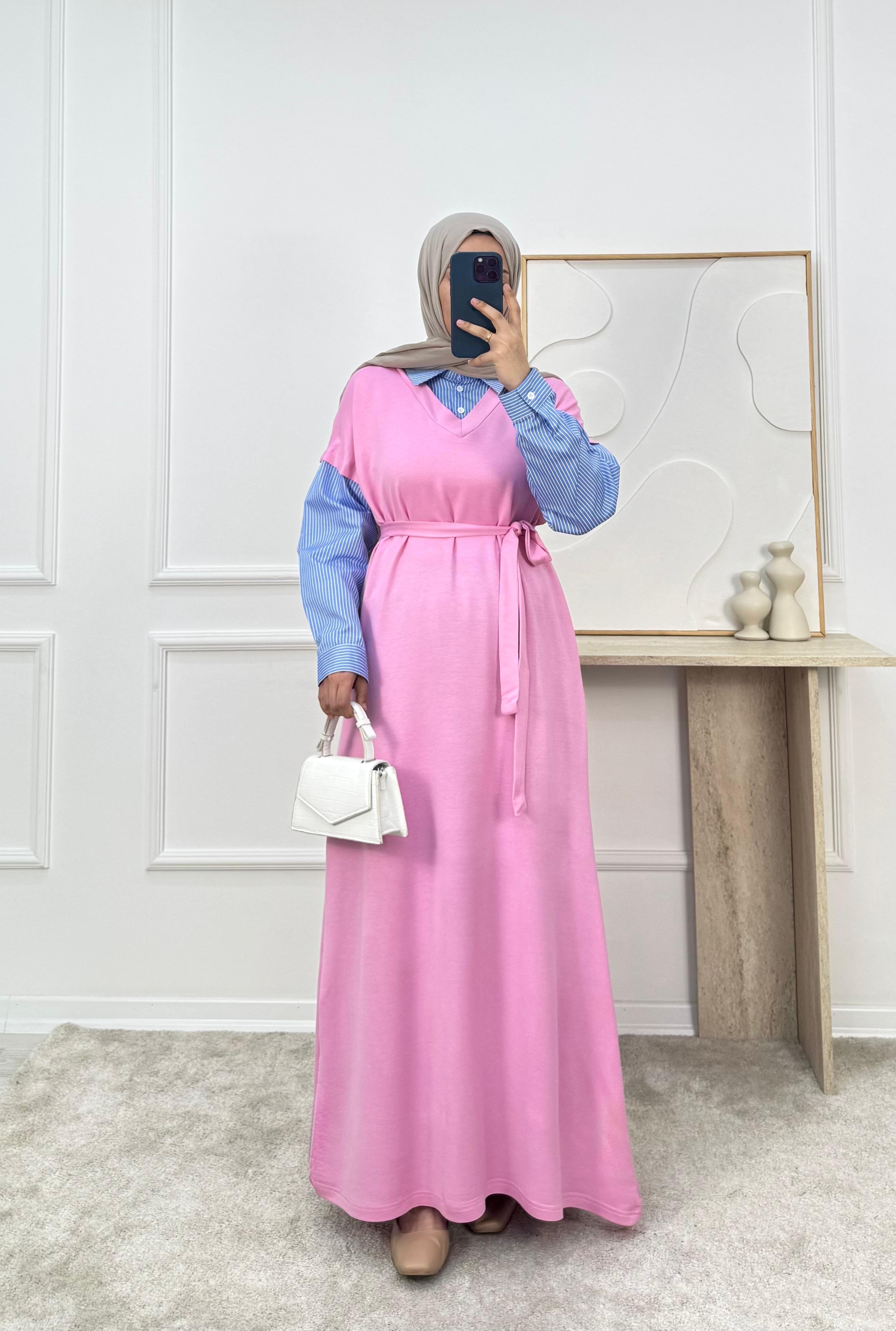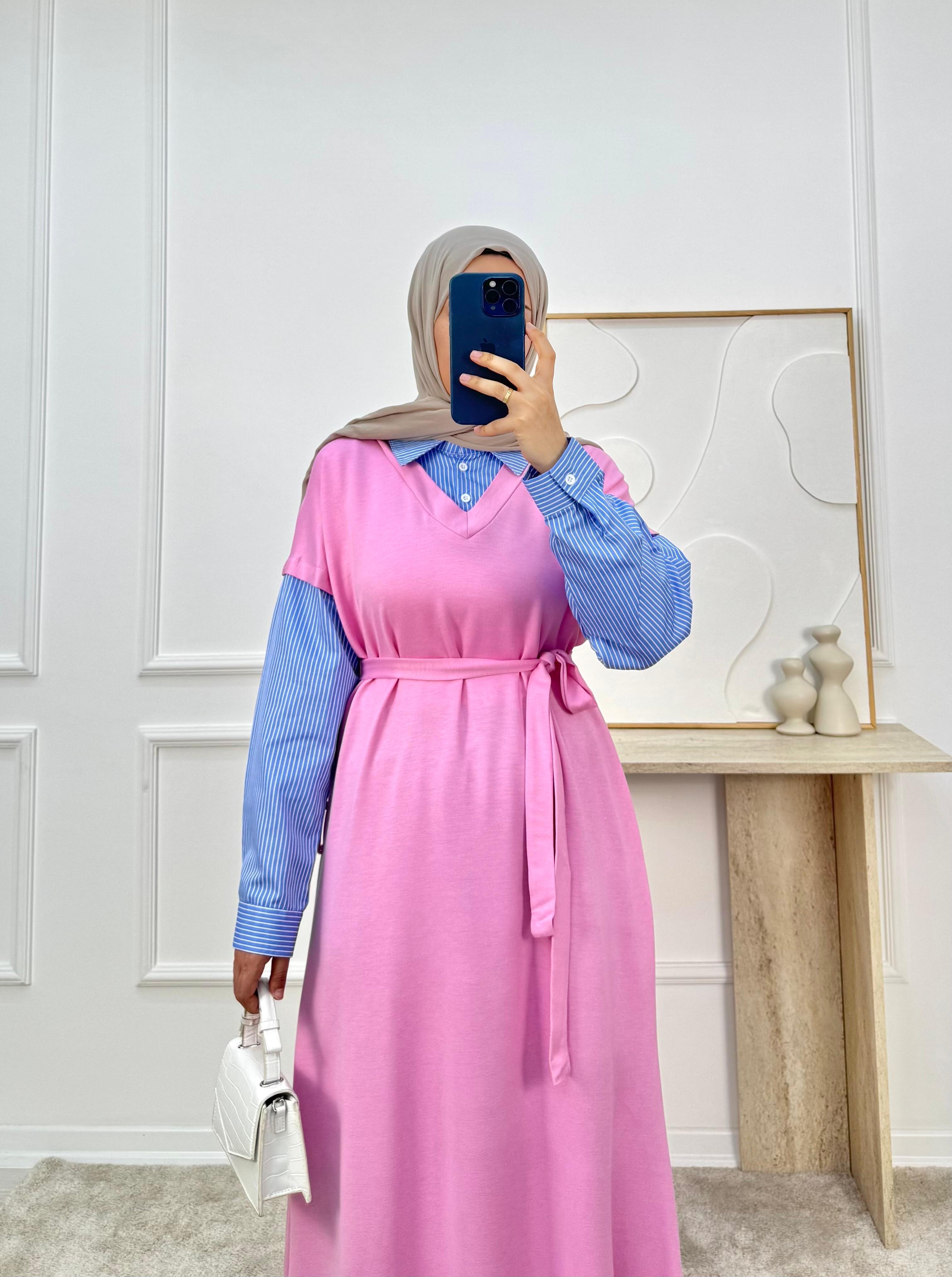 1184-kristal kumaş gömlek yaka kuşaklı elbise-pembe (1184)