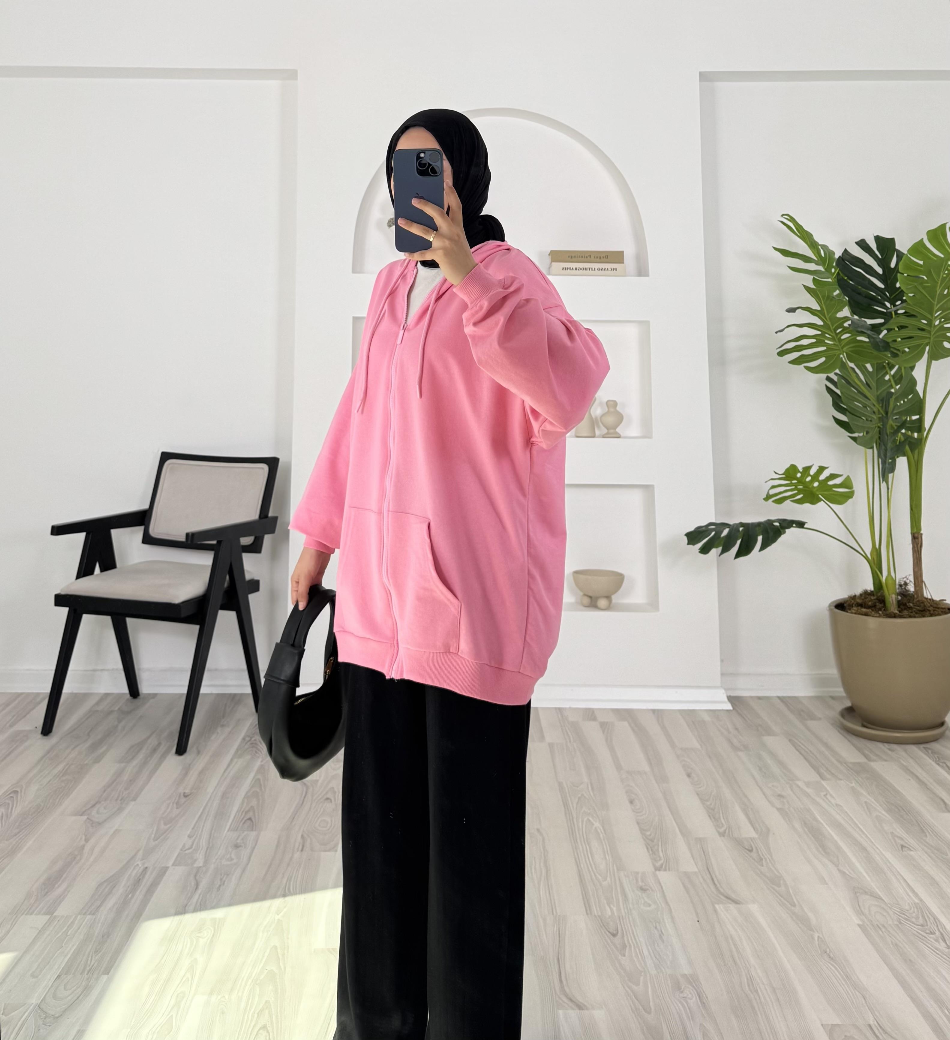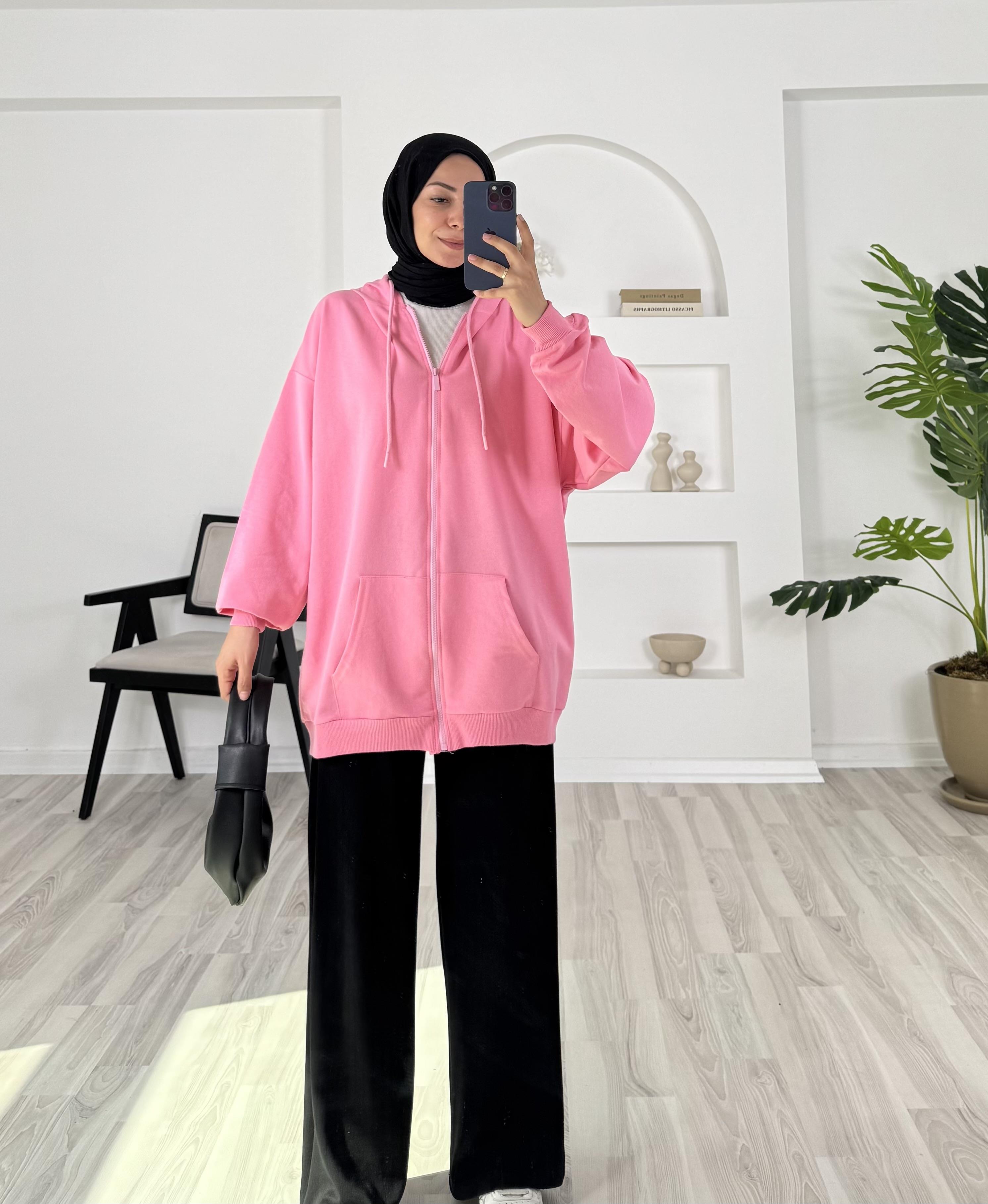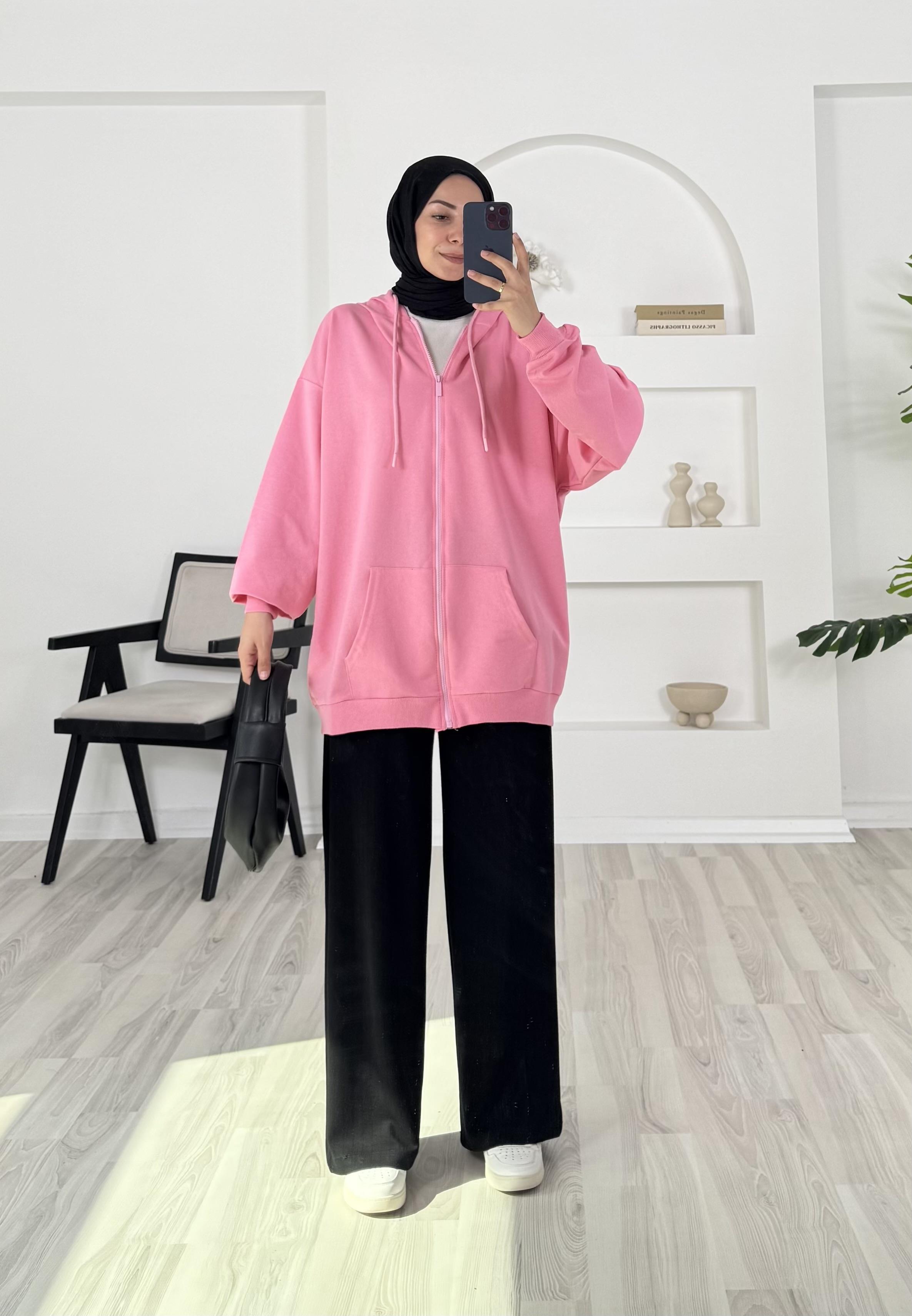 13028 - iki iplik kumaş kapşonlu fermuarlı hırka - pembe (13028)