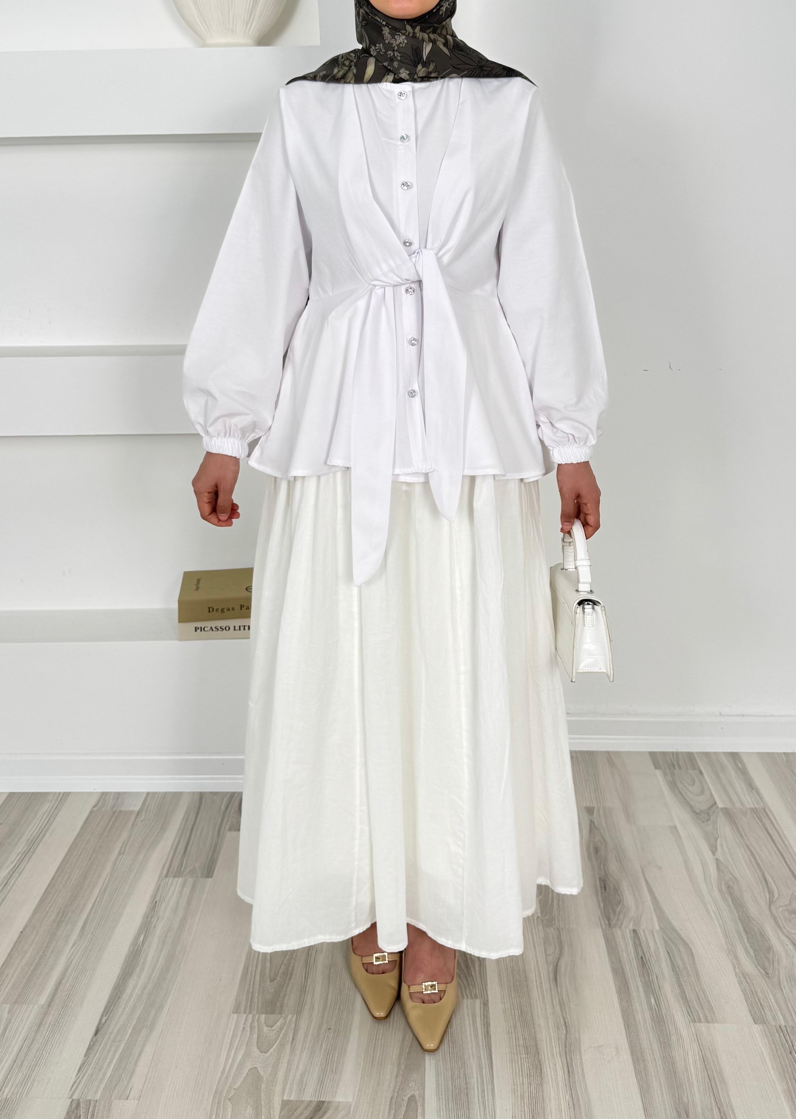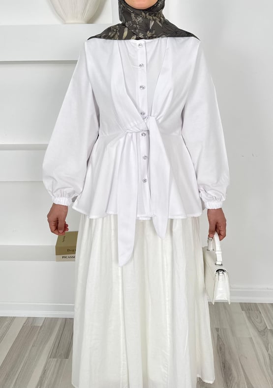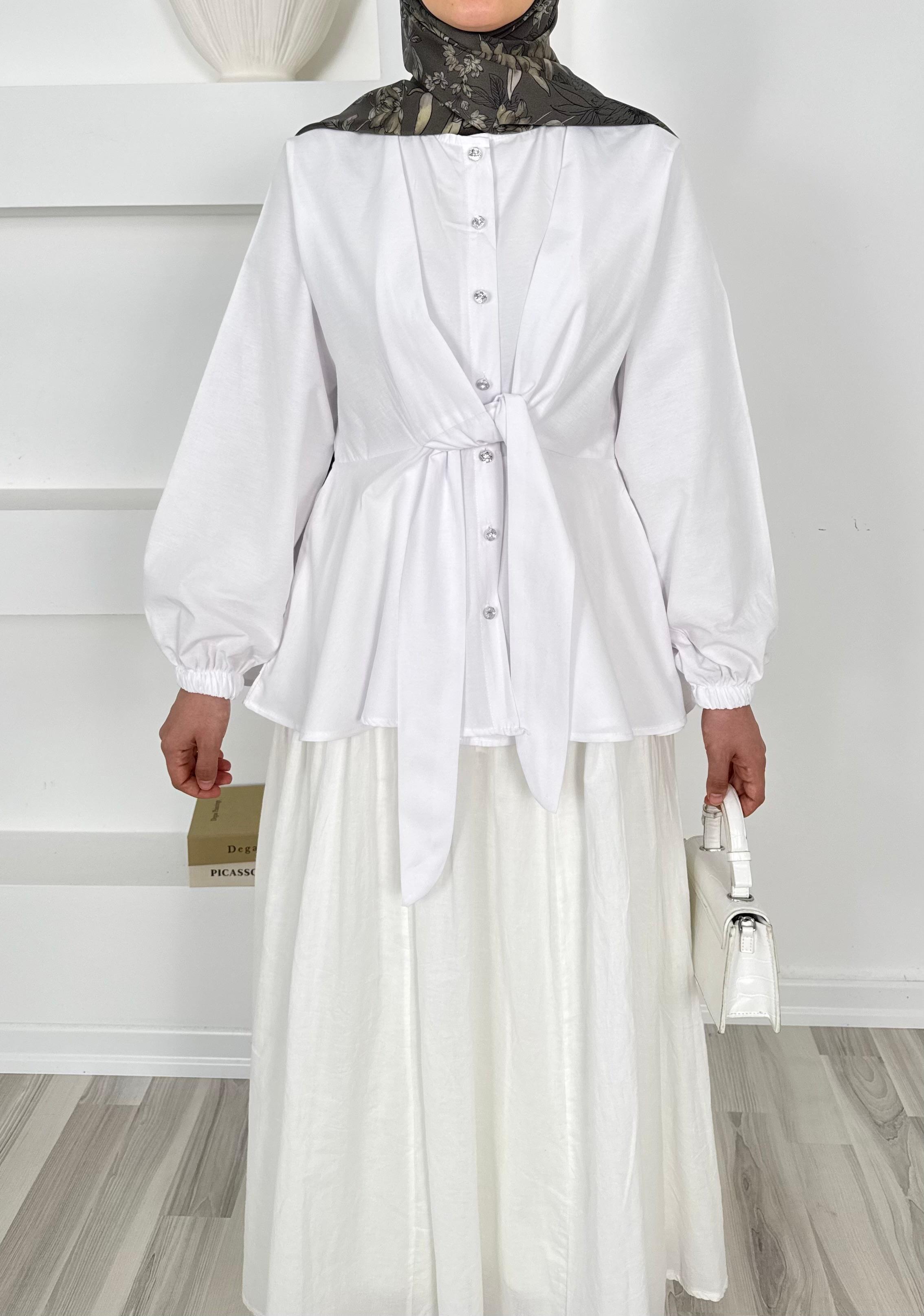 1342-poplin kumaş önden bağlamalı düğmeli tunik-beyaz (1342)