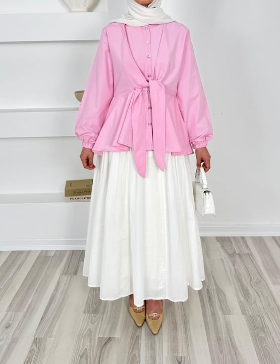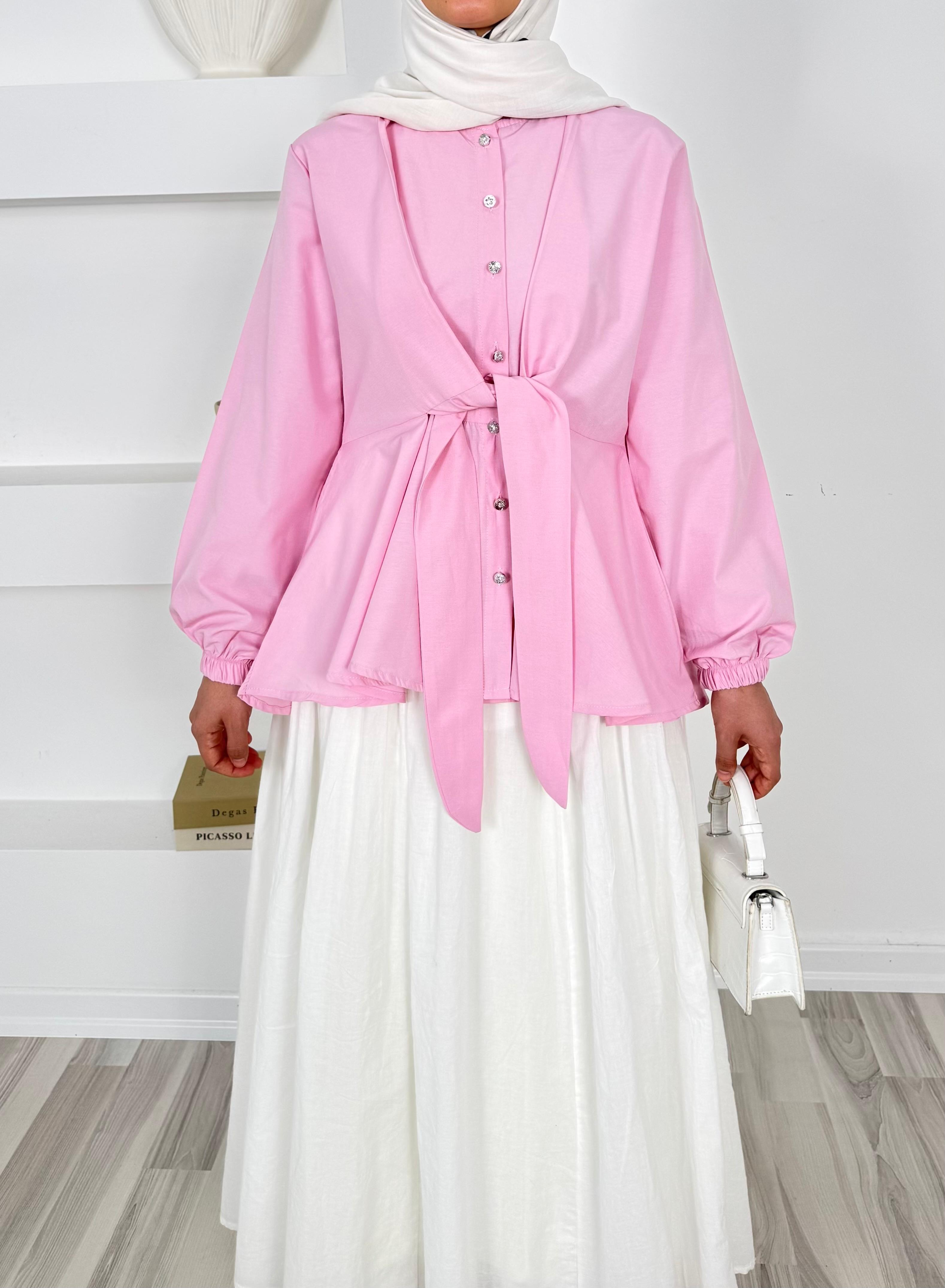 1342-poplin kumaş önden bağlamalı düğmeli tunik-pembe (1342)