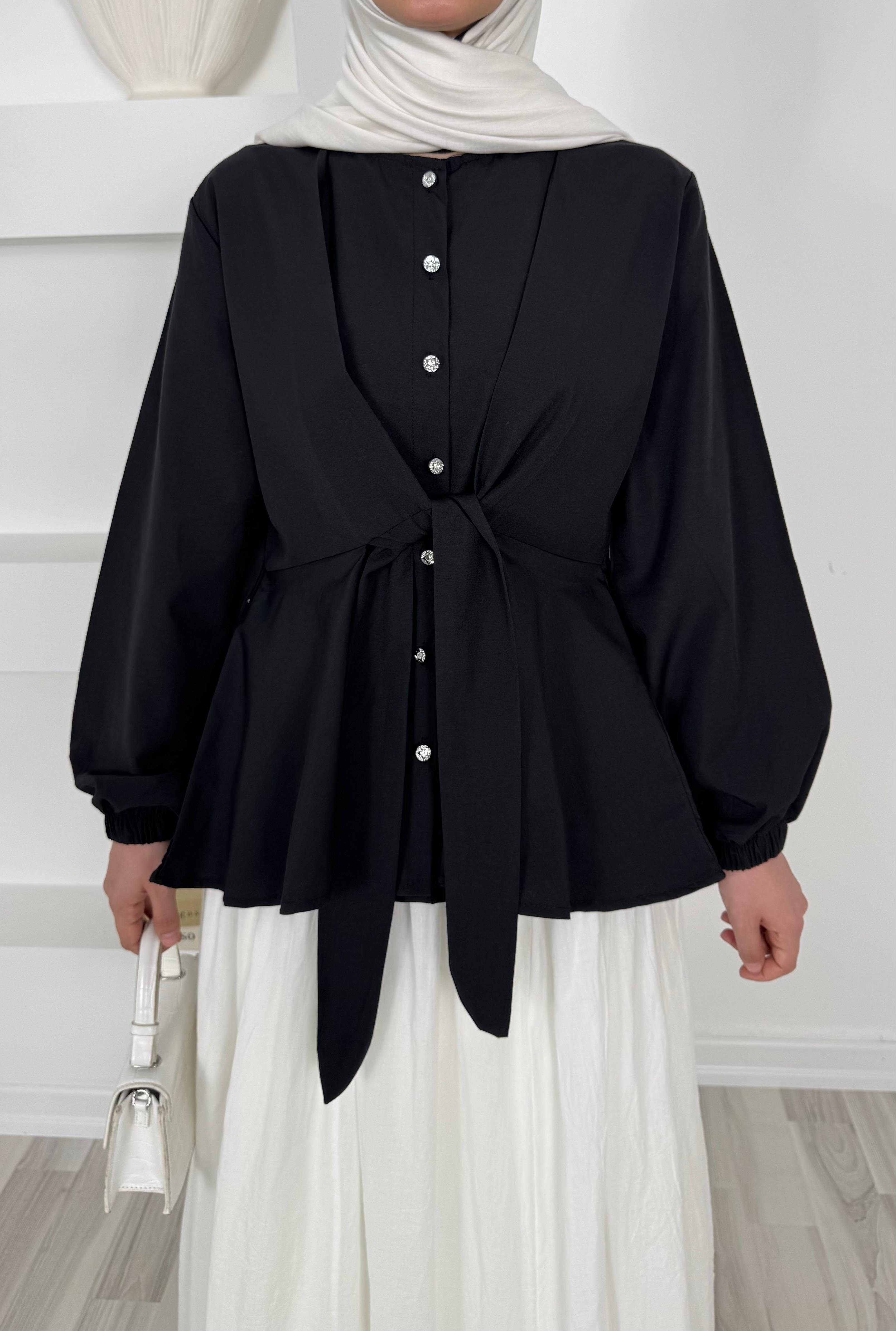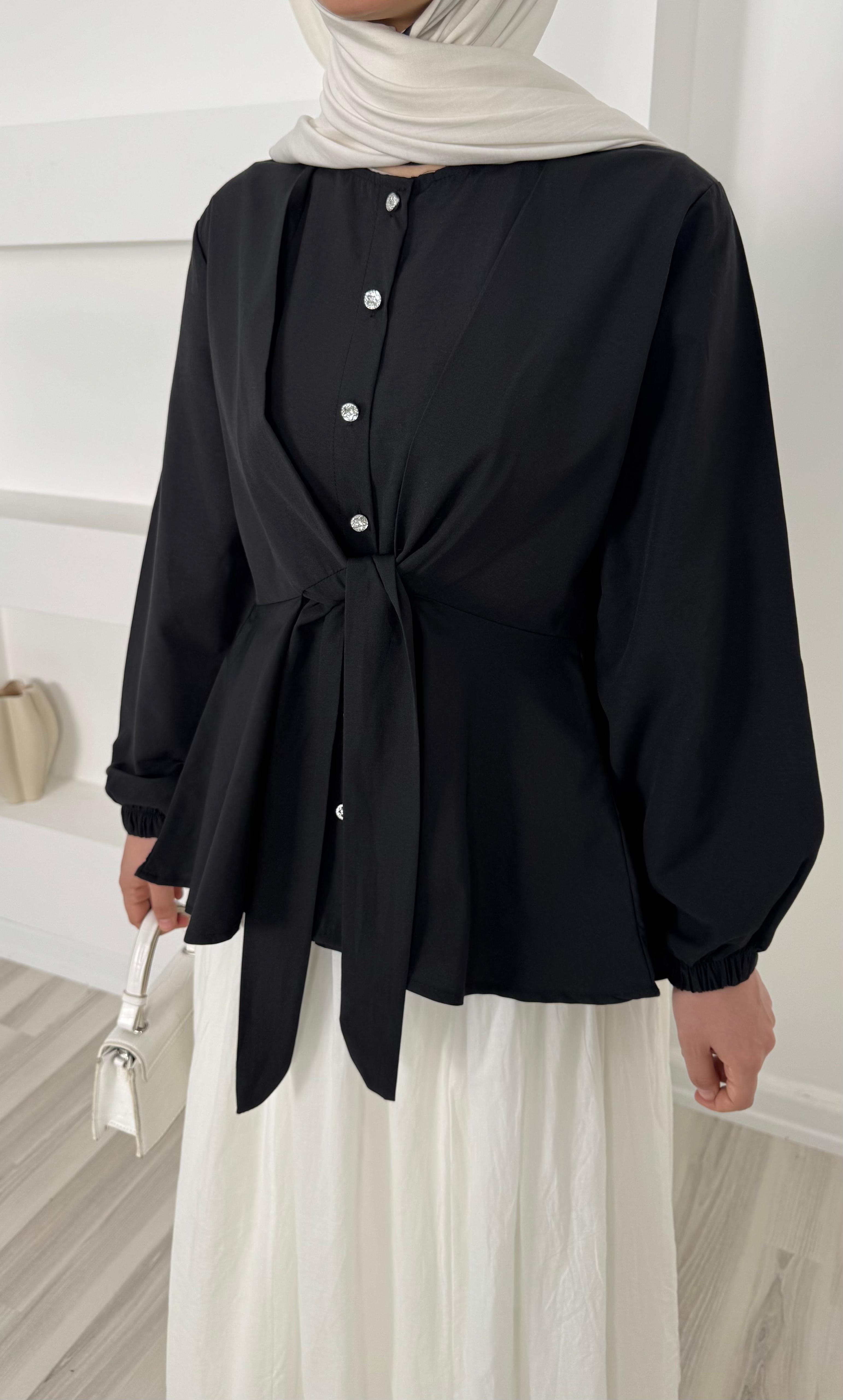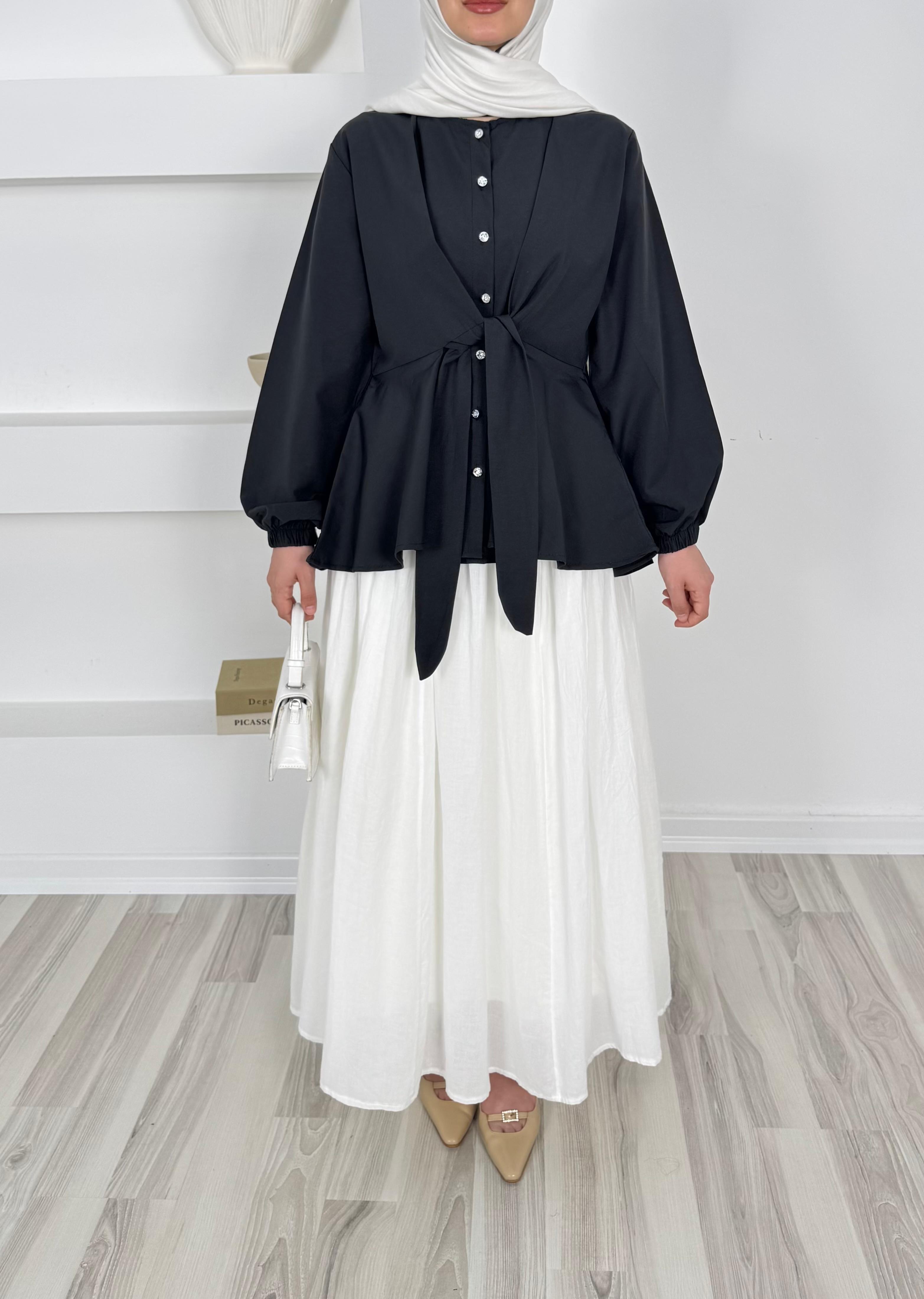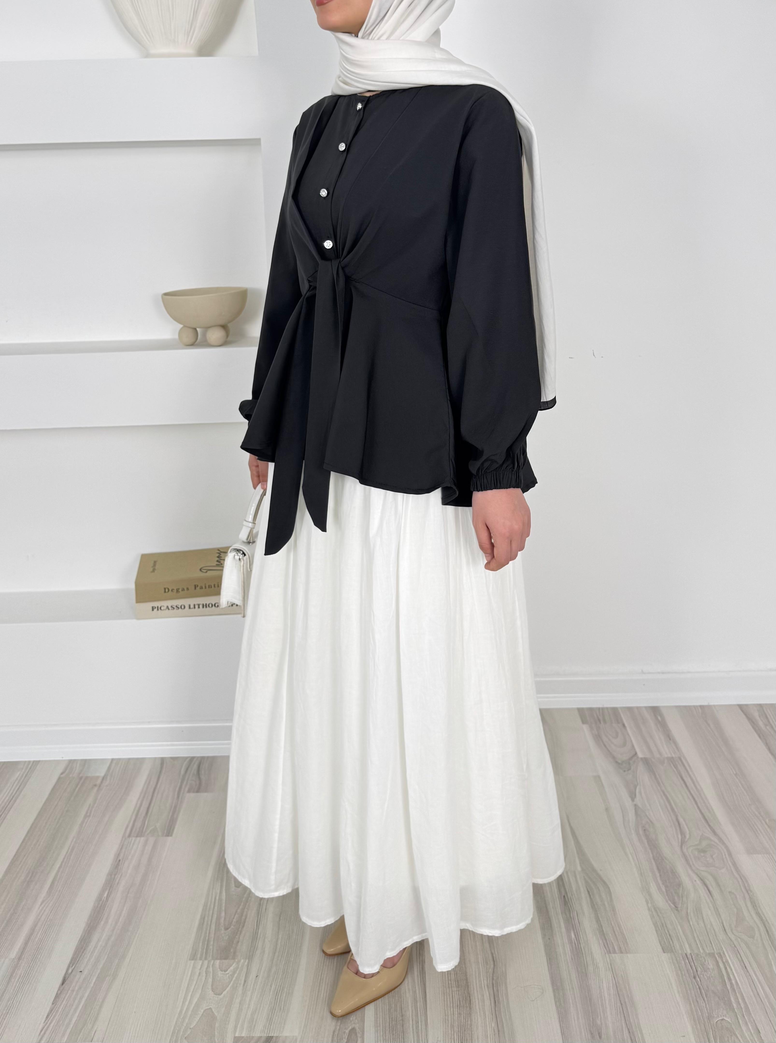 1342-poplin kumaş önden bağlamalı düğmeli tunik-siyah (1342)