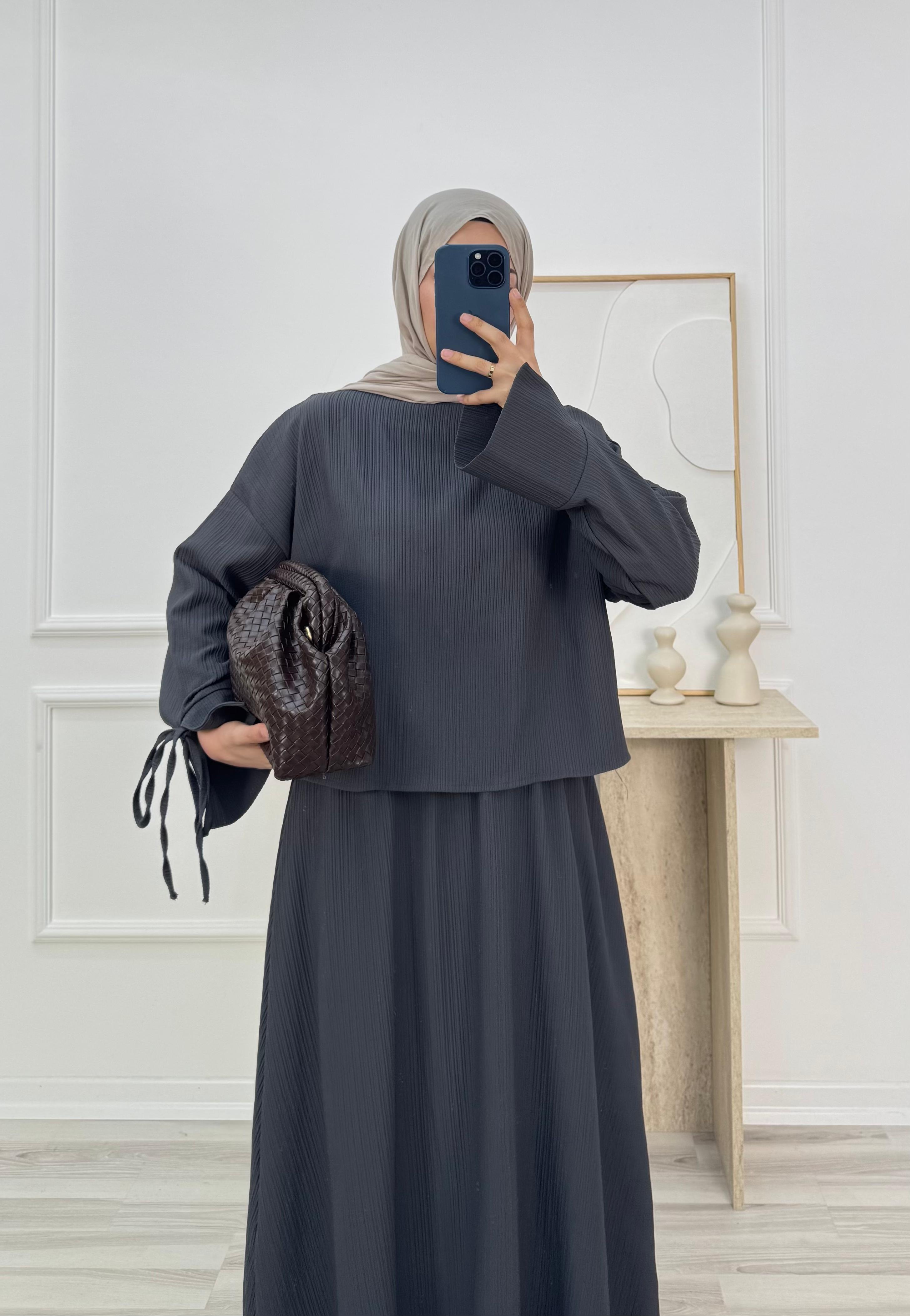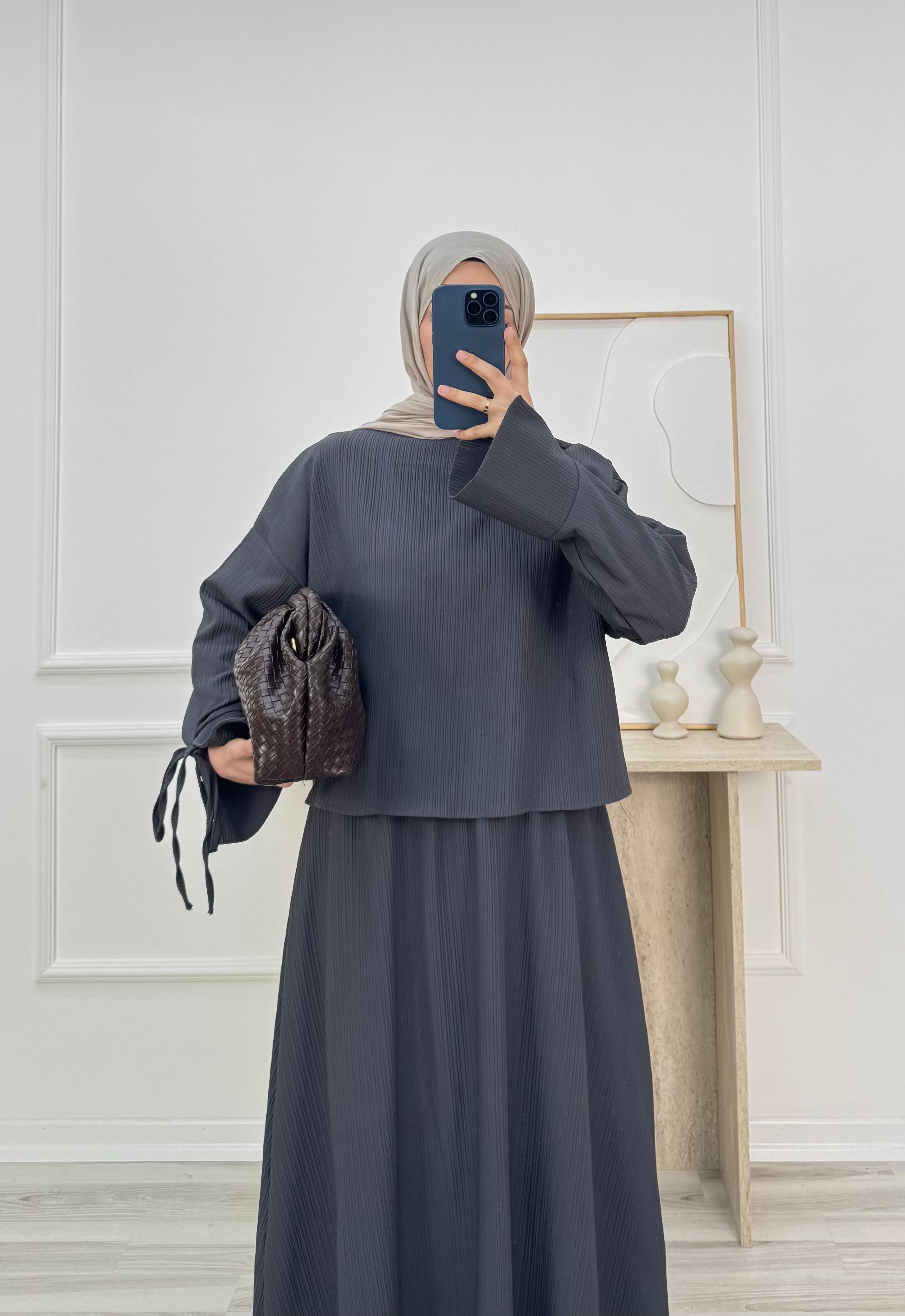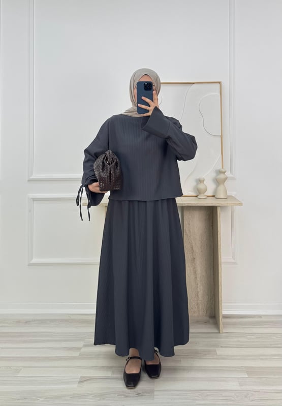 13697 - fitilli helena kumaş kolları manşetli etekli takım - füme (13697)