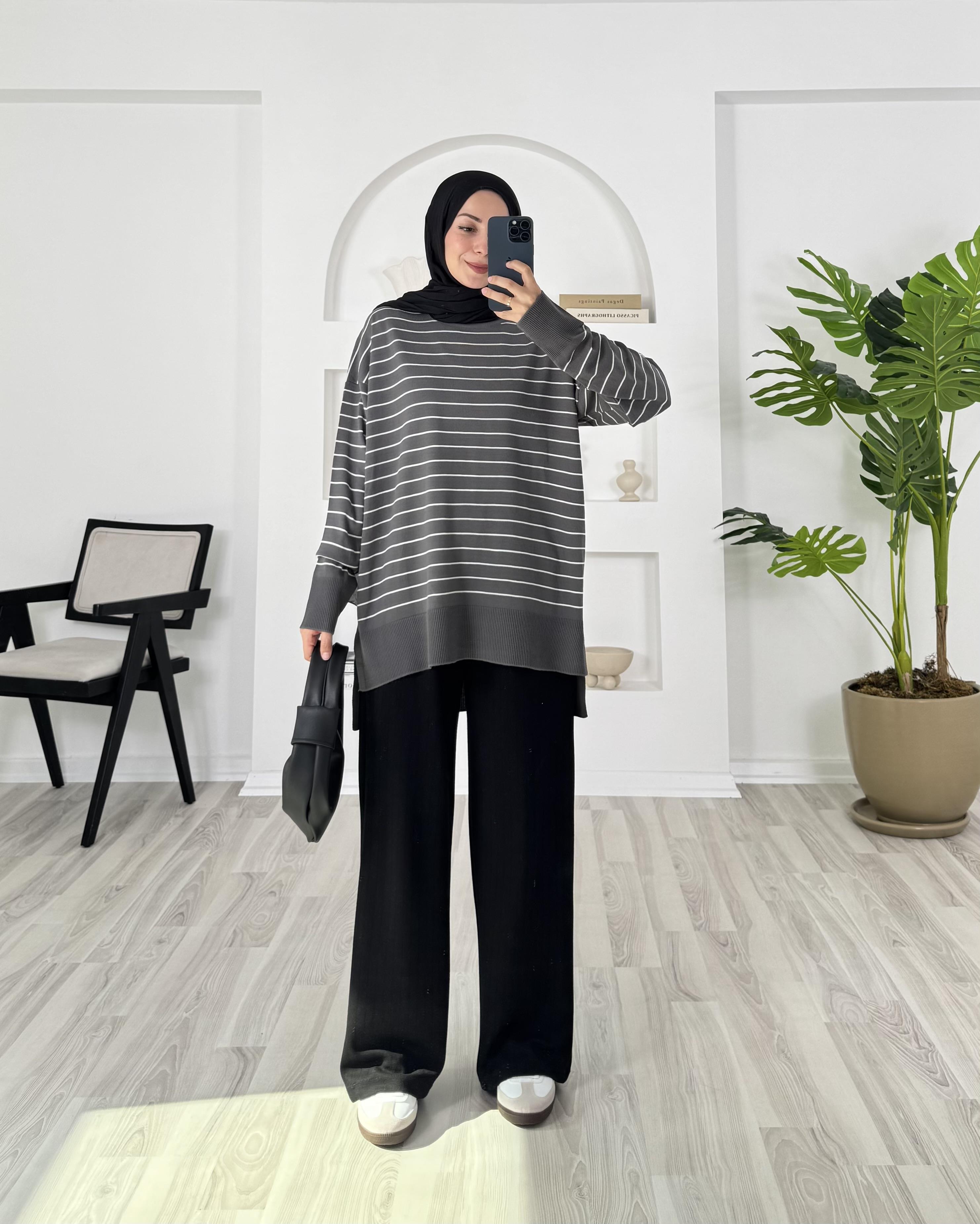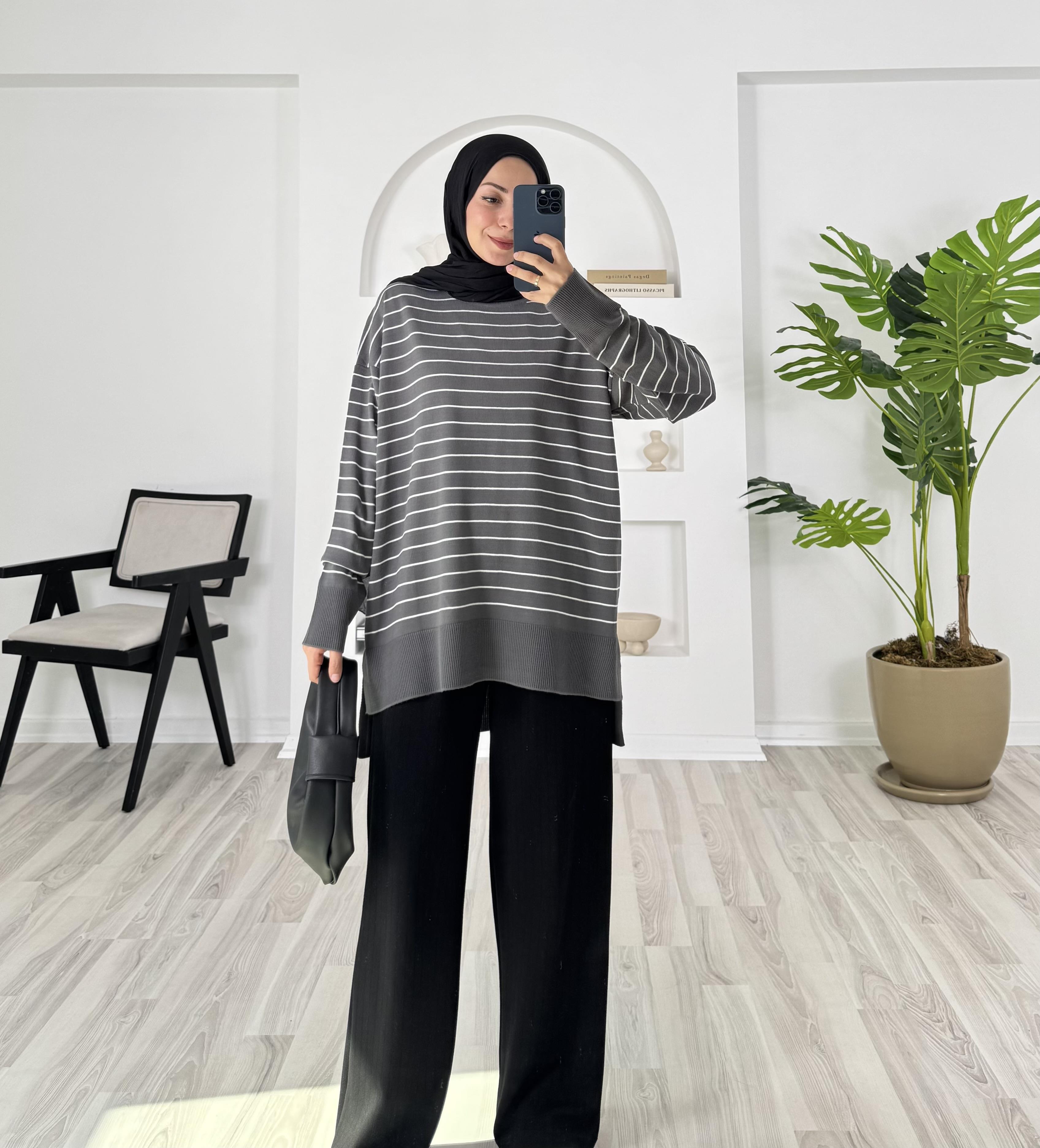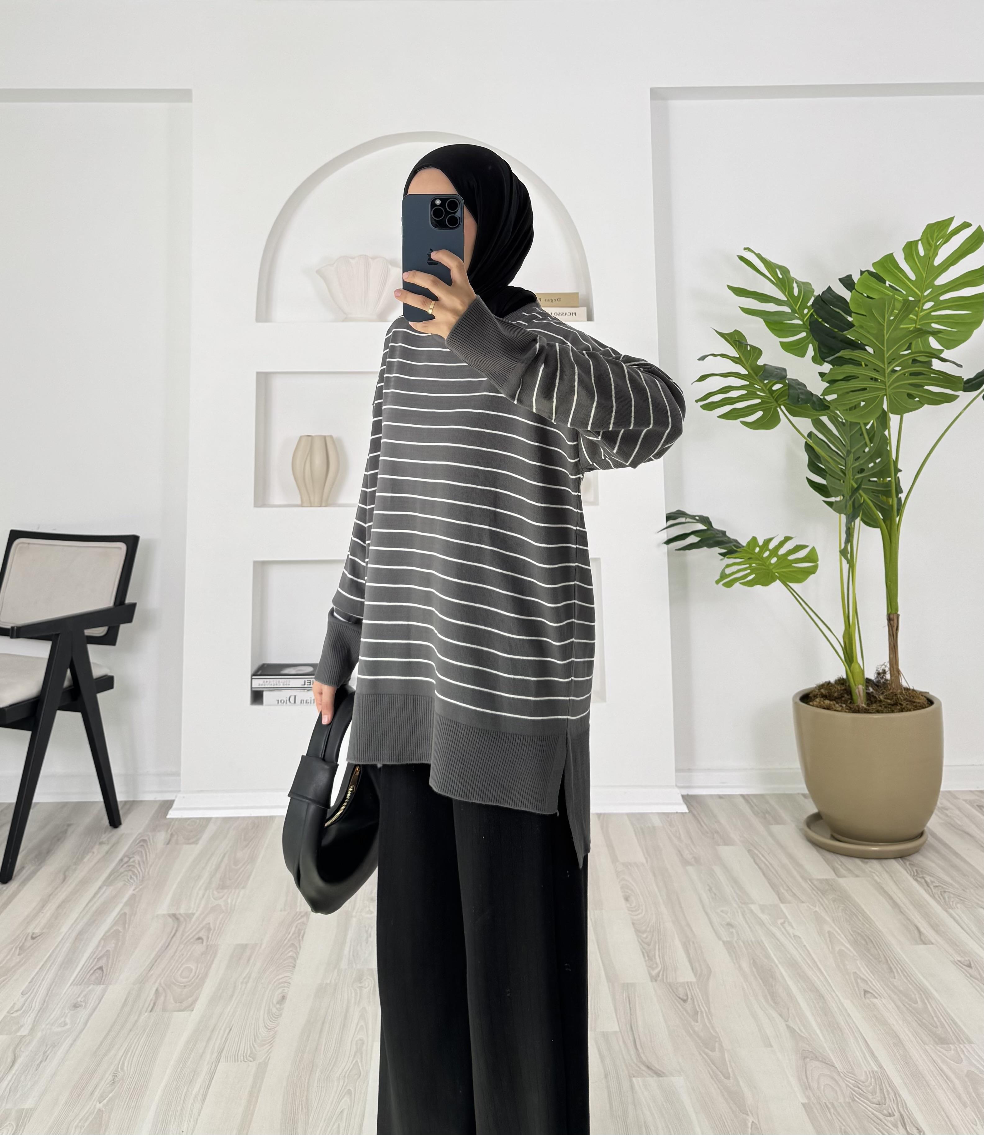 1416-çizgi detaylı yanları yırtmaçlı triko tunik-füme (1416)