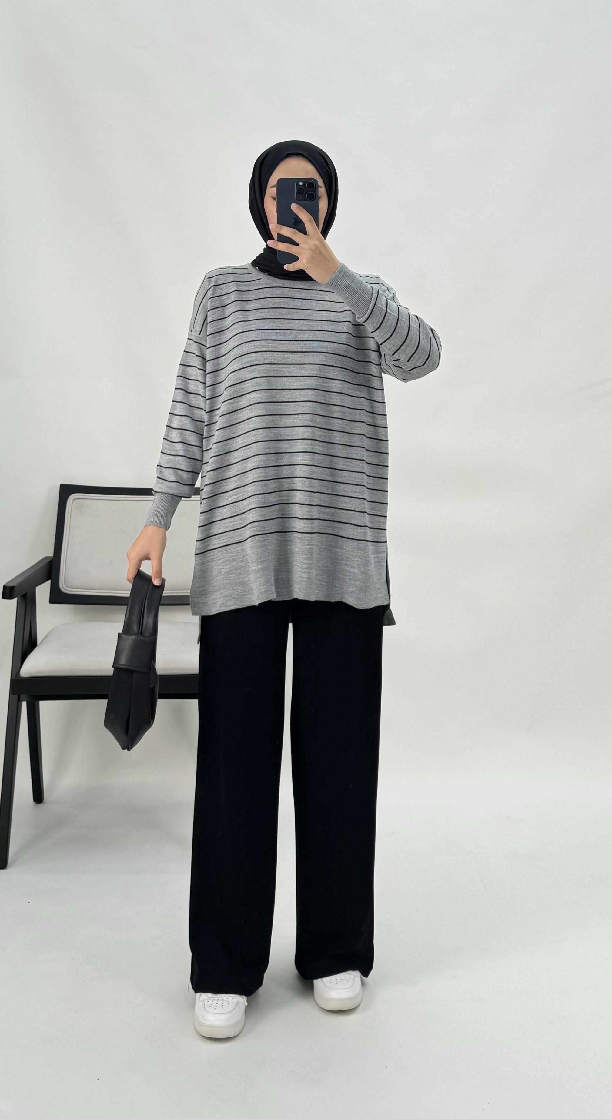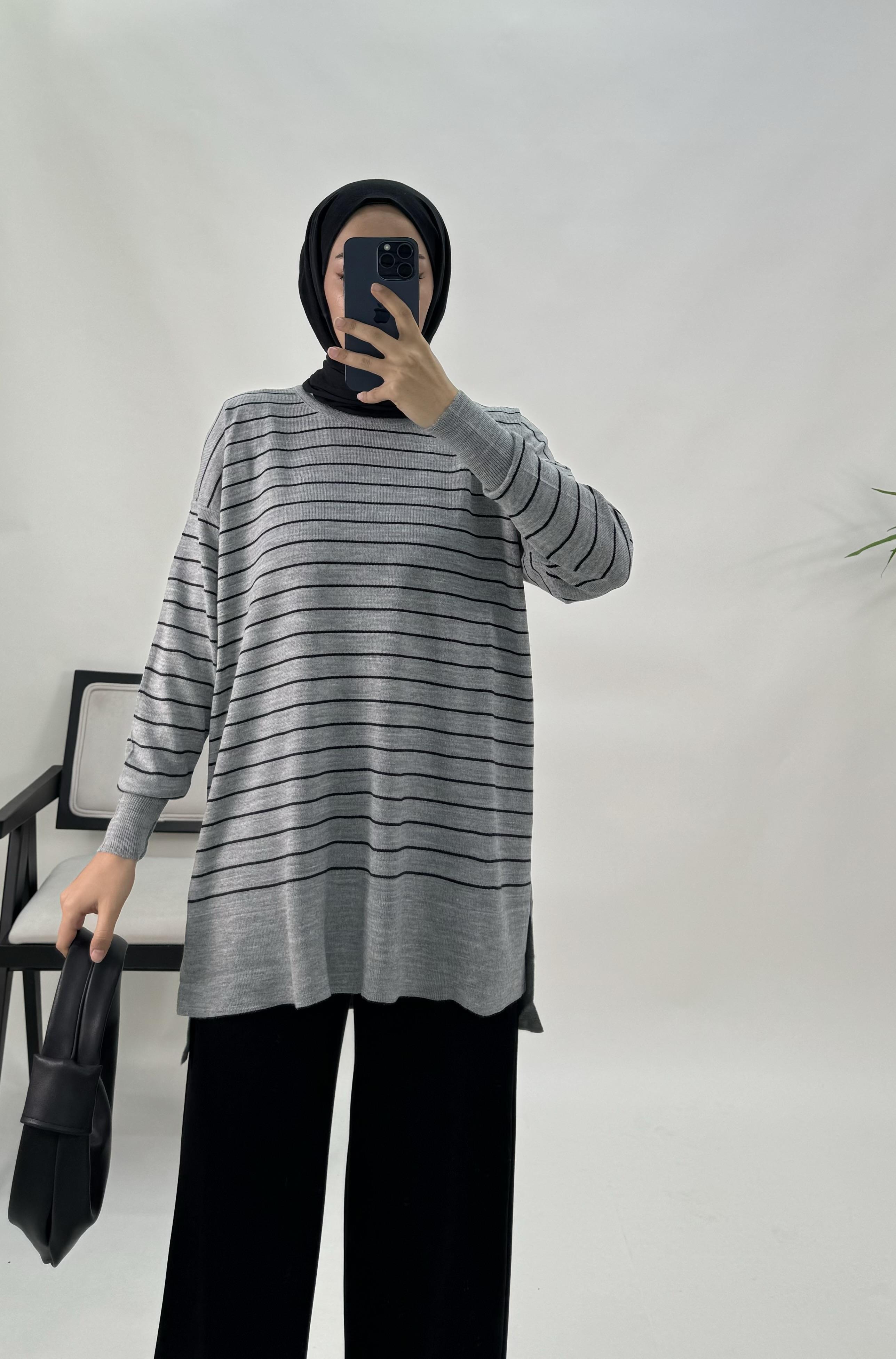 1416-çizgi detaylı yanları yırtmaçlı triko tunik-gri (1416)