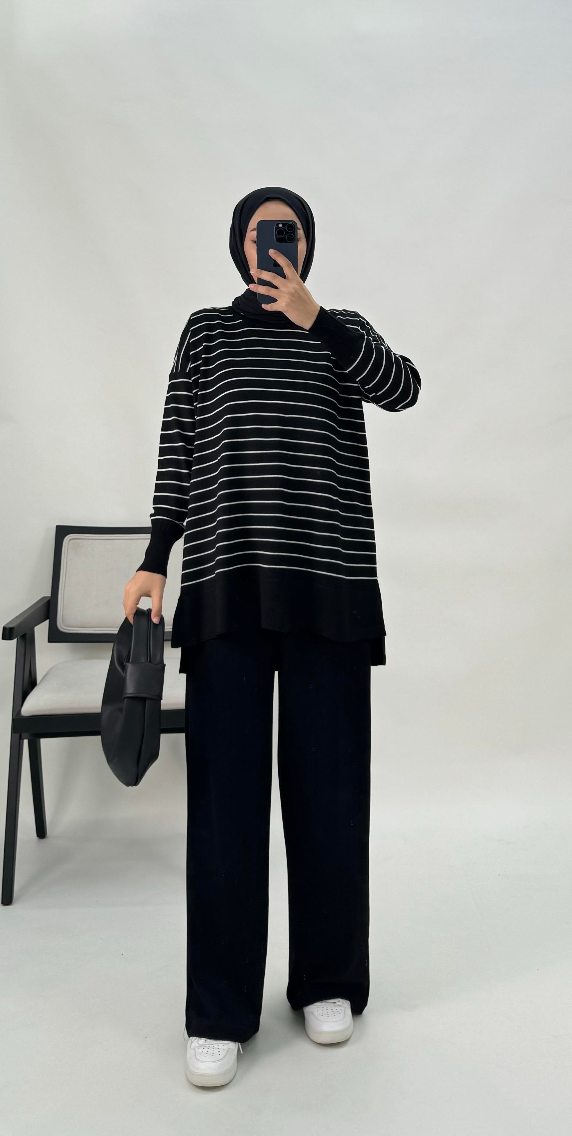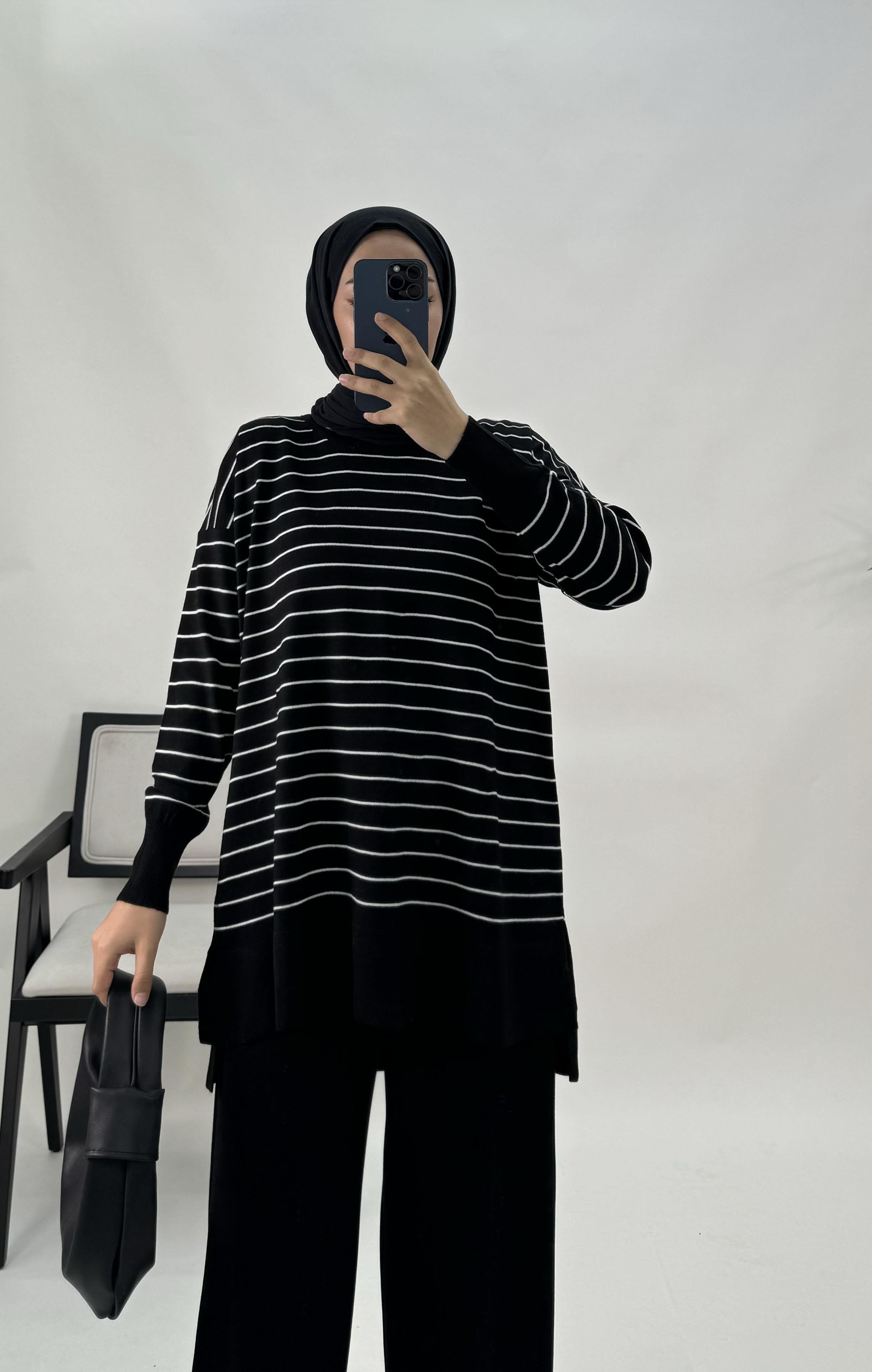 1416-çizgi detaylı yanları yırtmaçlı triko tunik-siyah (1416)