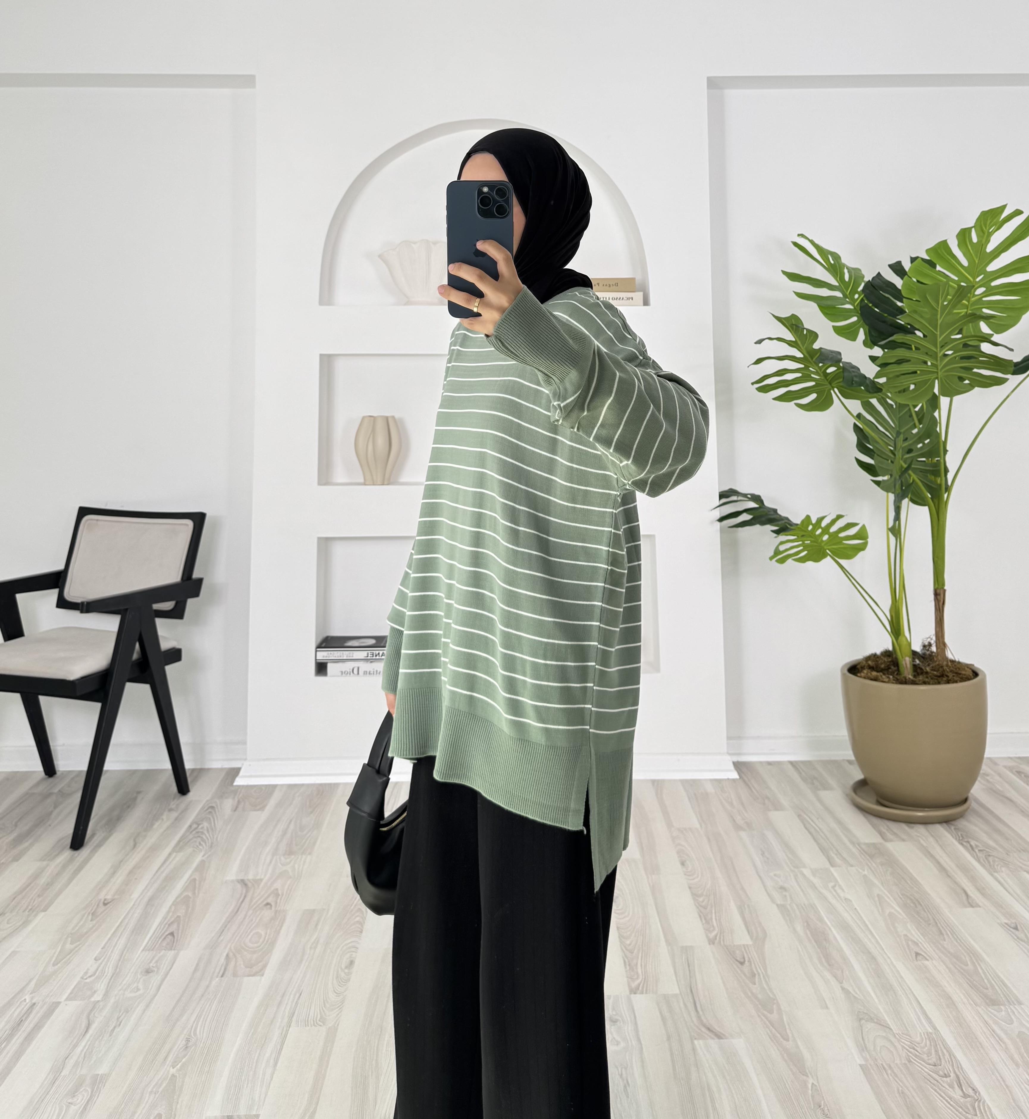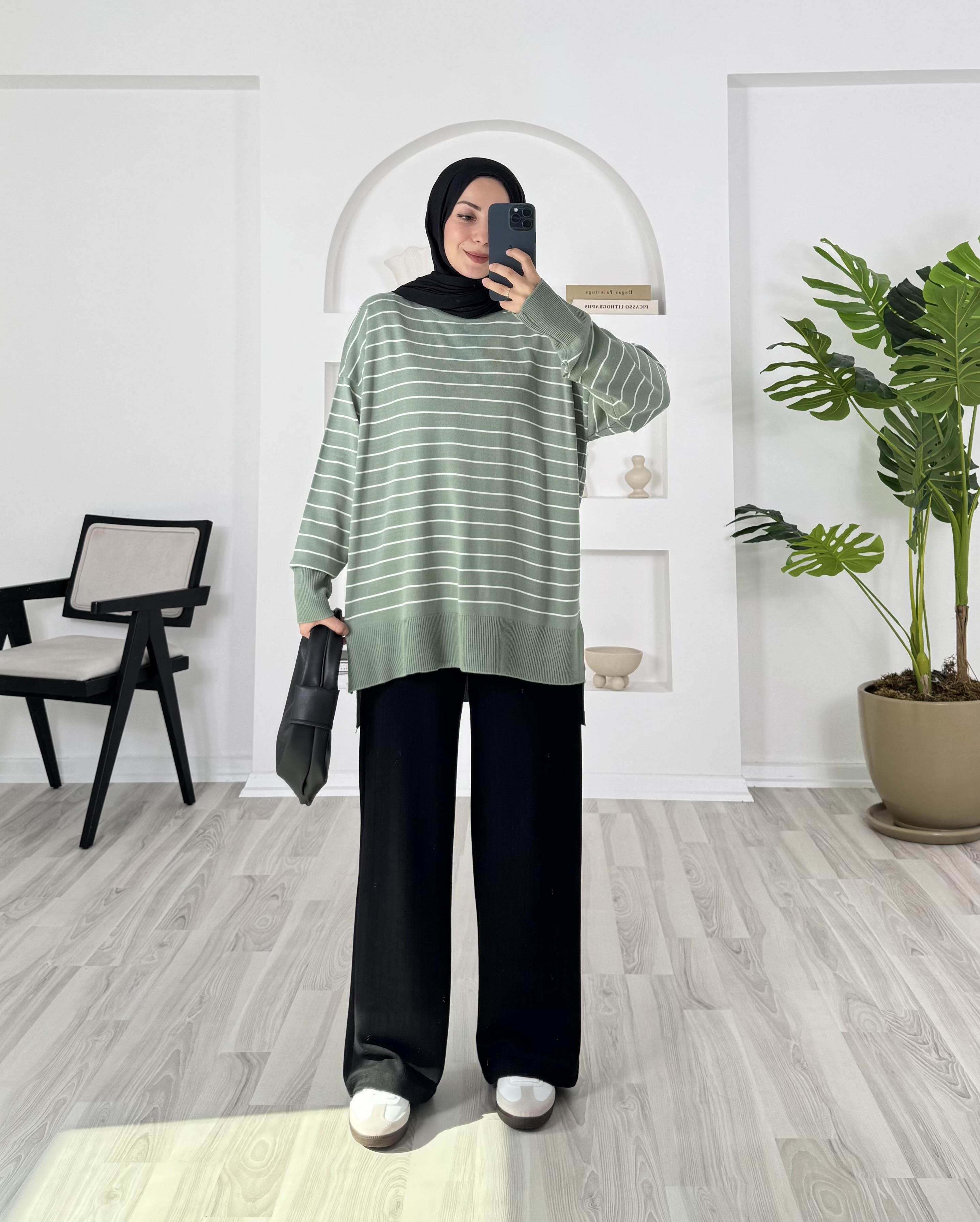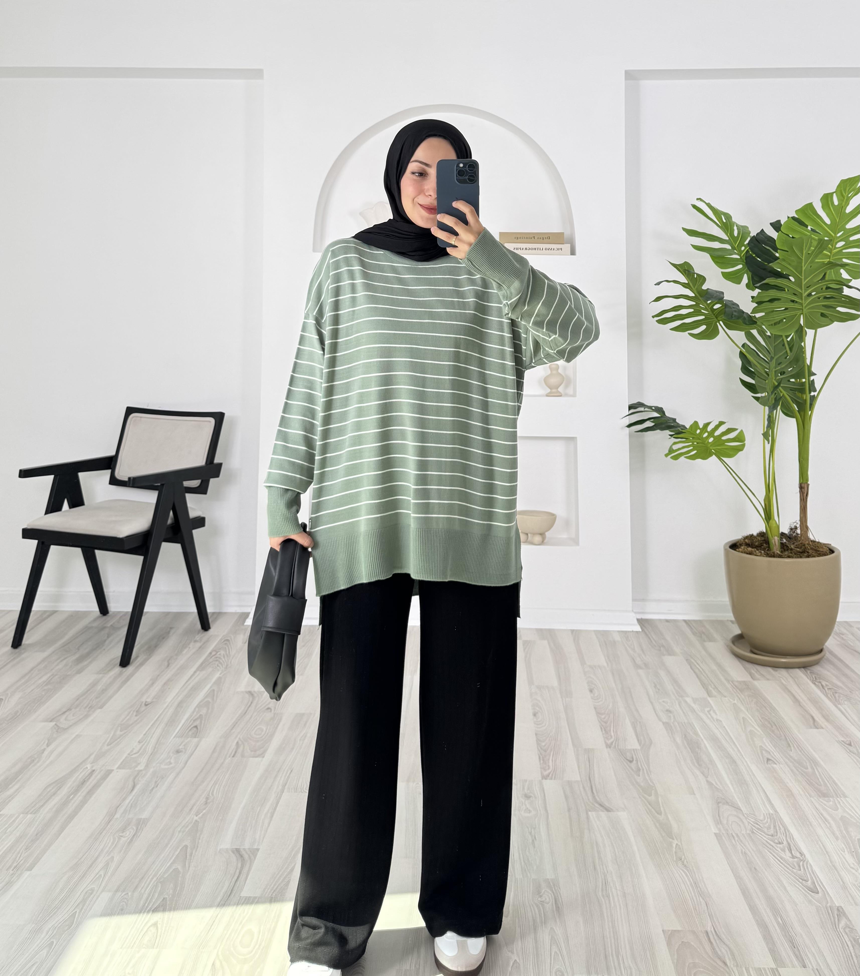 1416-çizgi detaylı yanları yırtmaçlı triko tunik-su yeşili (1416)