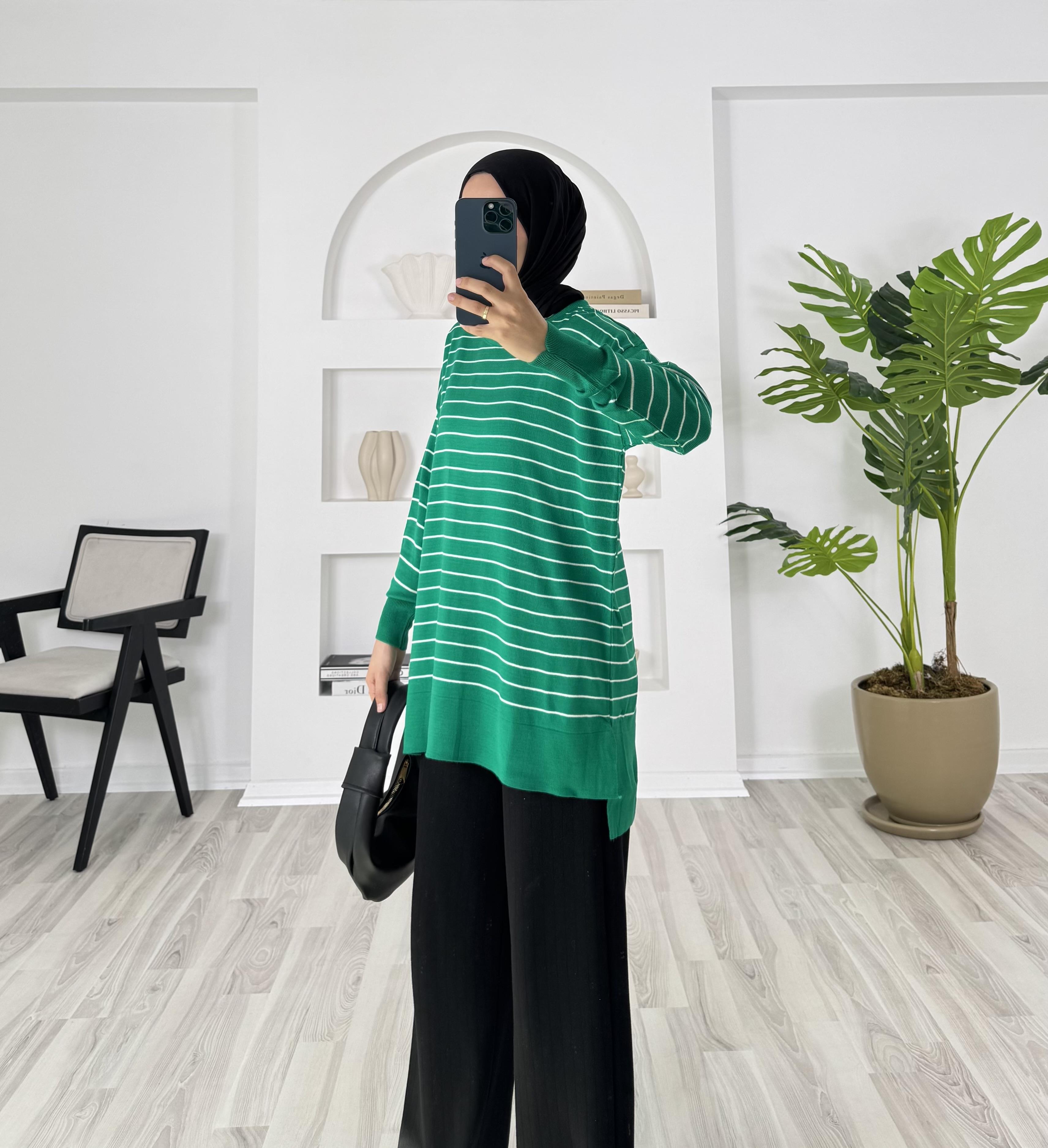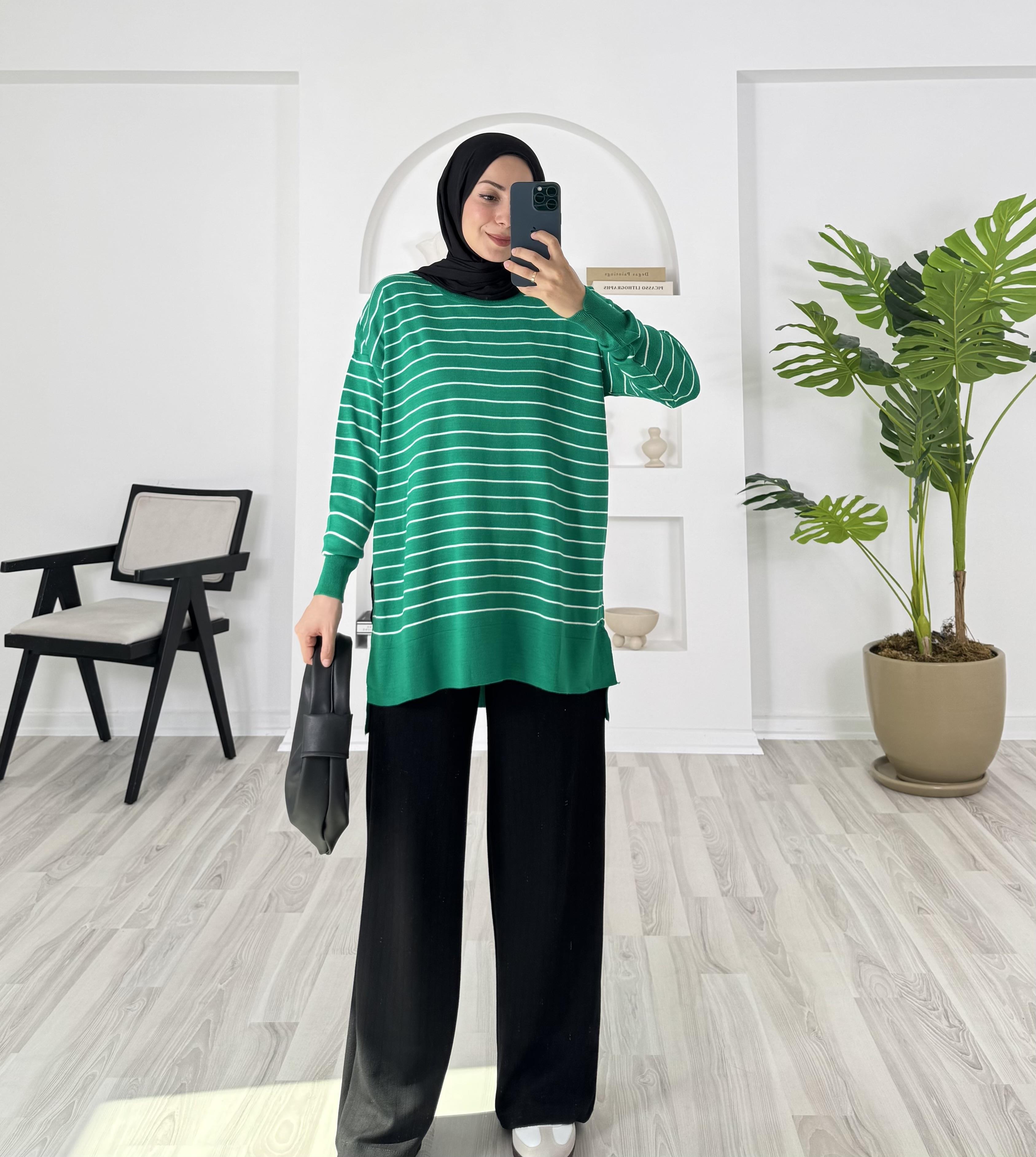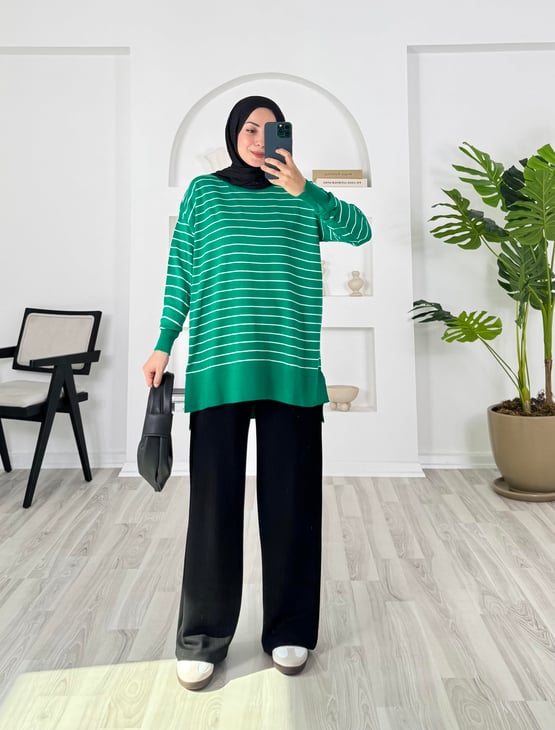 1416-çizgi detaylı yanları yırtmaçlı triko tunik-yeşil (1416)