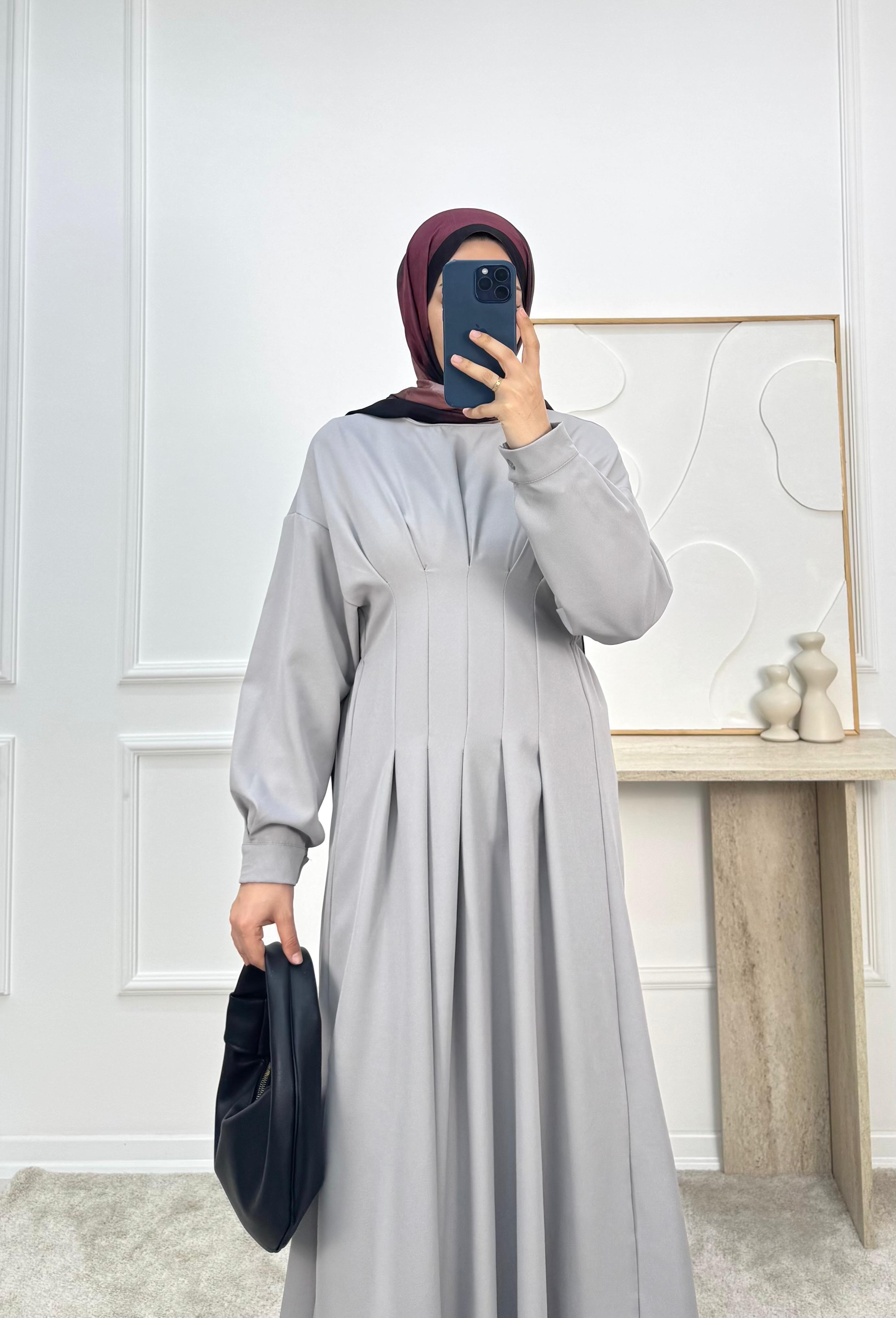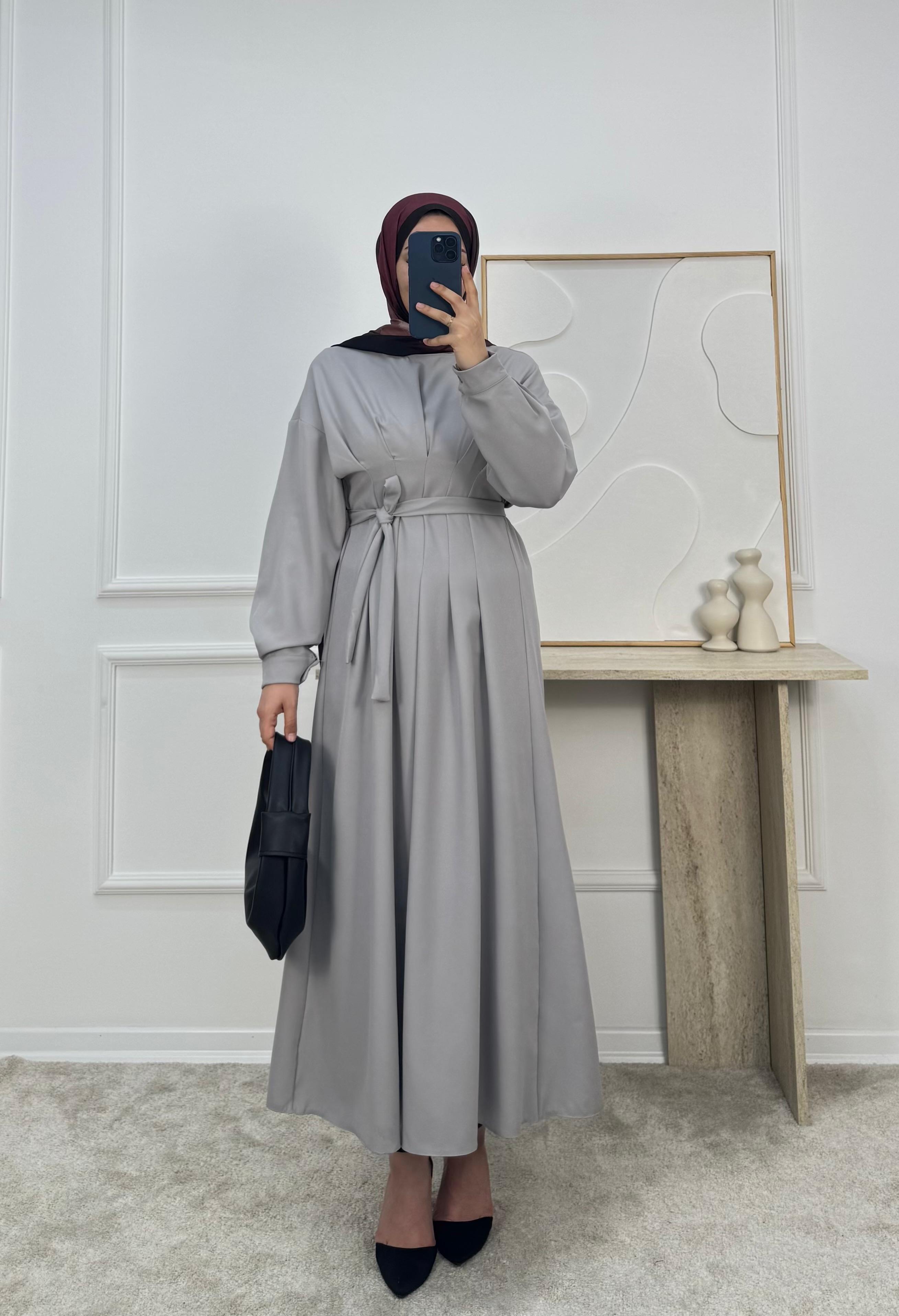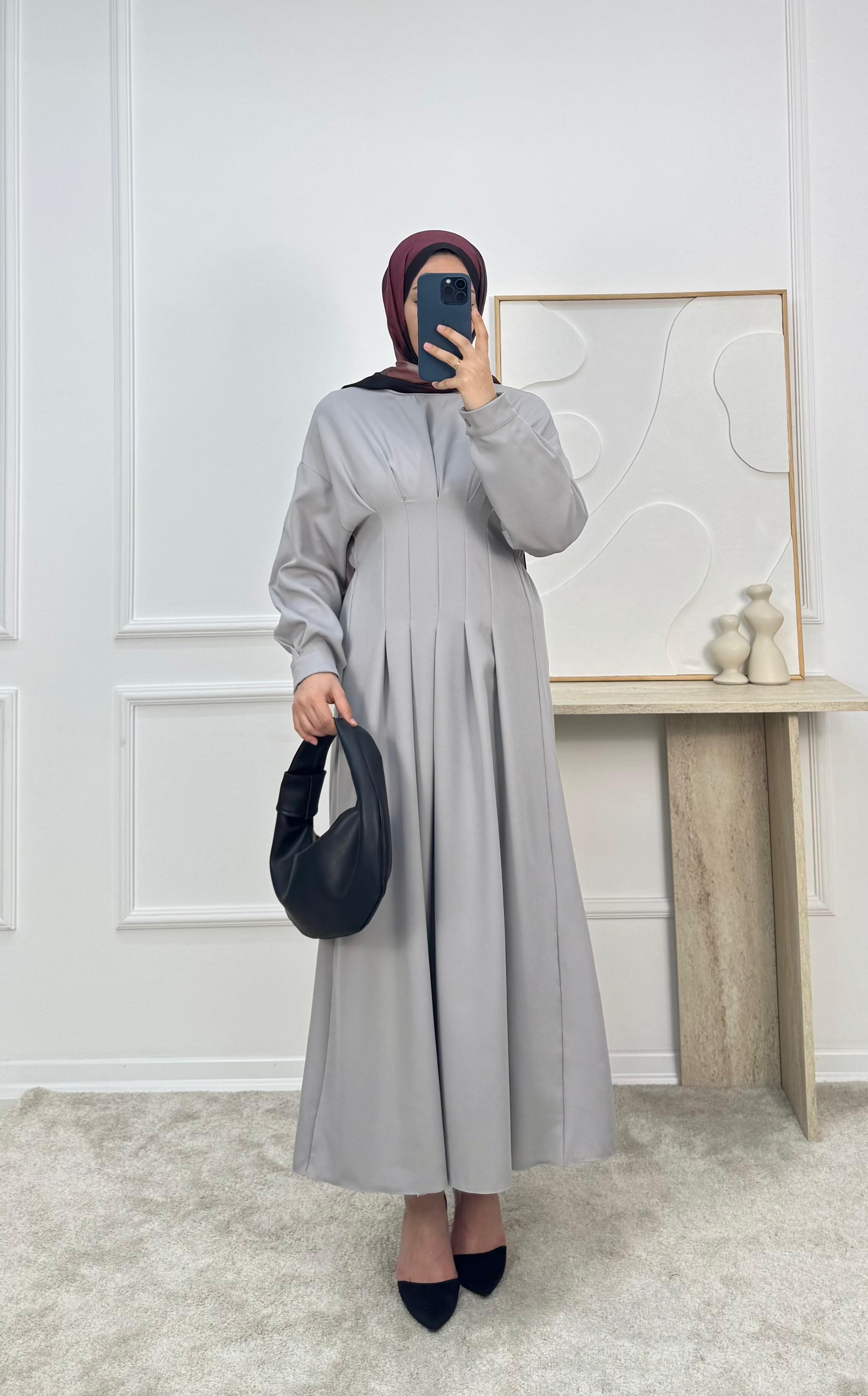 1479-dabıl krep kumaş bağlamalı elbise-gri (1479)