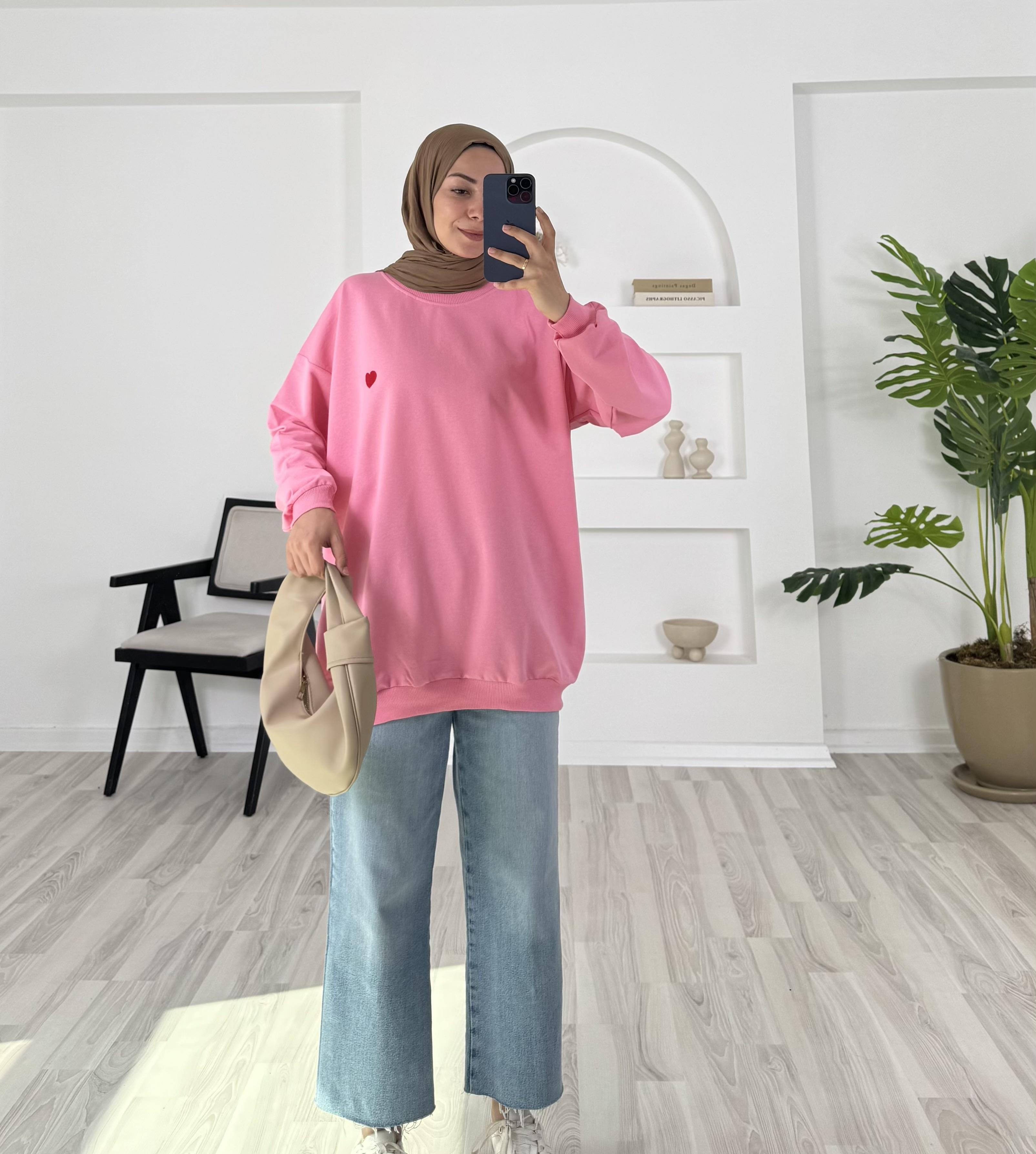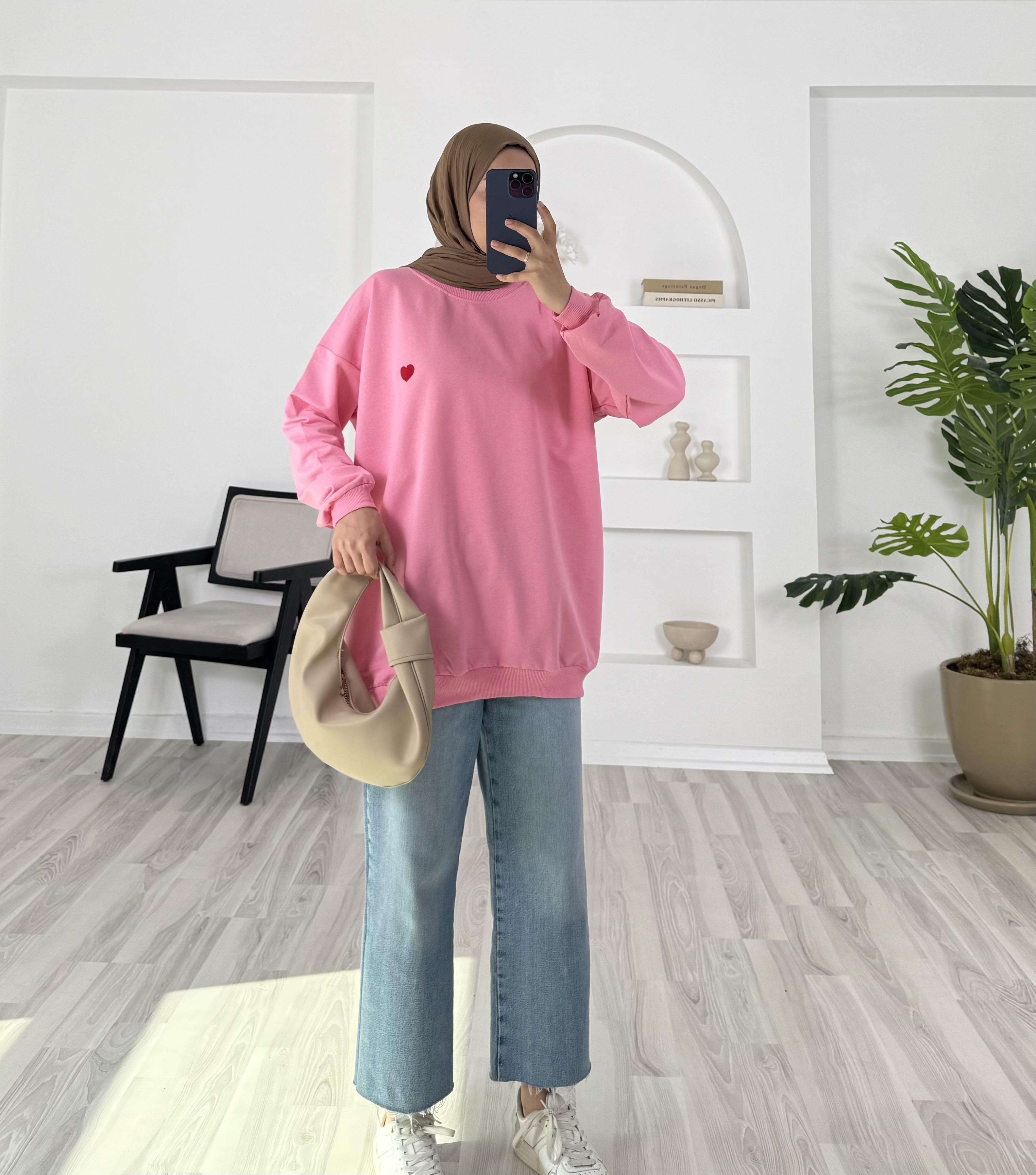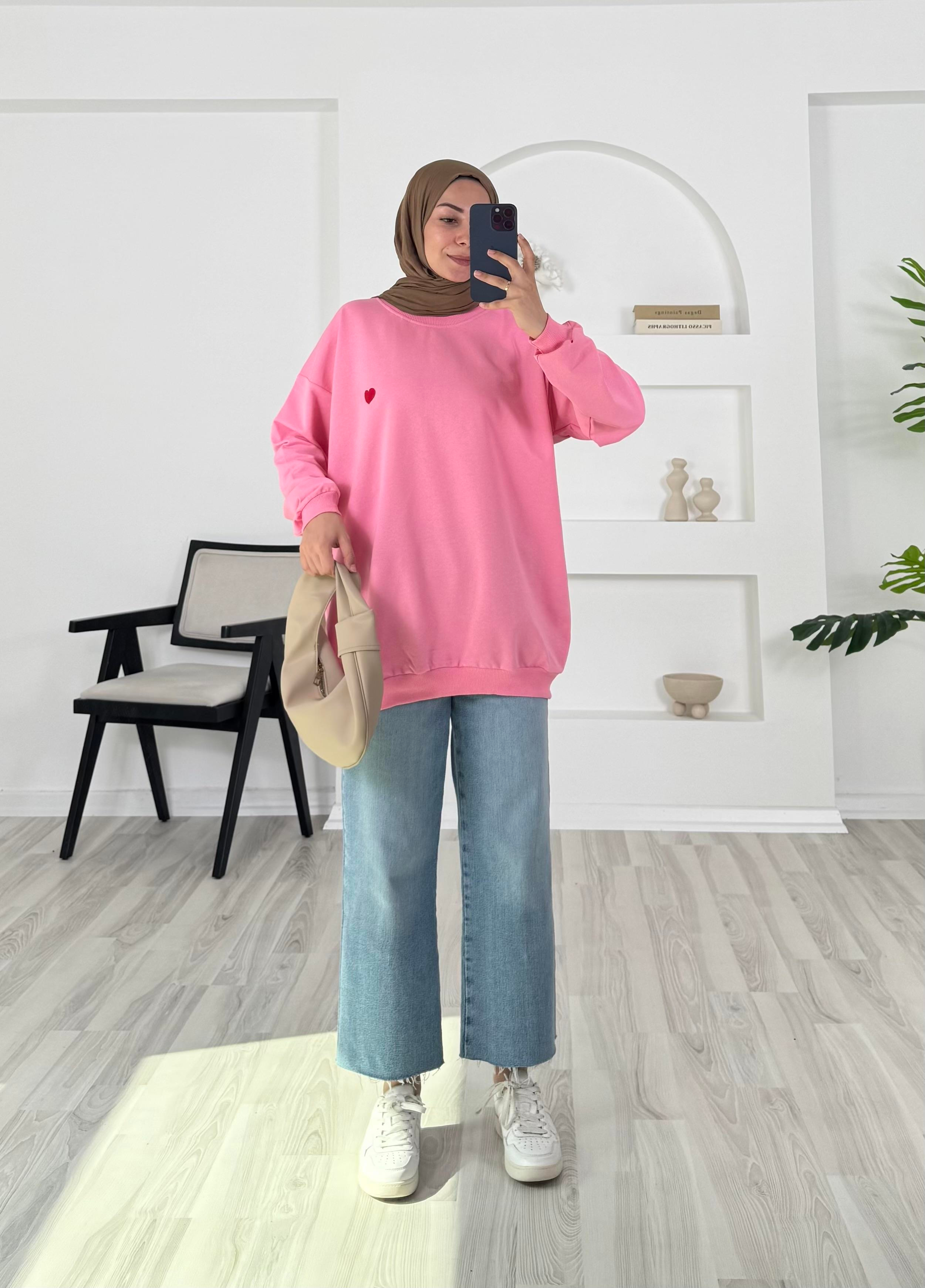 1499 - iki iplik kumaş kalpli sweatshirt - pembe (1499)