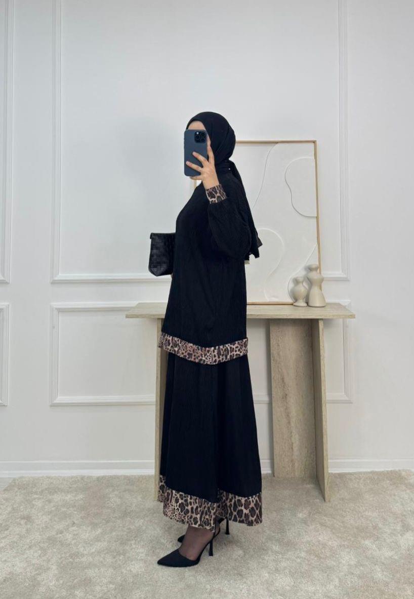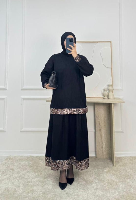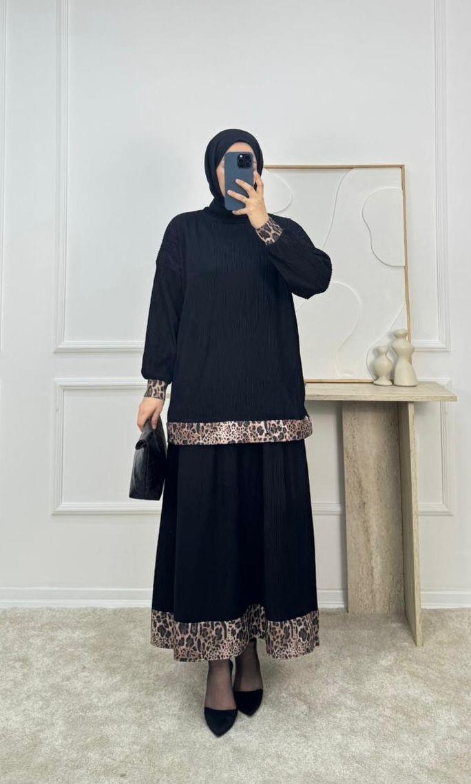 piliseli kumaş leopar desenli etekli takım