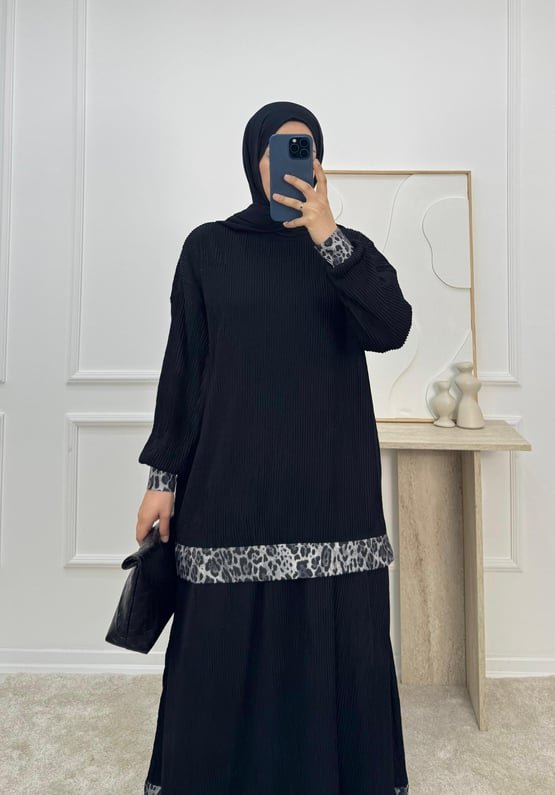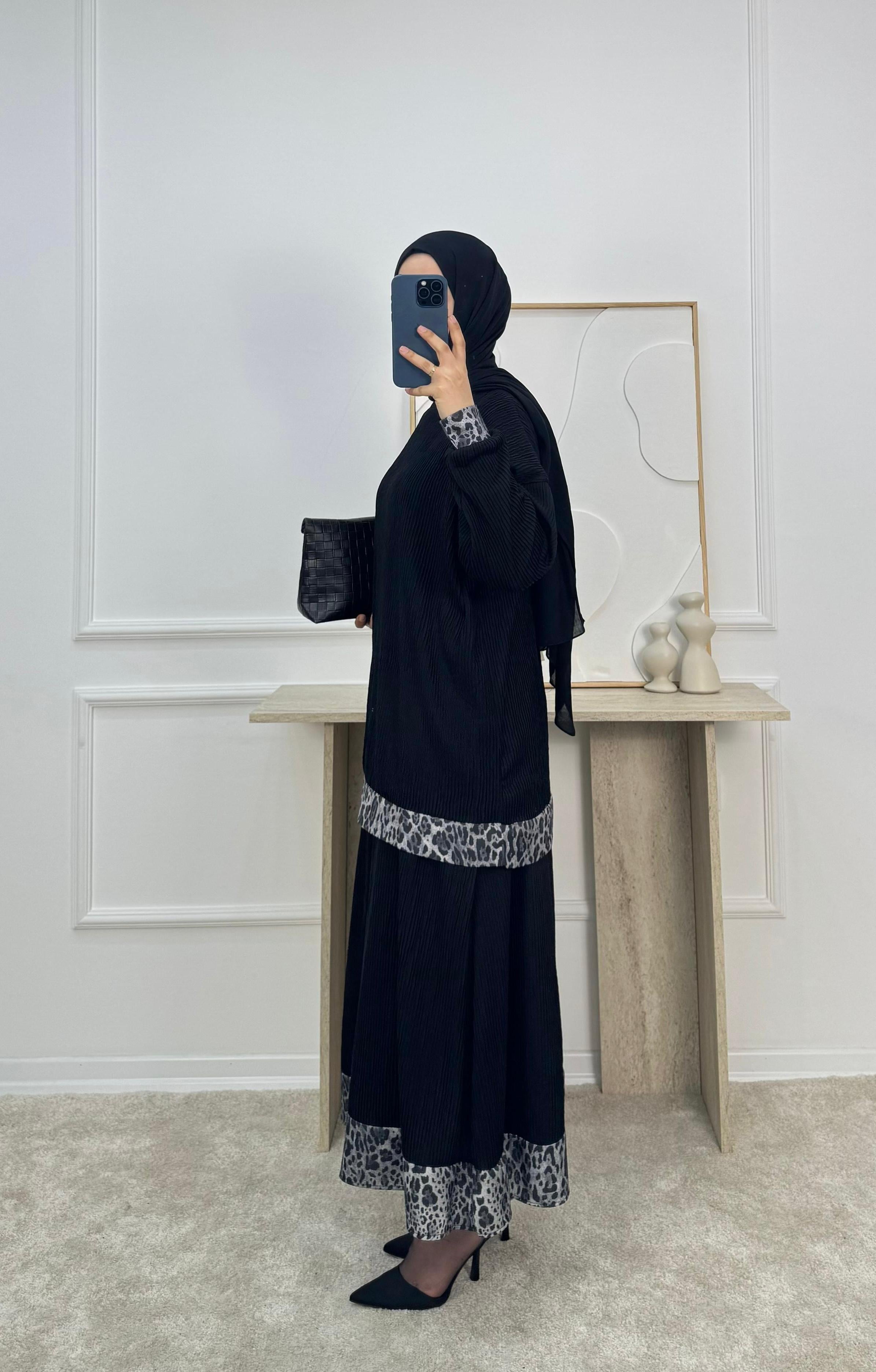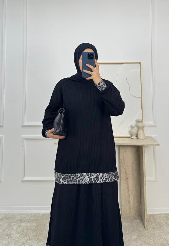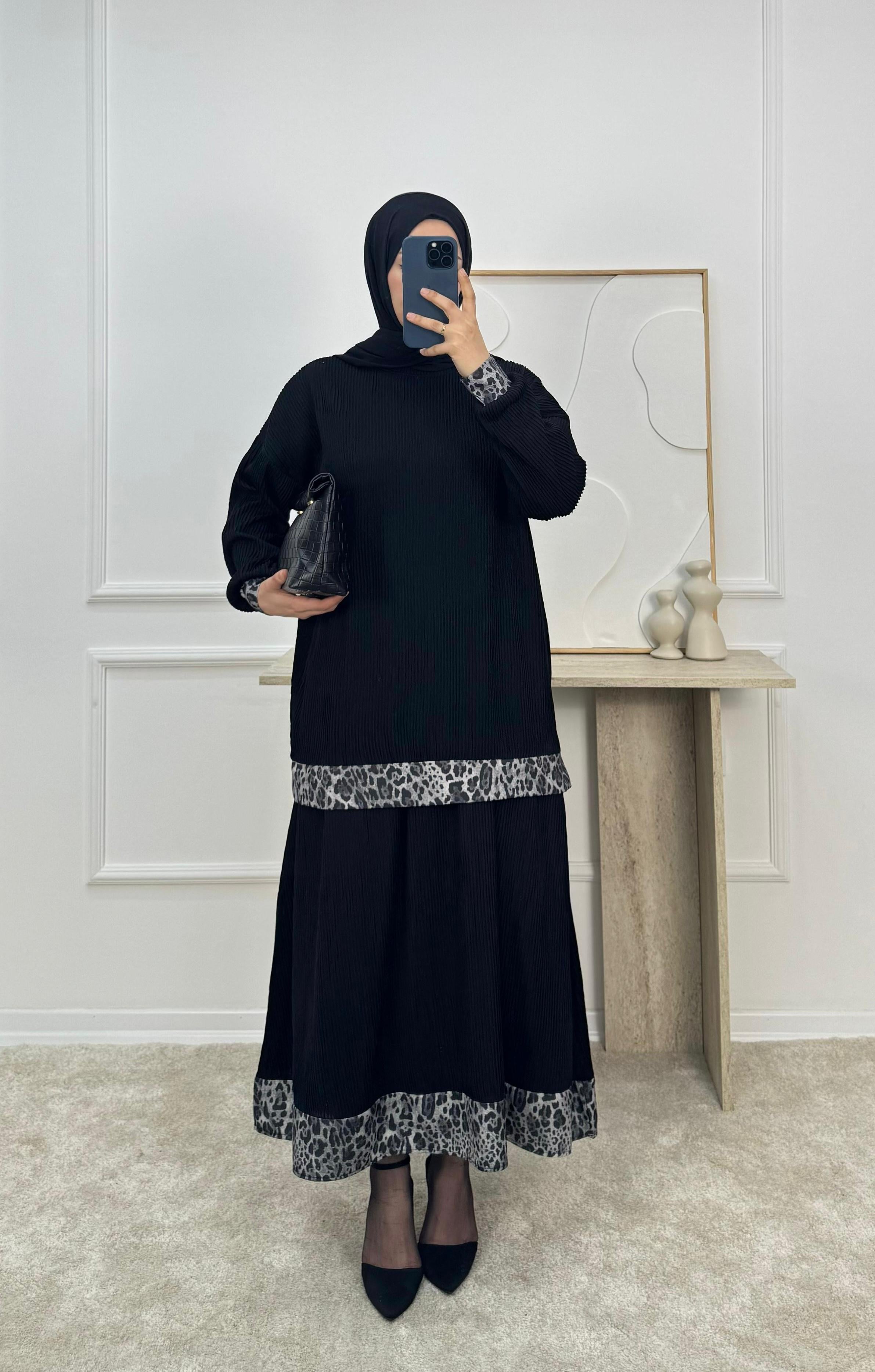 1567-piliseli kumaş leopar desenli etekli takım-siyah (1567)