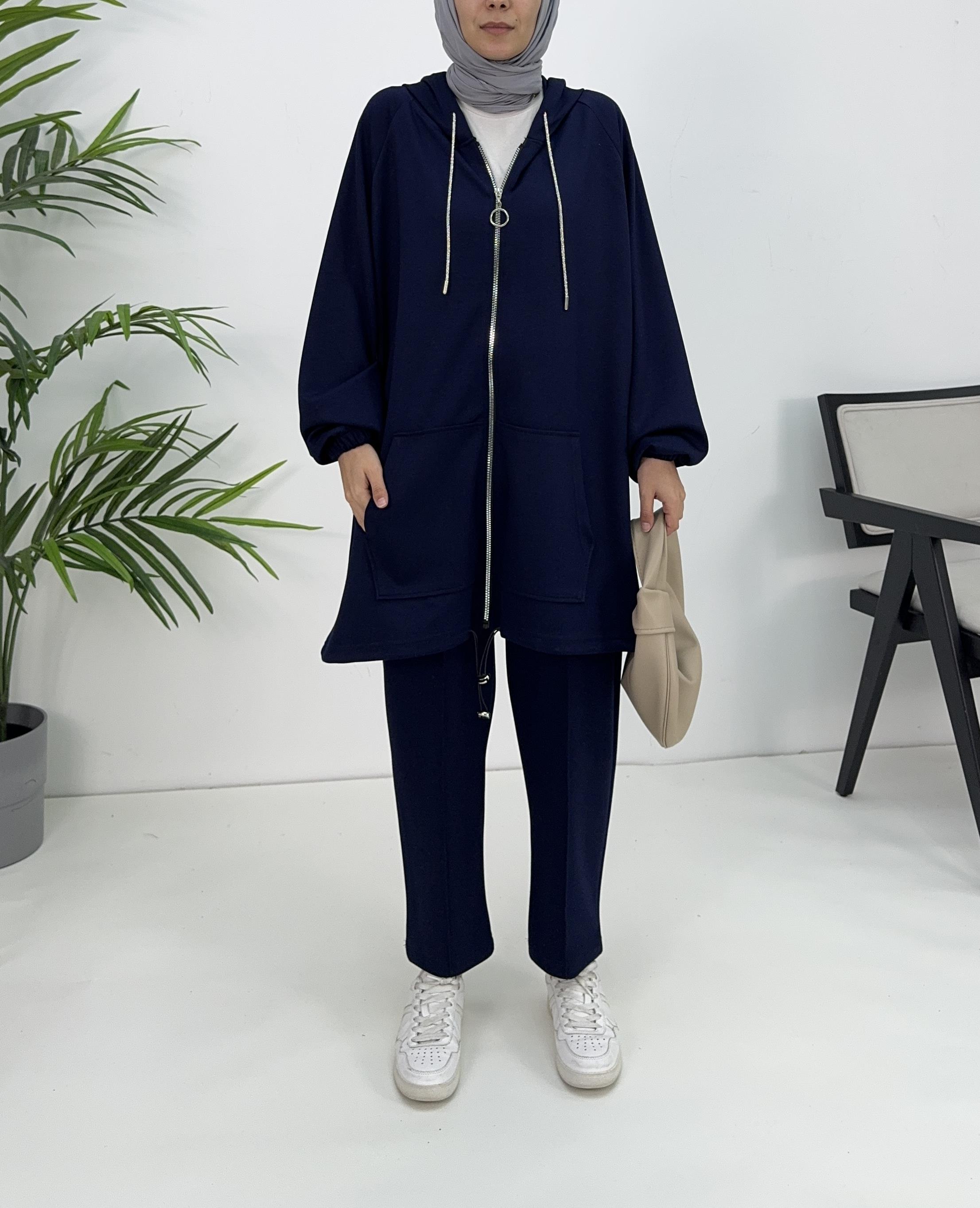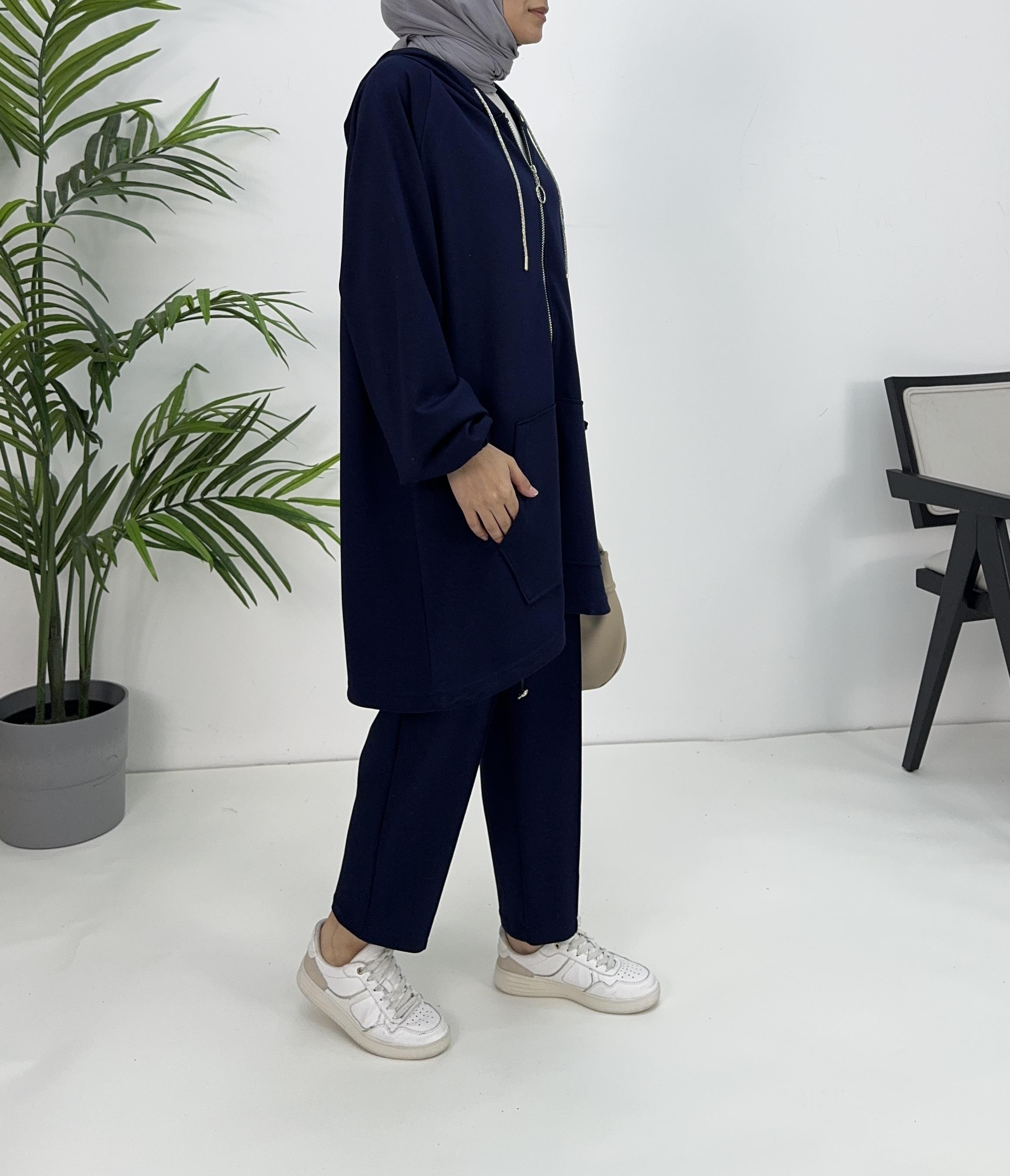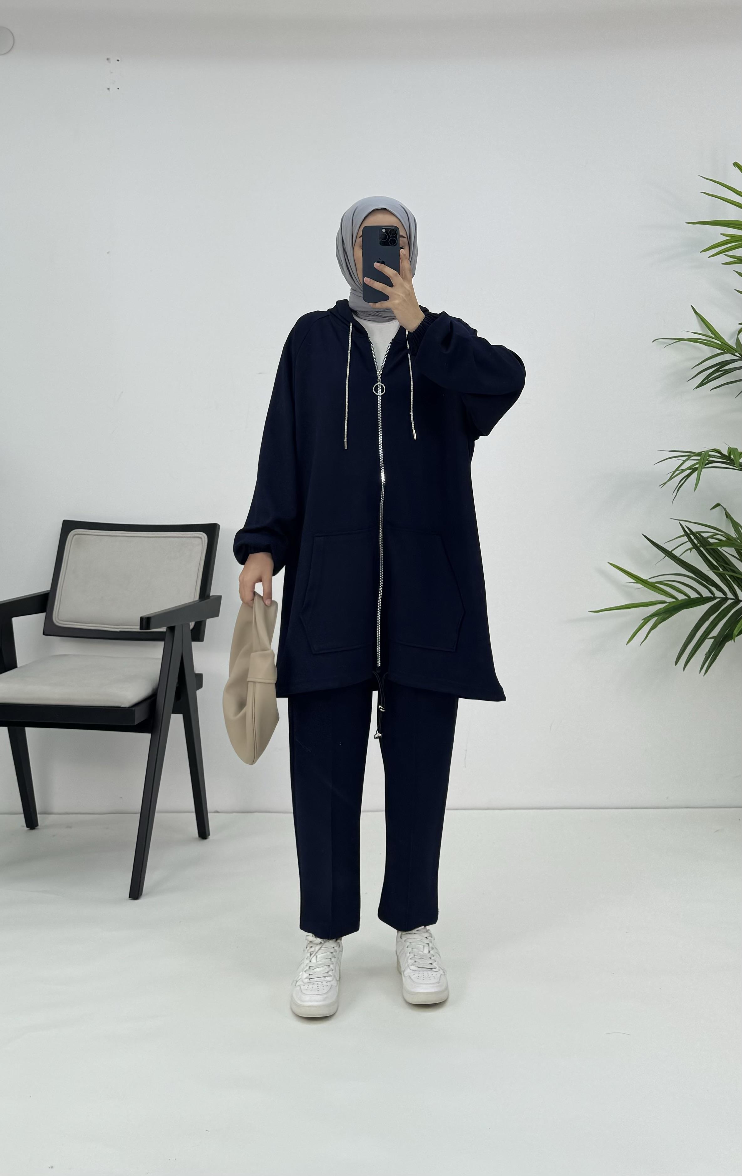 1594-oysho kumaş-taşlı kordon detaylı önü cepli boydan fermuarlı pantolonlu takım-lacivert (1594)