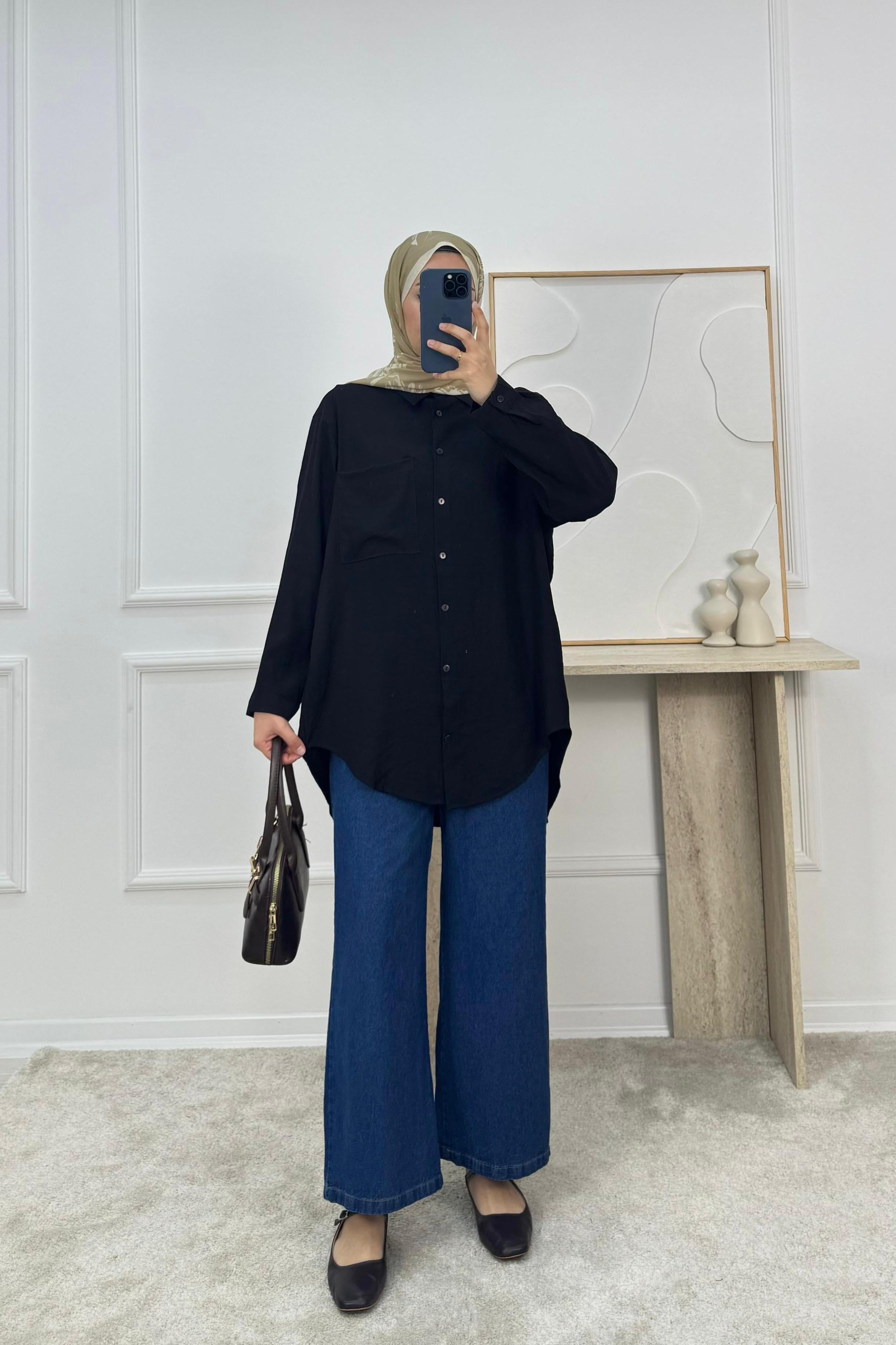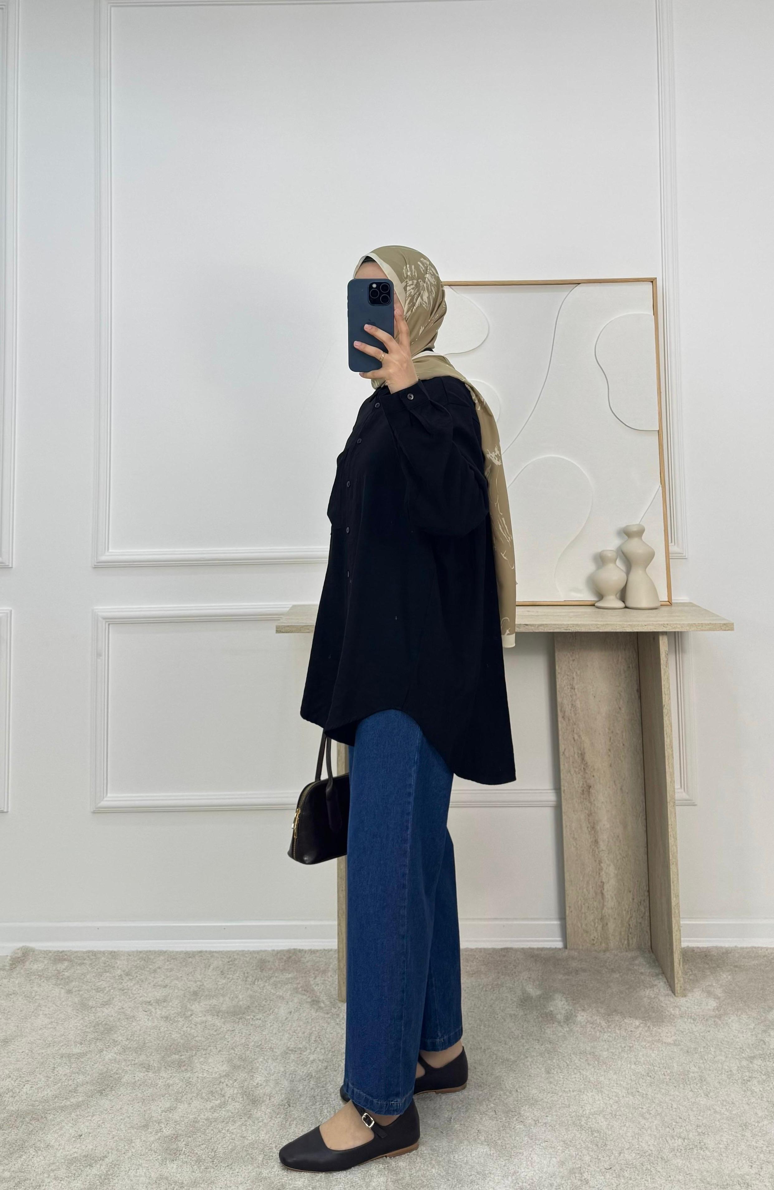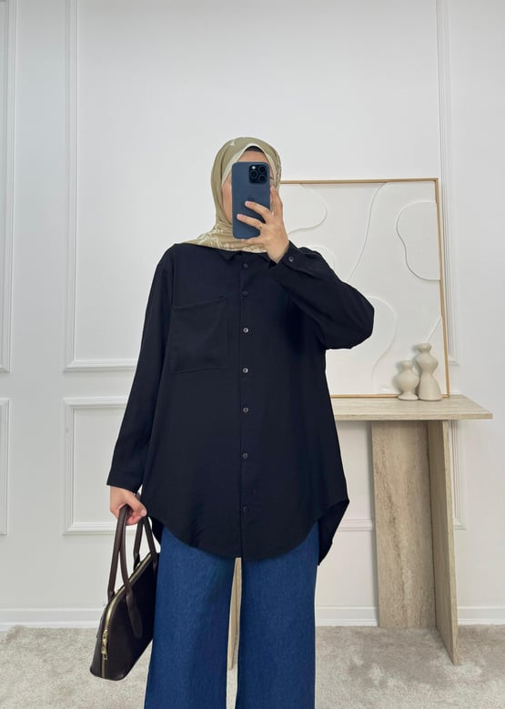 1606-cupra keten kumaş önü tek cepli gömlek-siyah (1606)