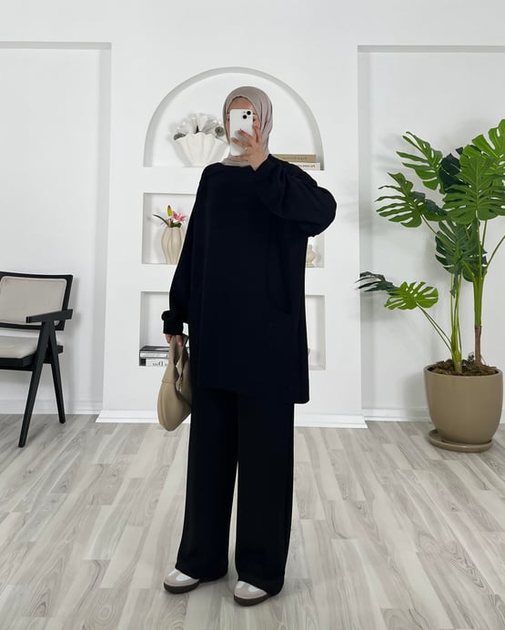 1614 - oysho kumaş bol paça pantolonlu cepli takım - siyah (1614 )