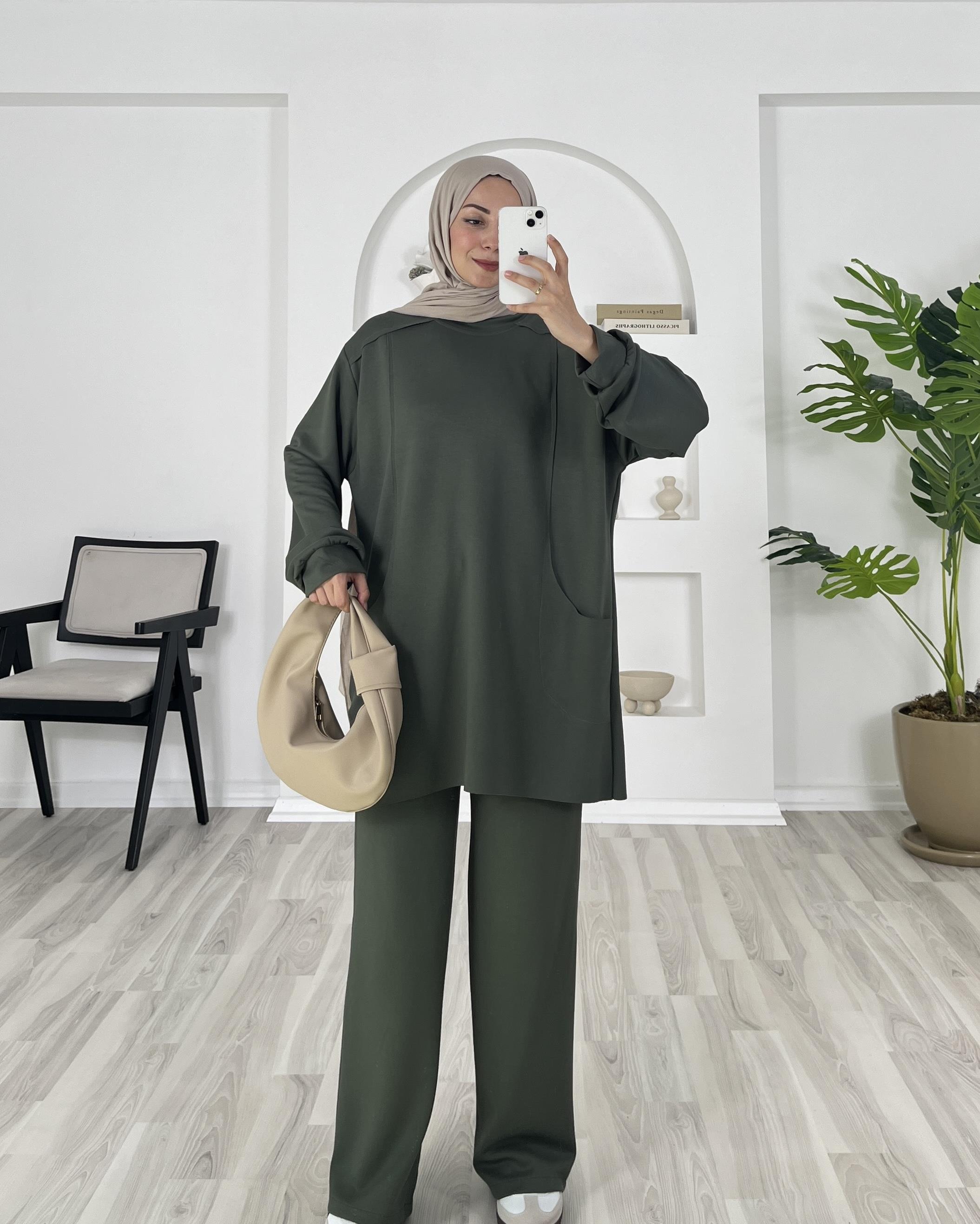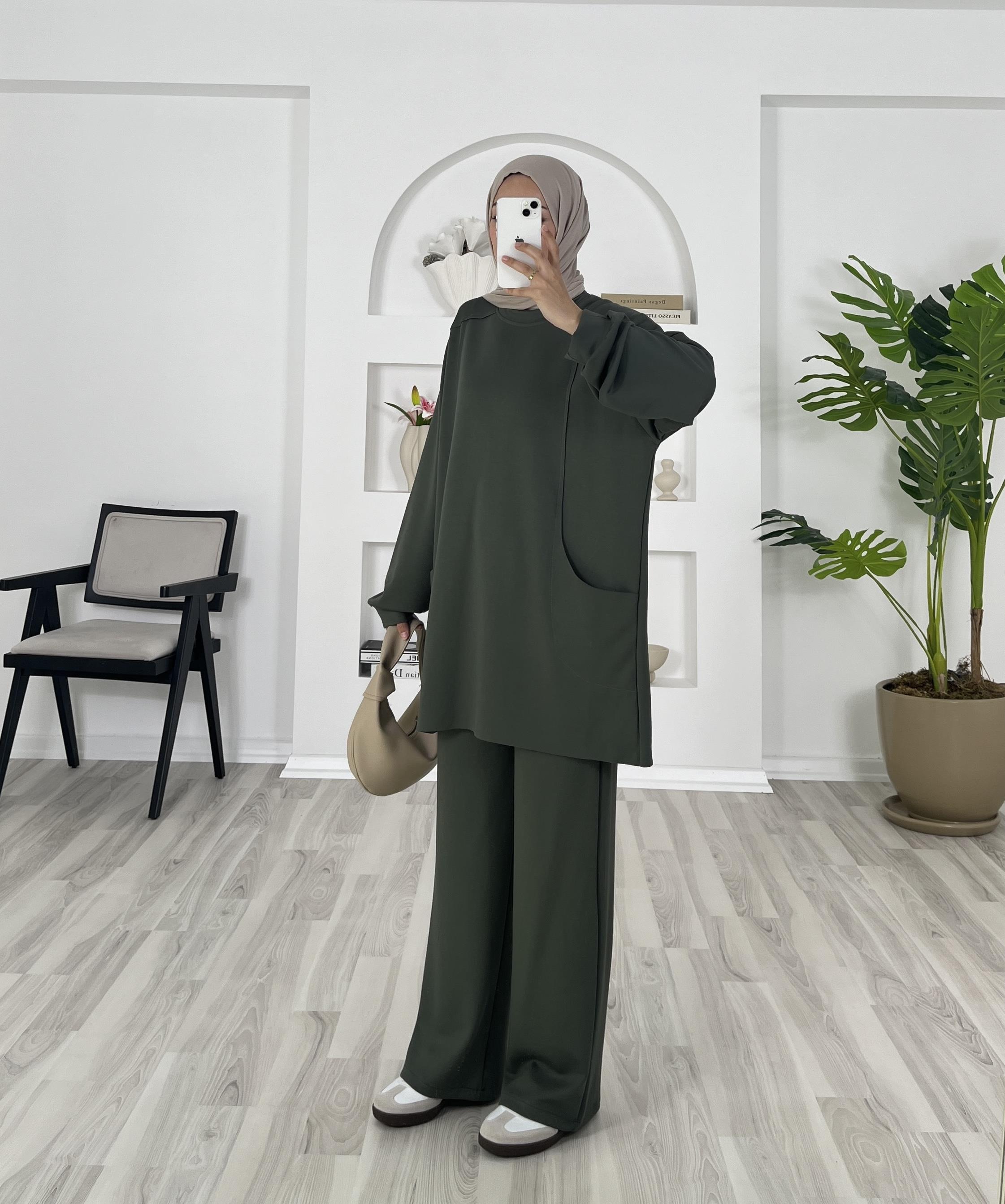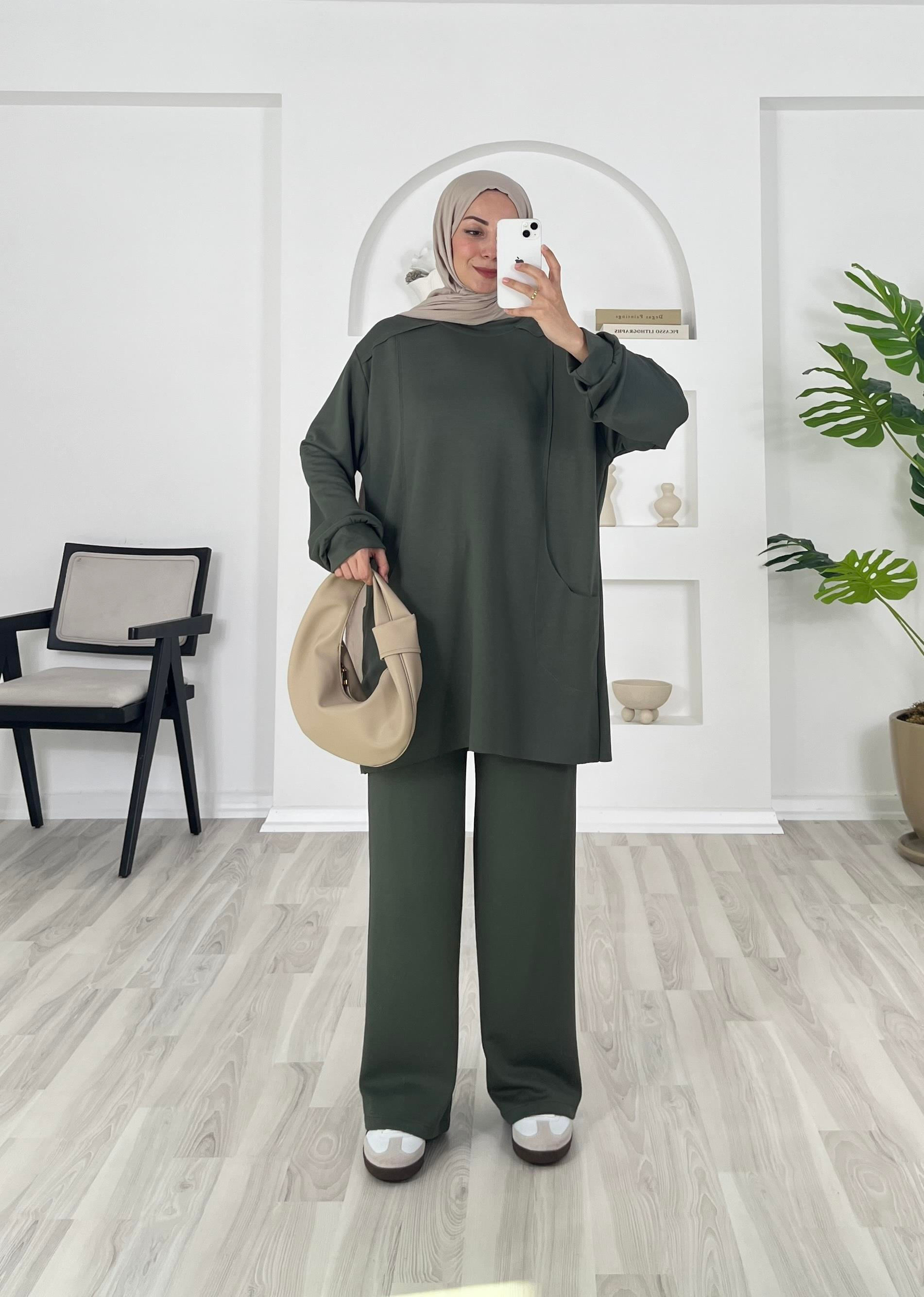 1614 - oysho kumaş bol paça pantolonlu cepli takım - yeşil (1614 )
