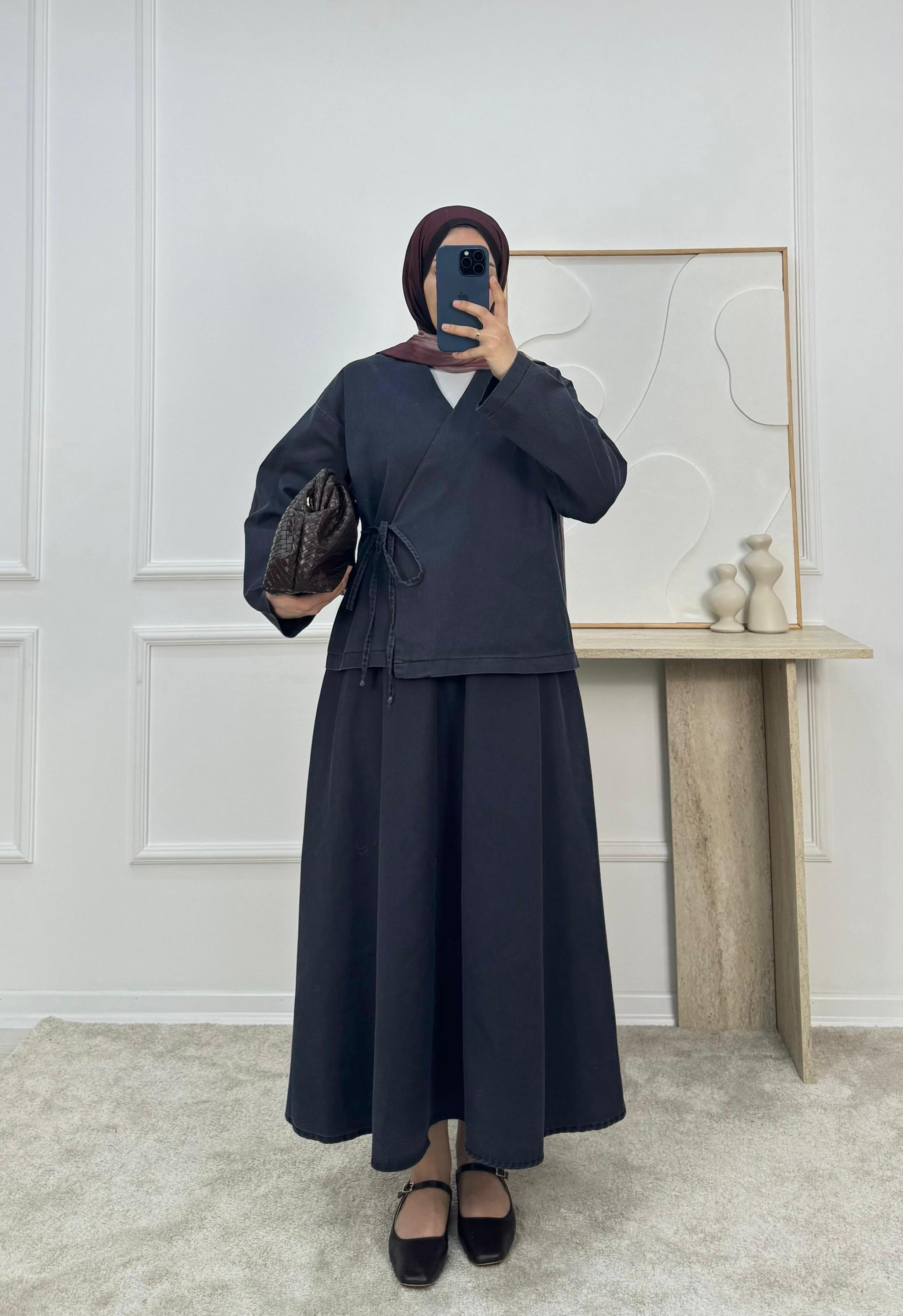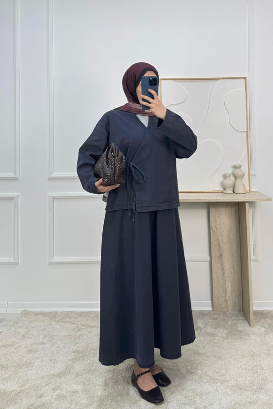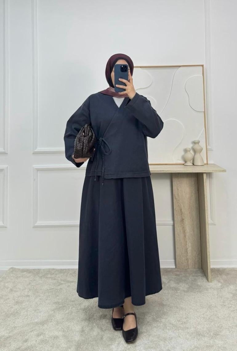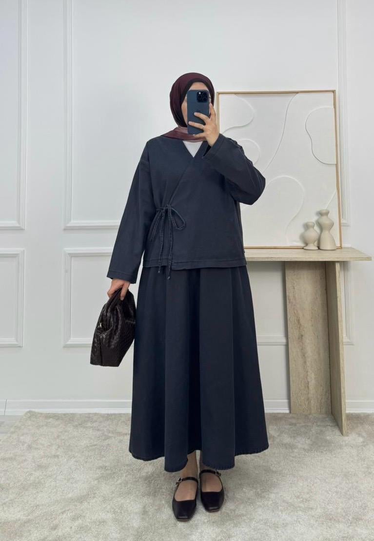 1628-kot kumaş kimona etekli takım-siyah (1628)