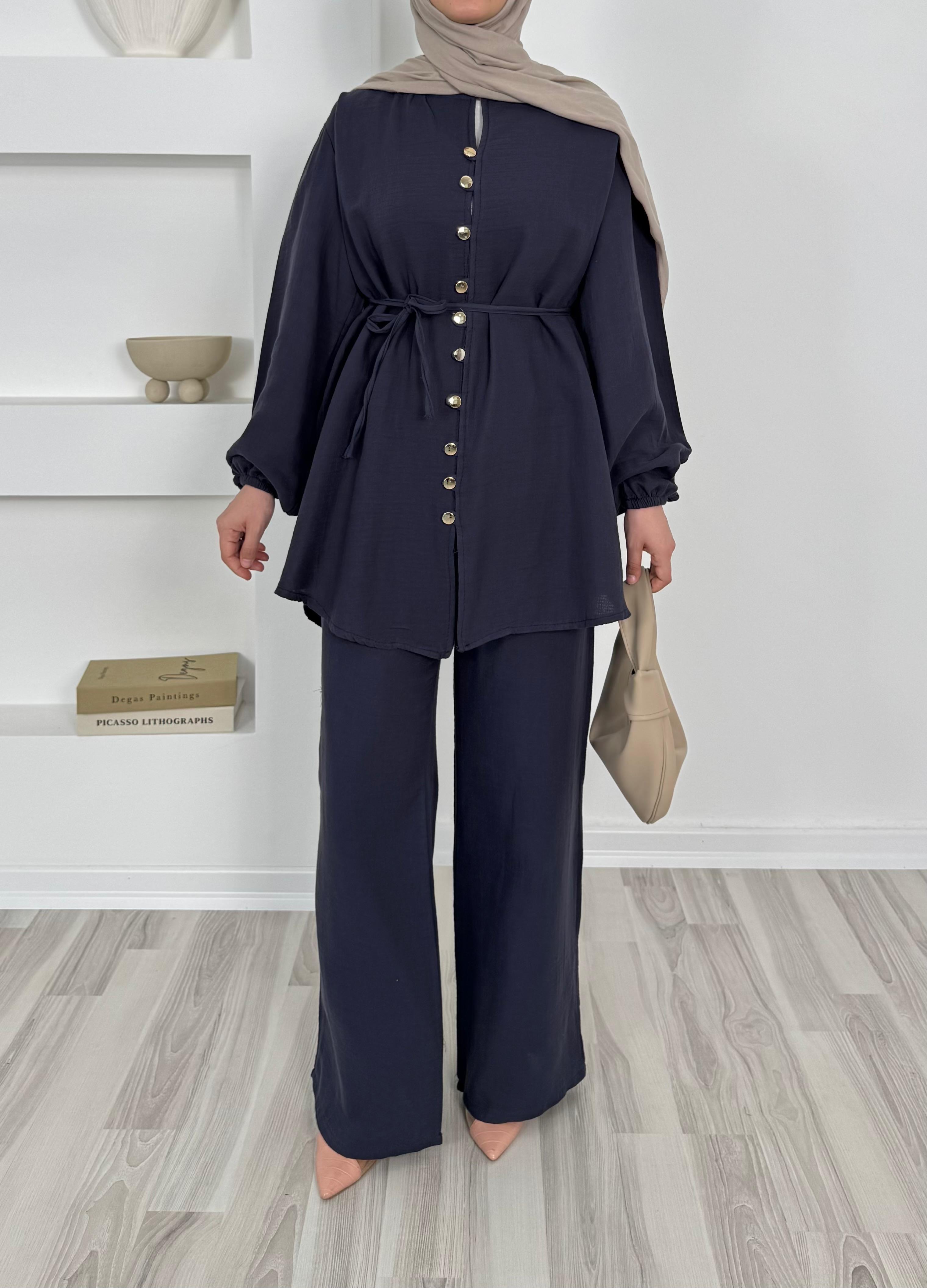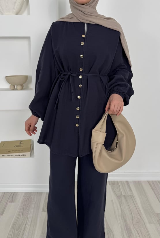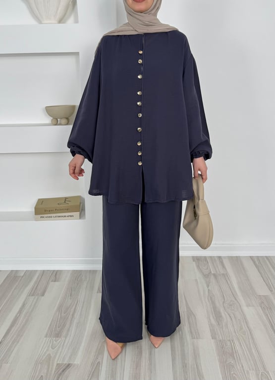 müslin kumaş önü düğmeli pantolonlu takım