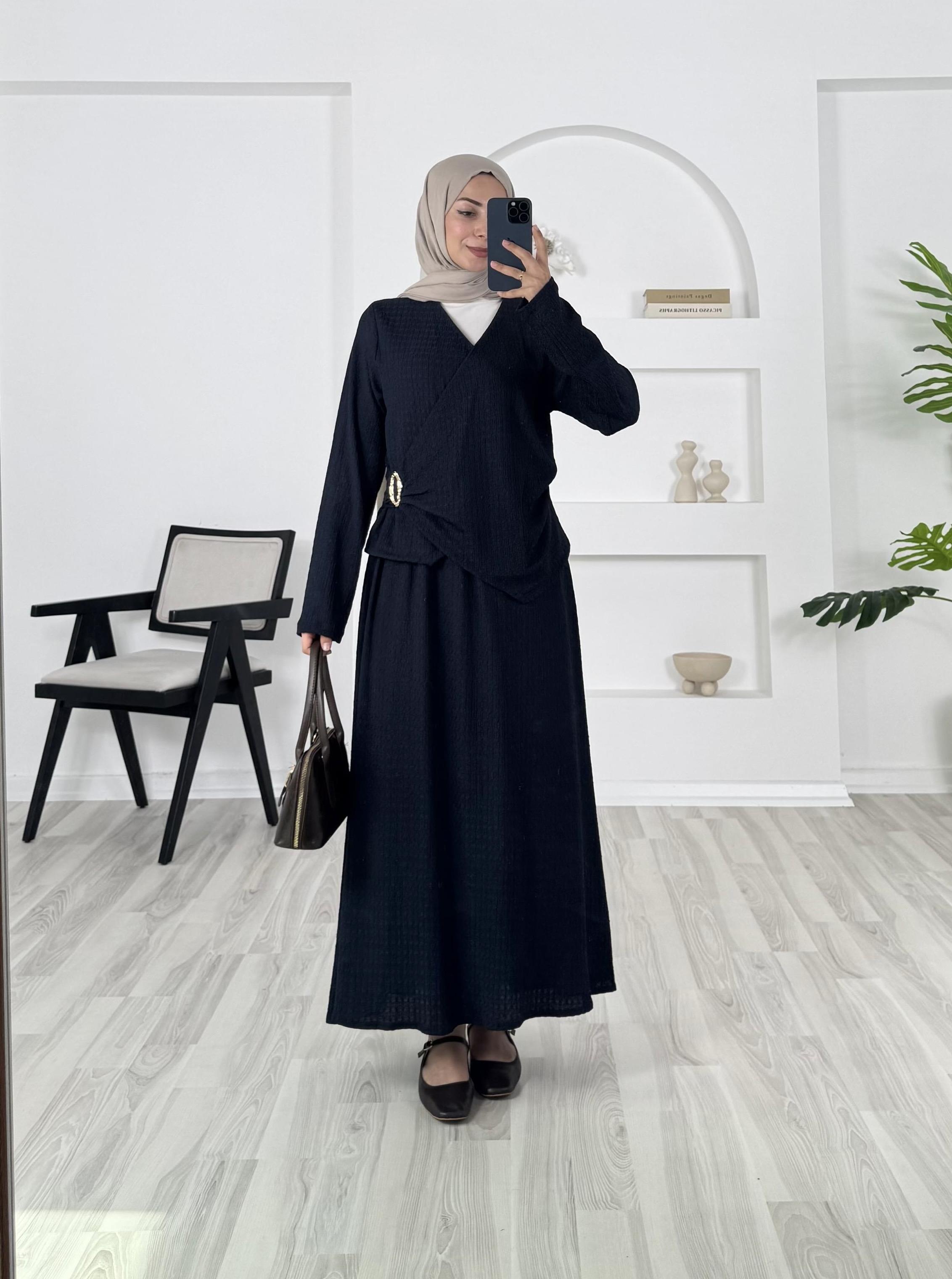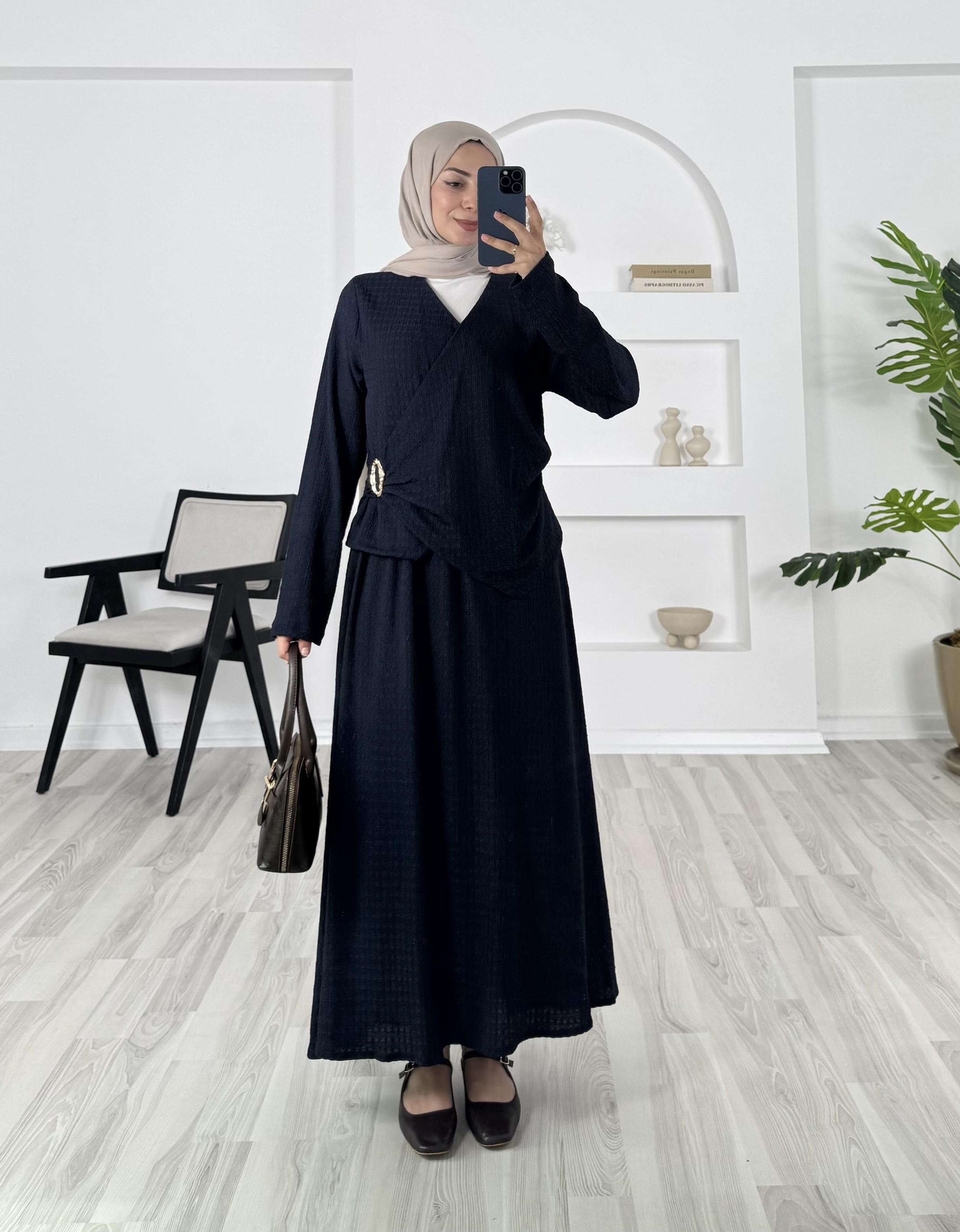 1649 -örme kumaş üstü çapraz broşlu etekli takım - lacivert (1649)
