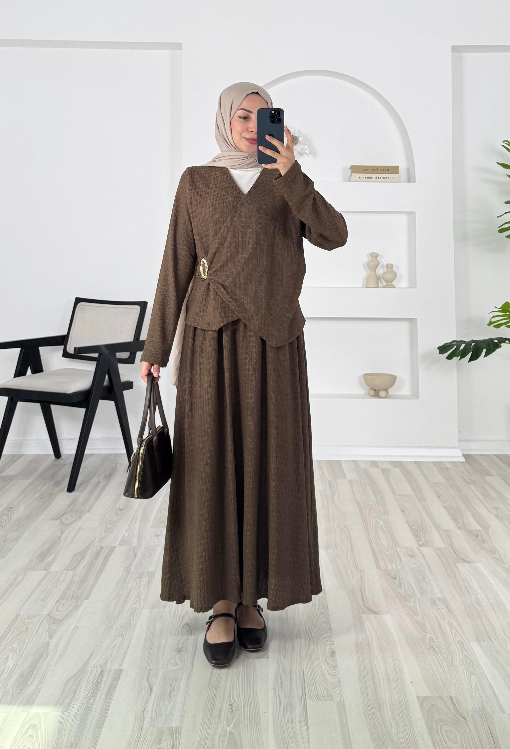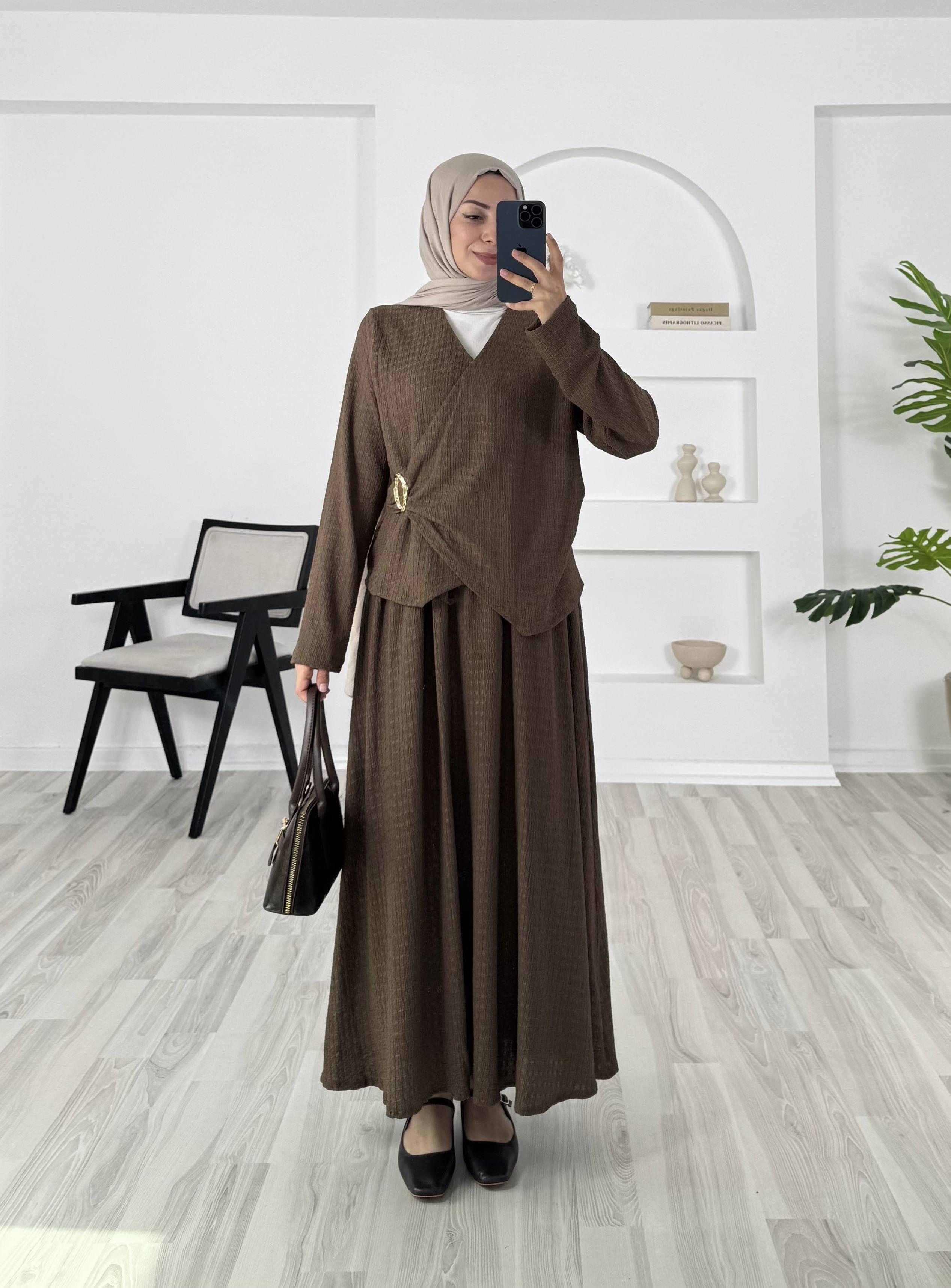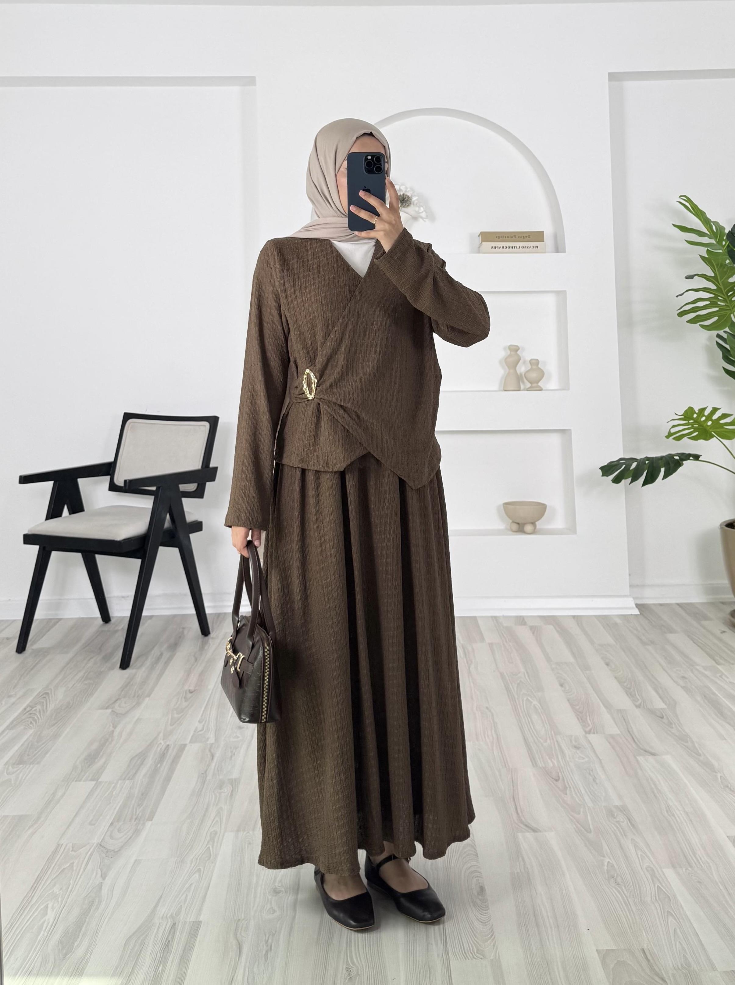 1649 - örme kumaş üstü çapraz broşlu etekli takım - acı kahve (1649)