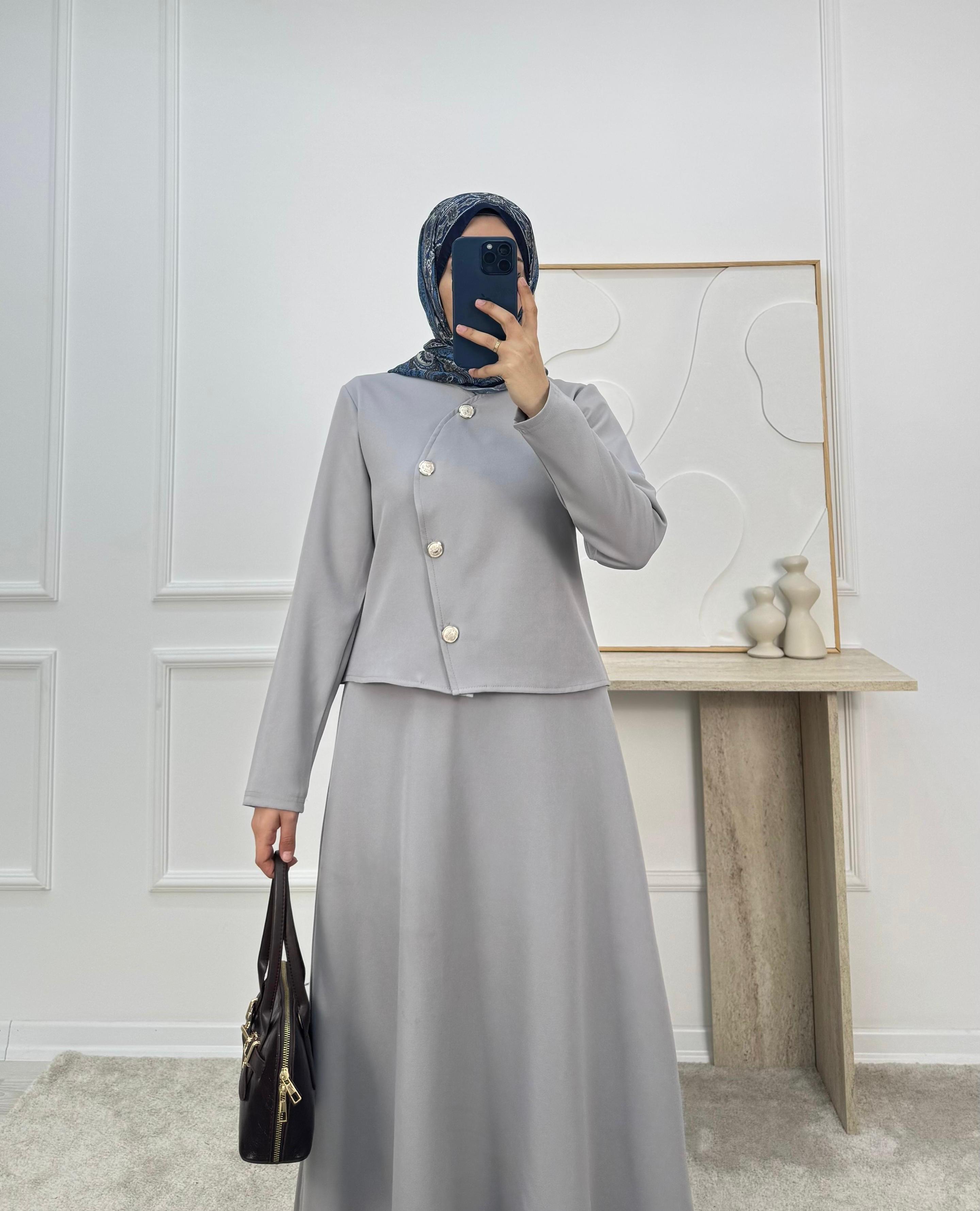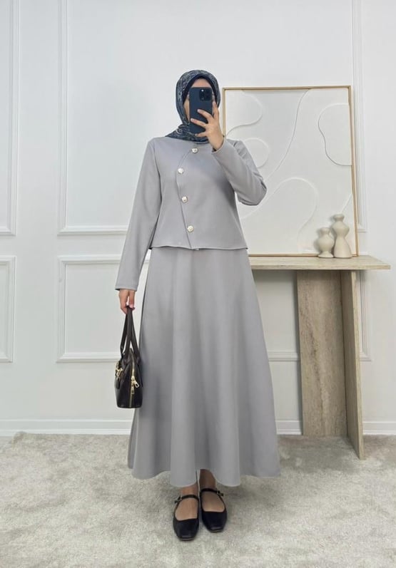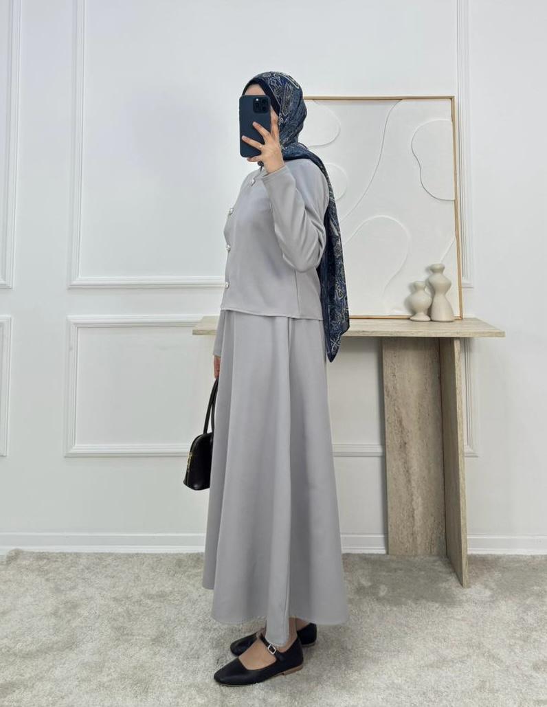 1719-dabıl krep kumaş etekli takım-gri (1719)