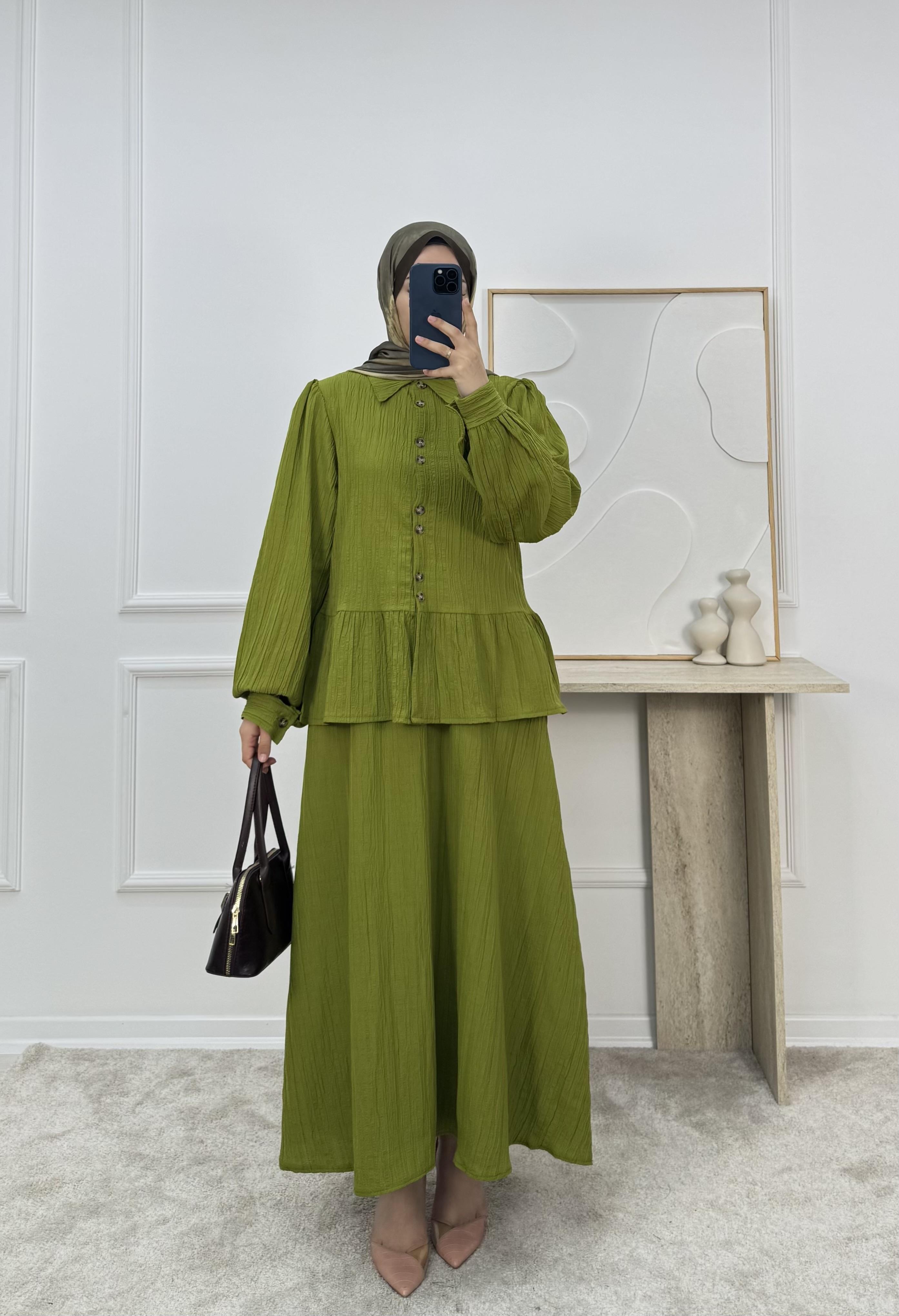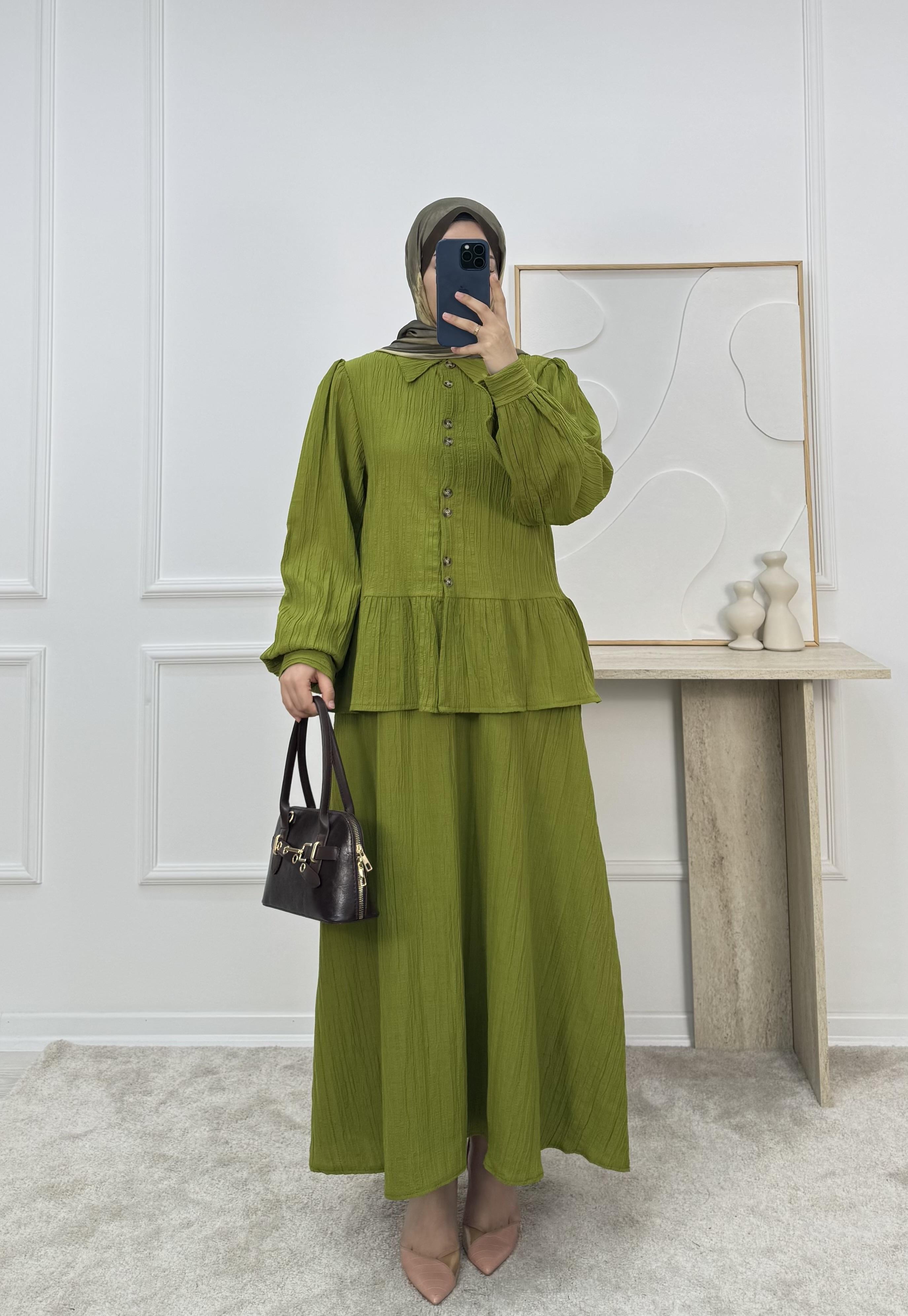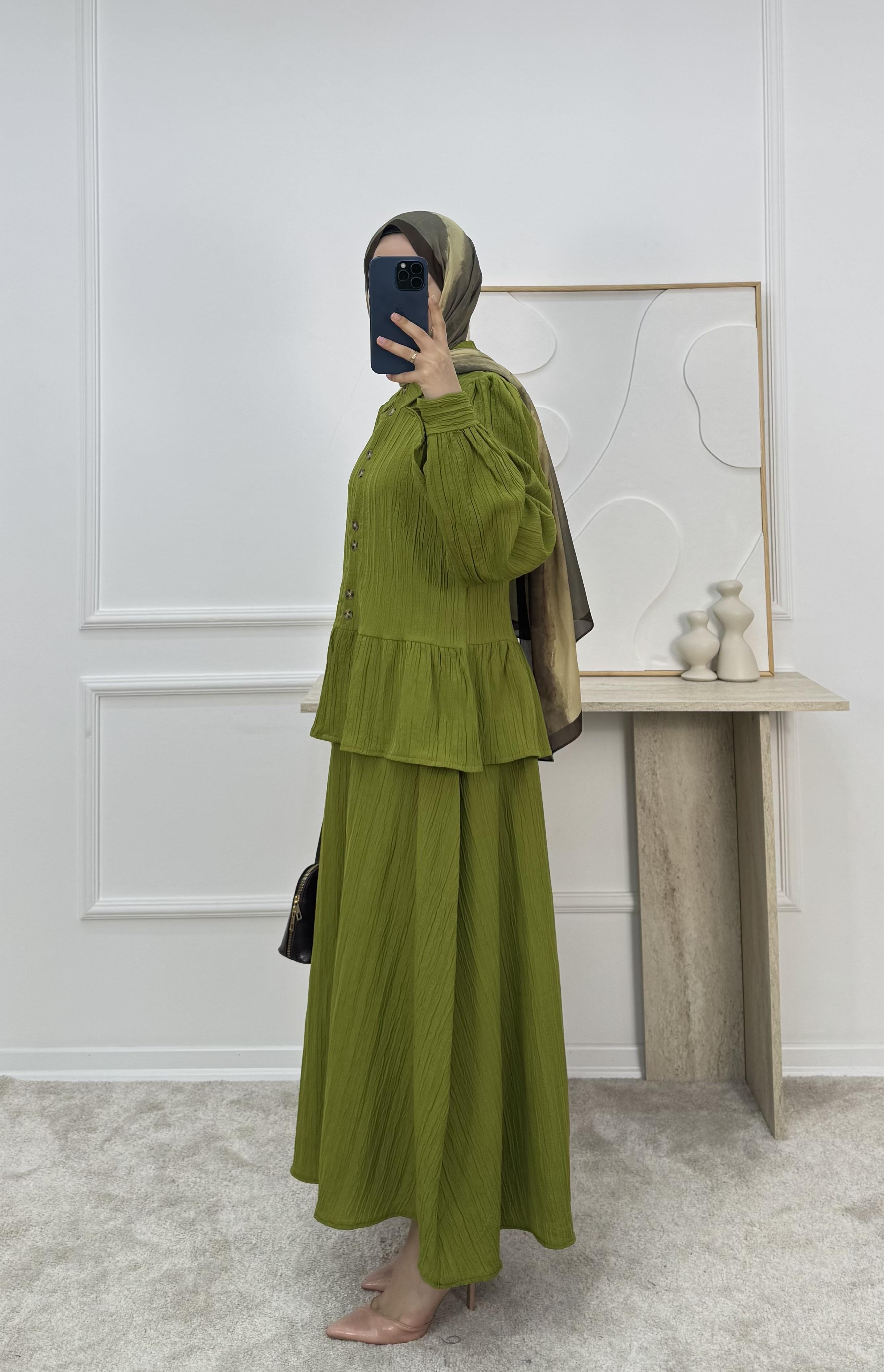 1725-maya kumaş etekli takım-yağ yeşili (1725)
