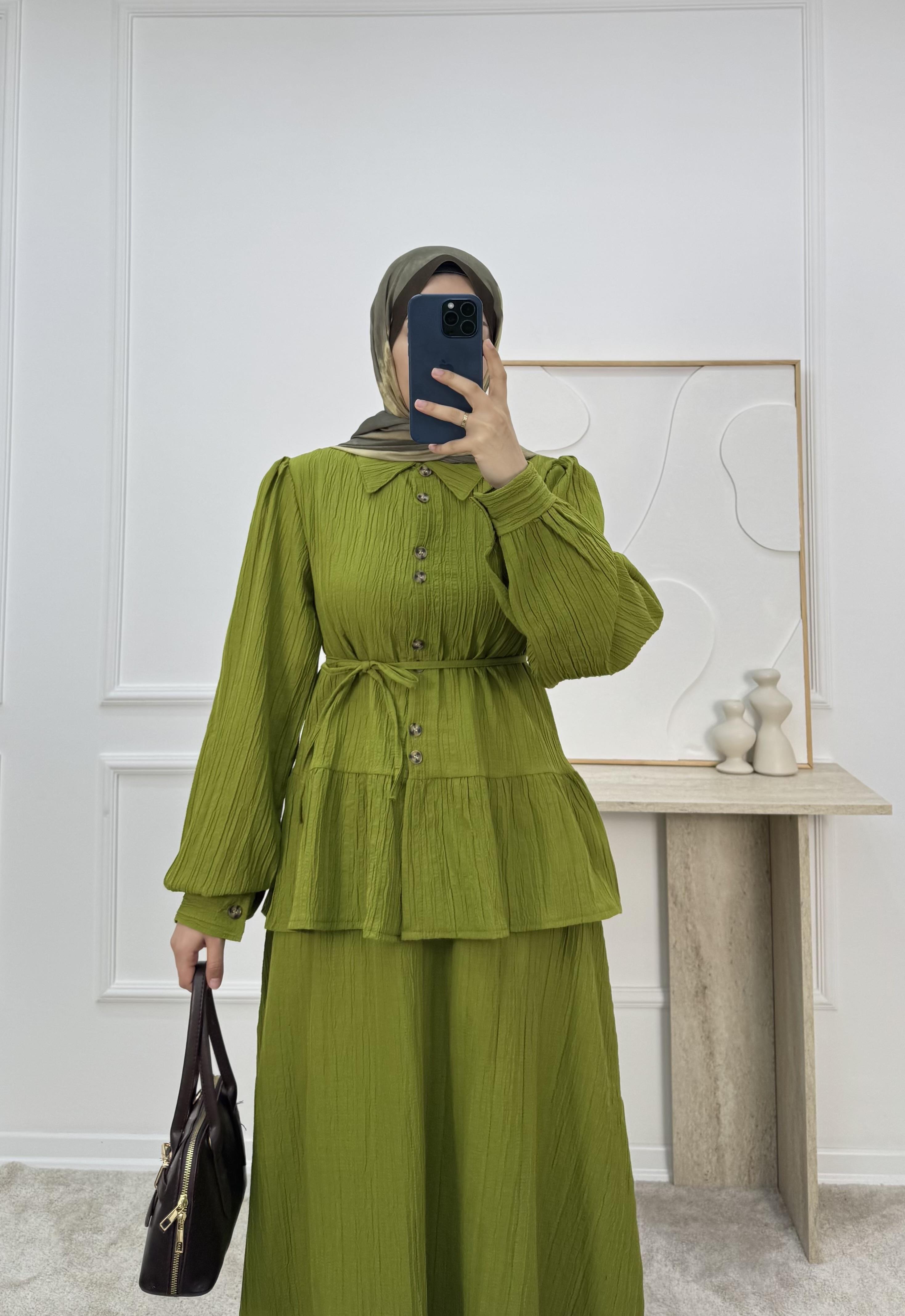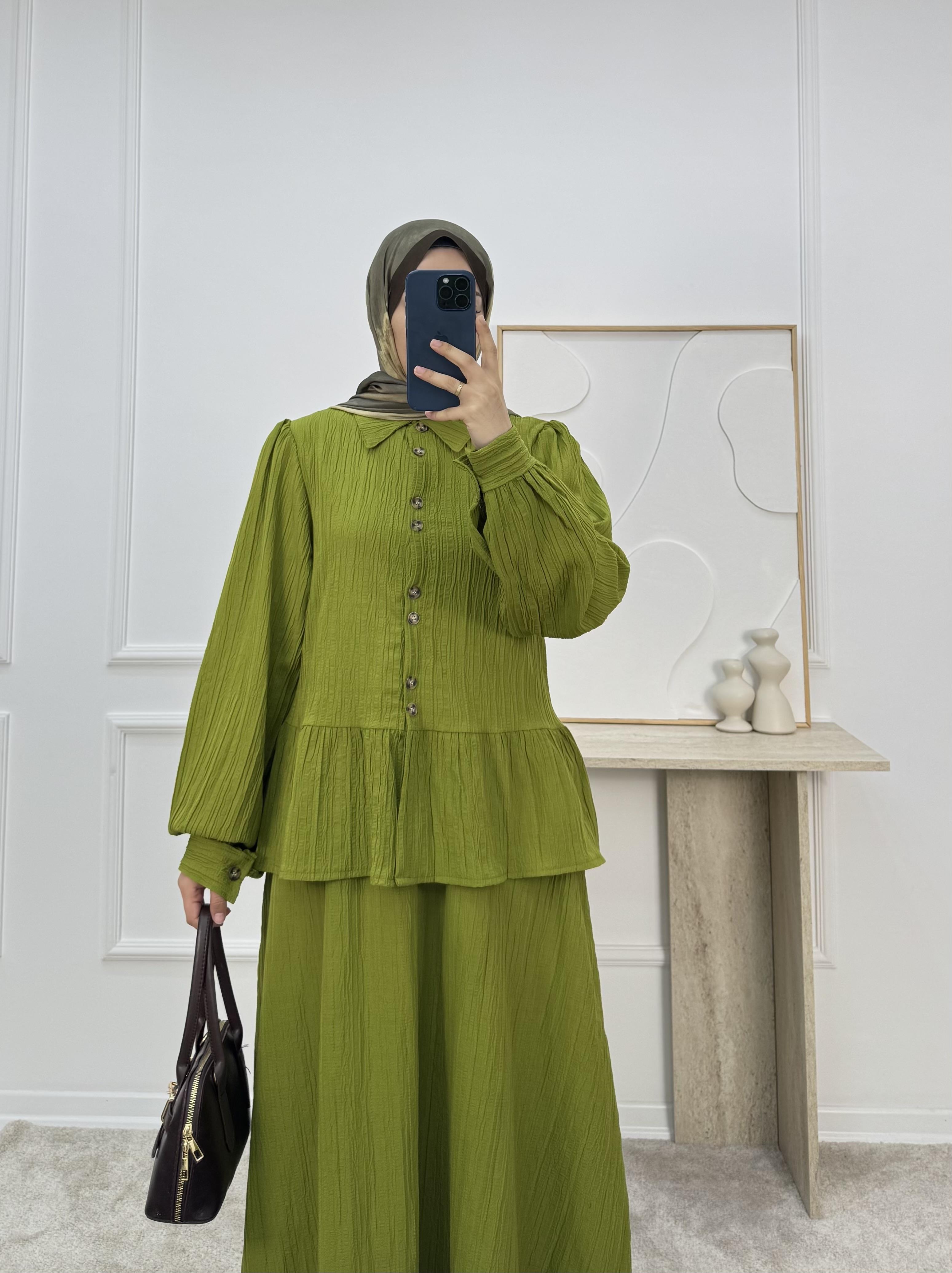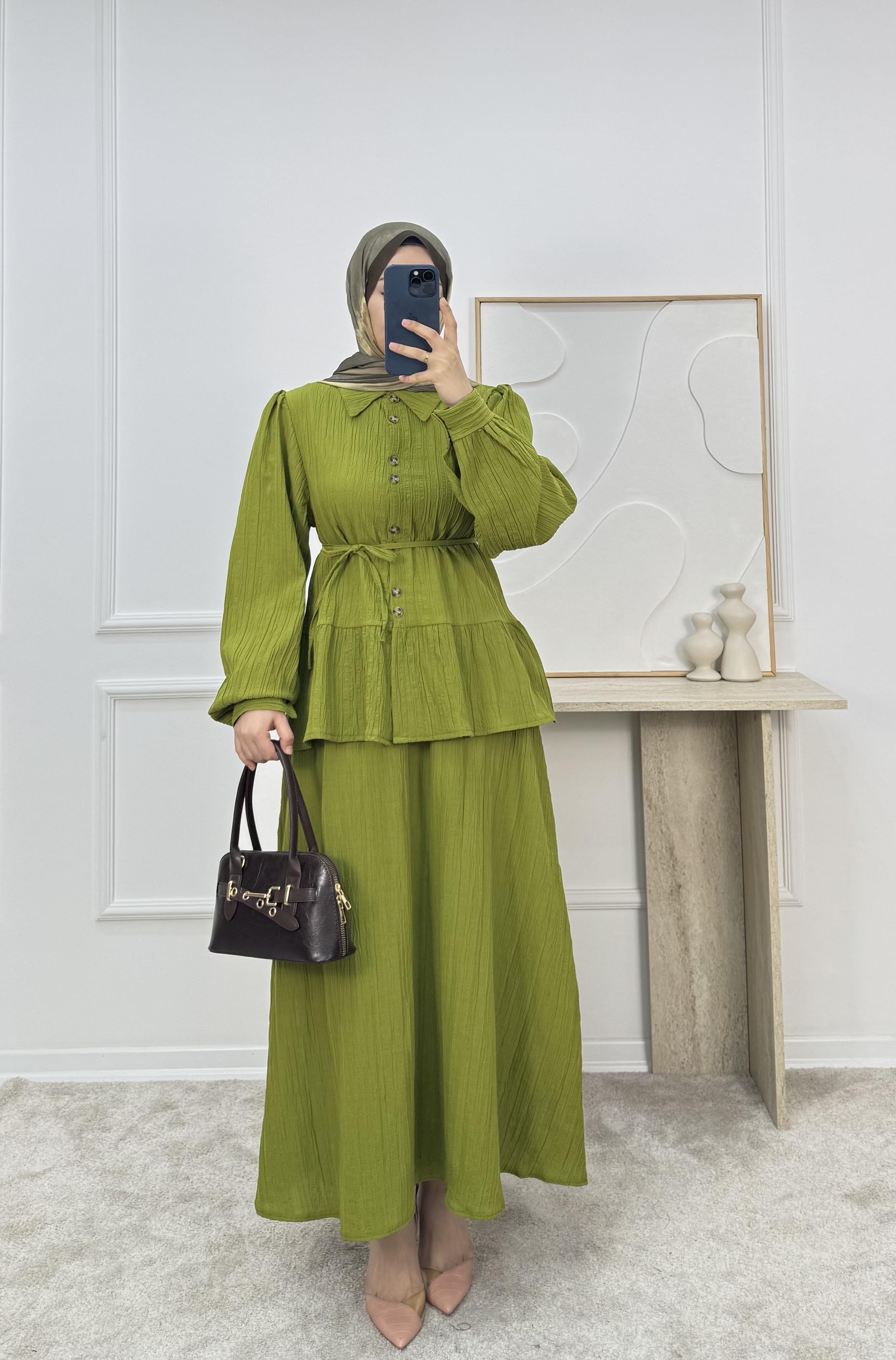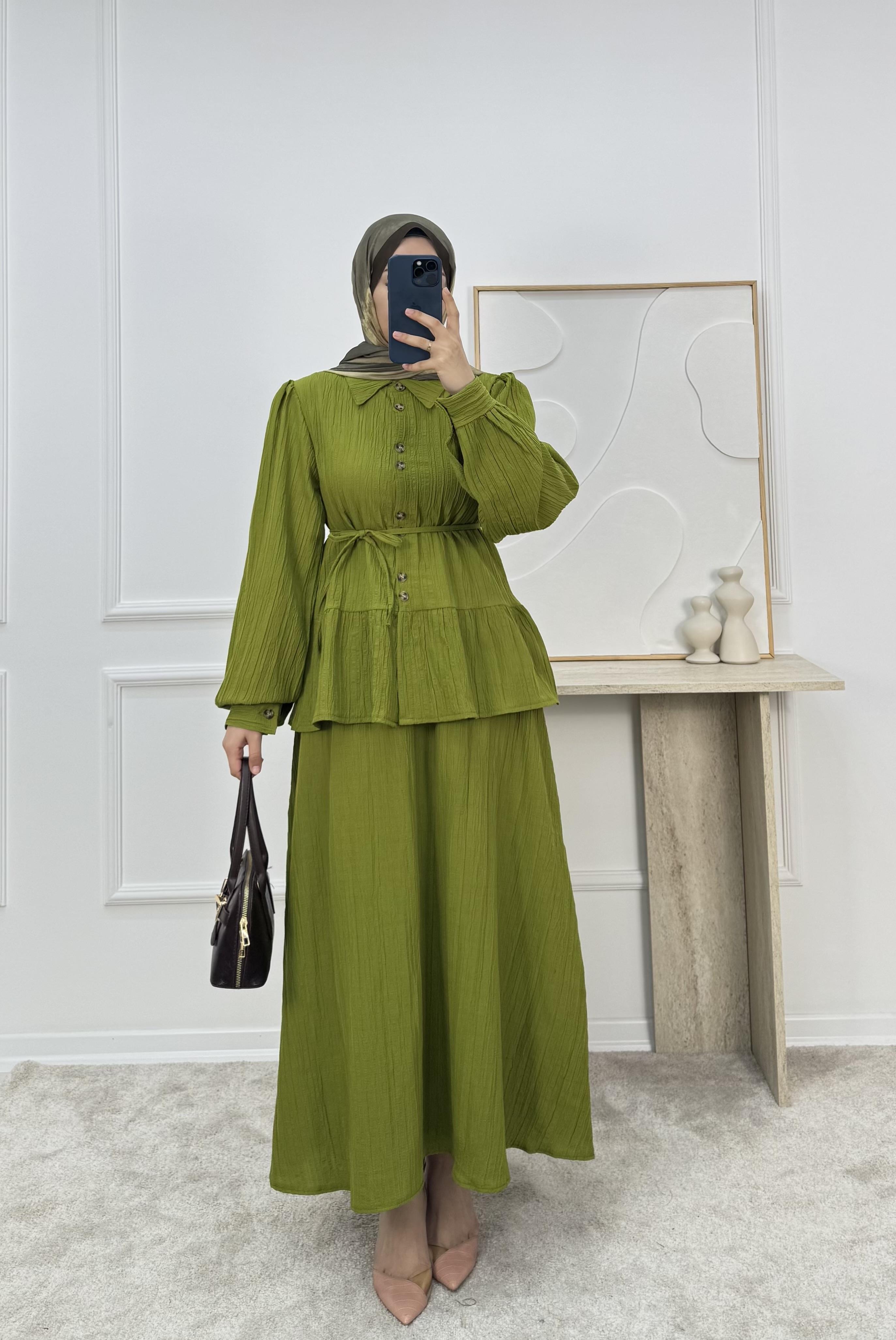 1725-maya kumaş etekli takım-yağ yeşili (1725)