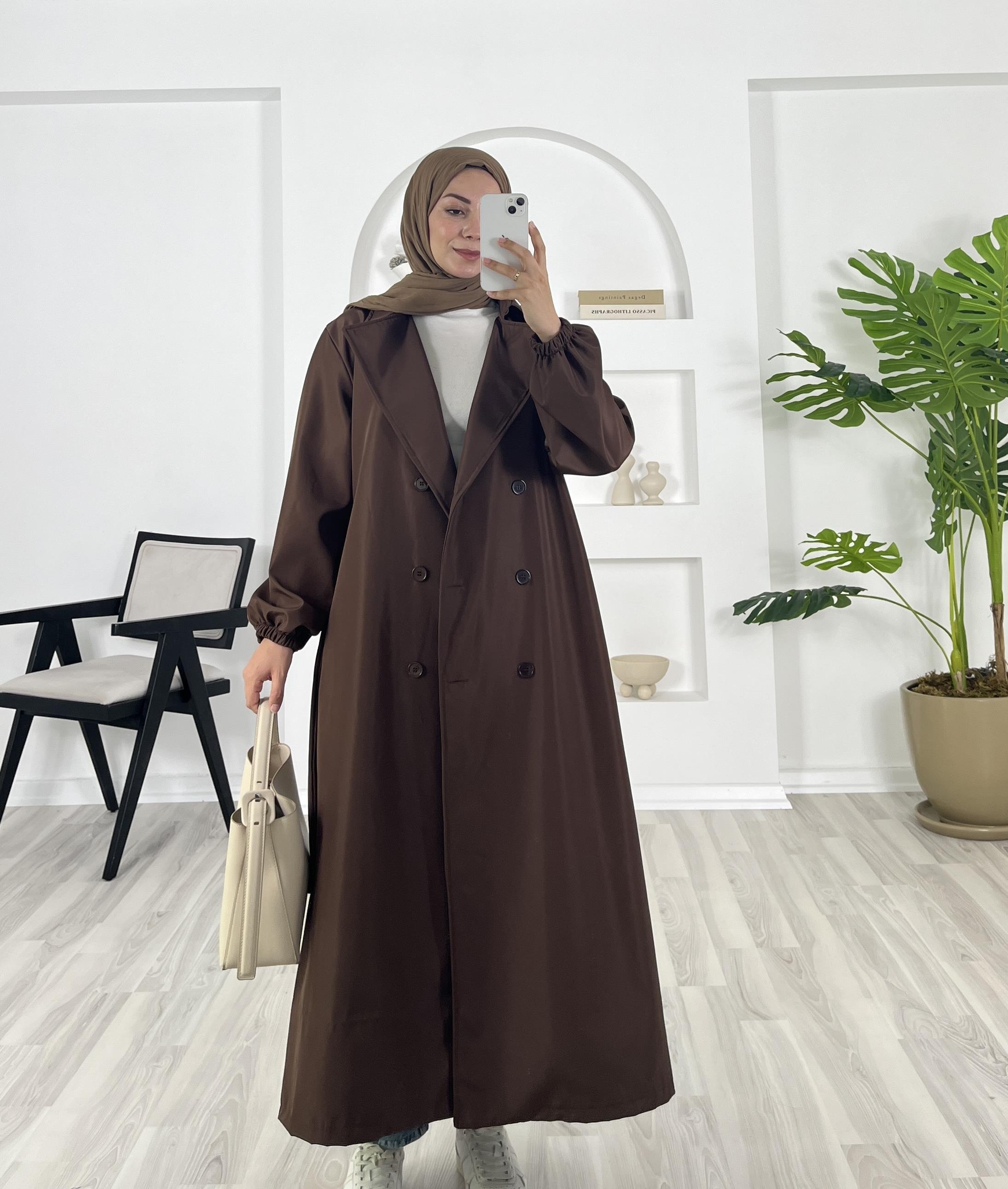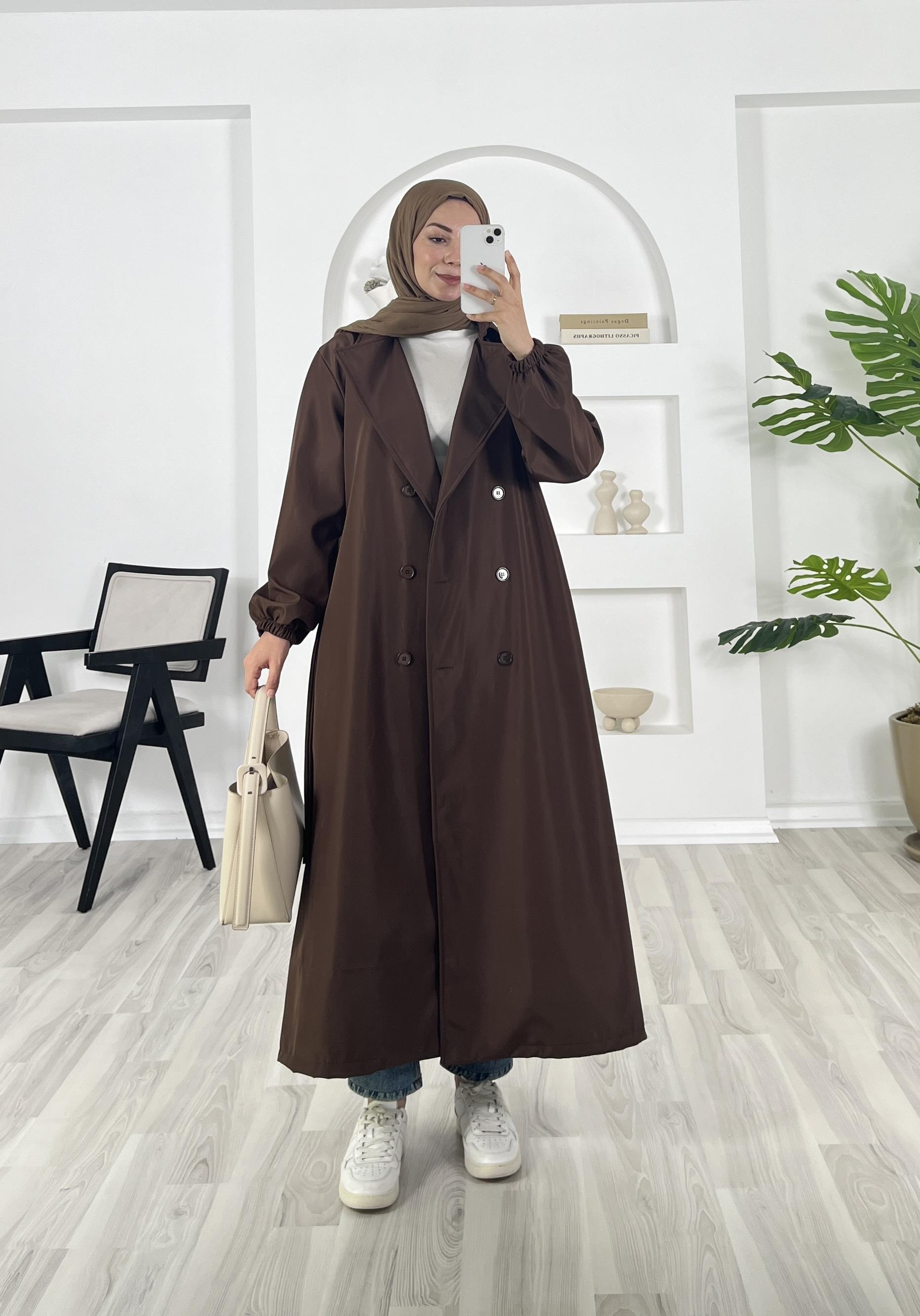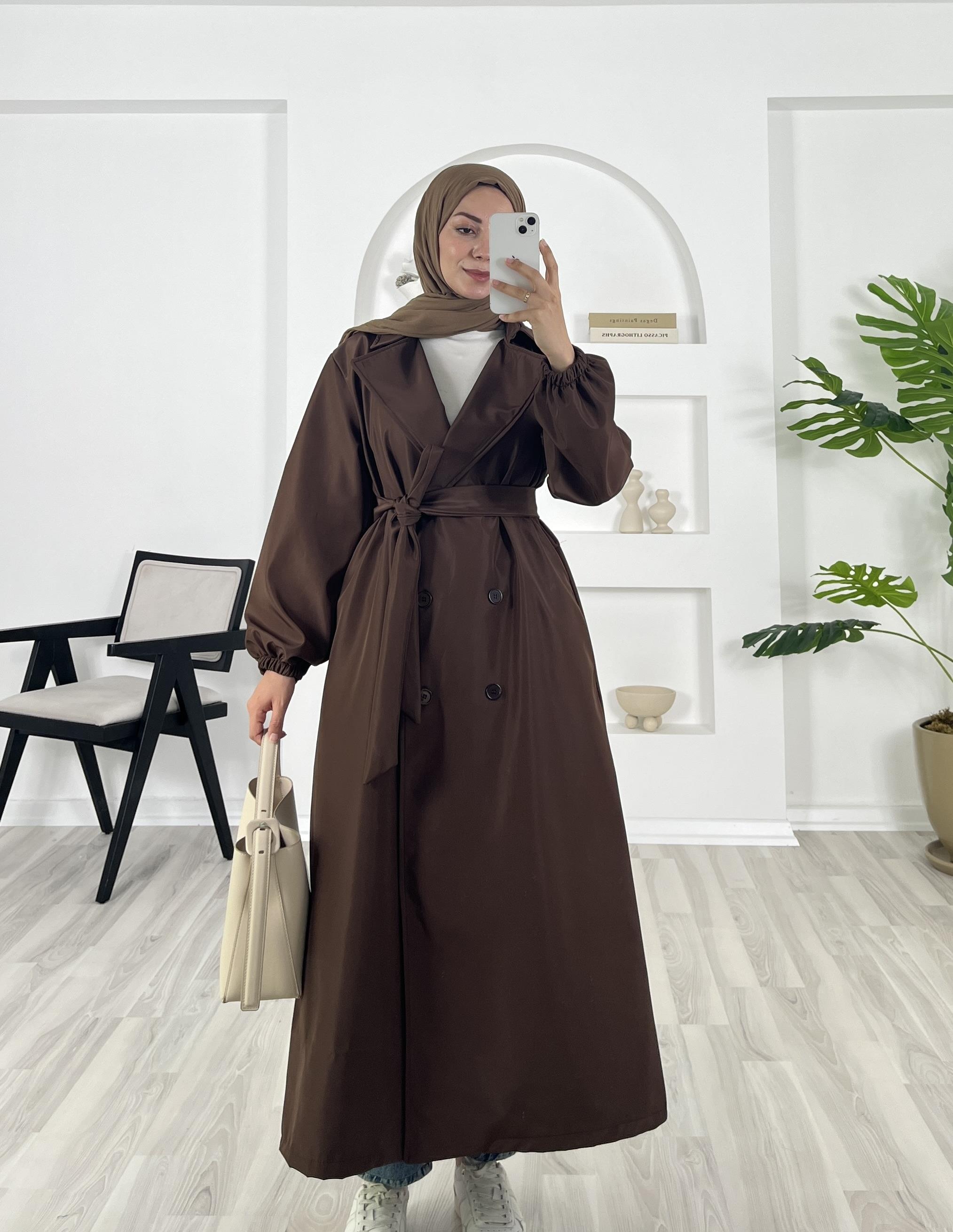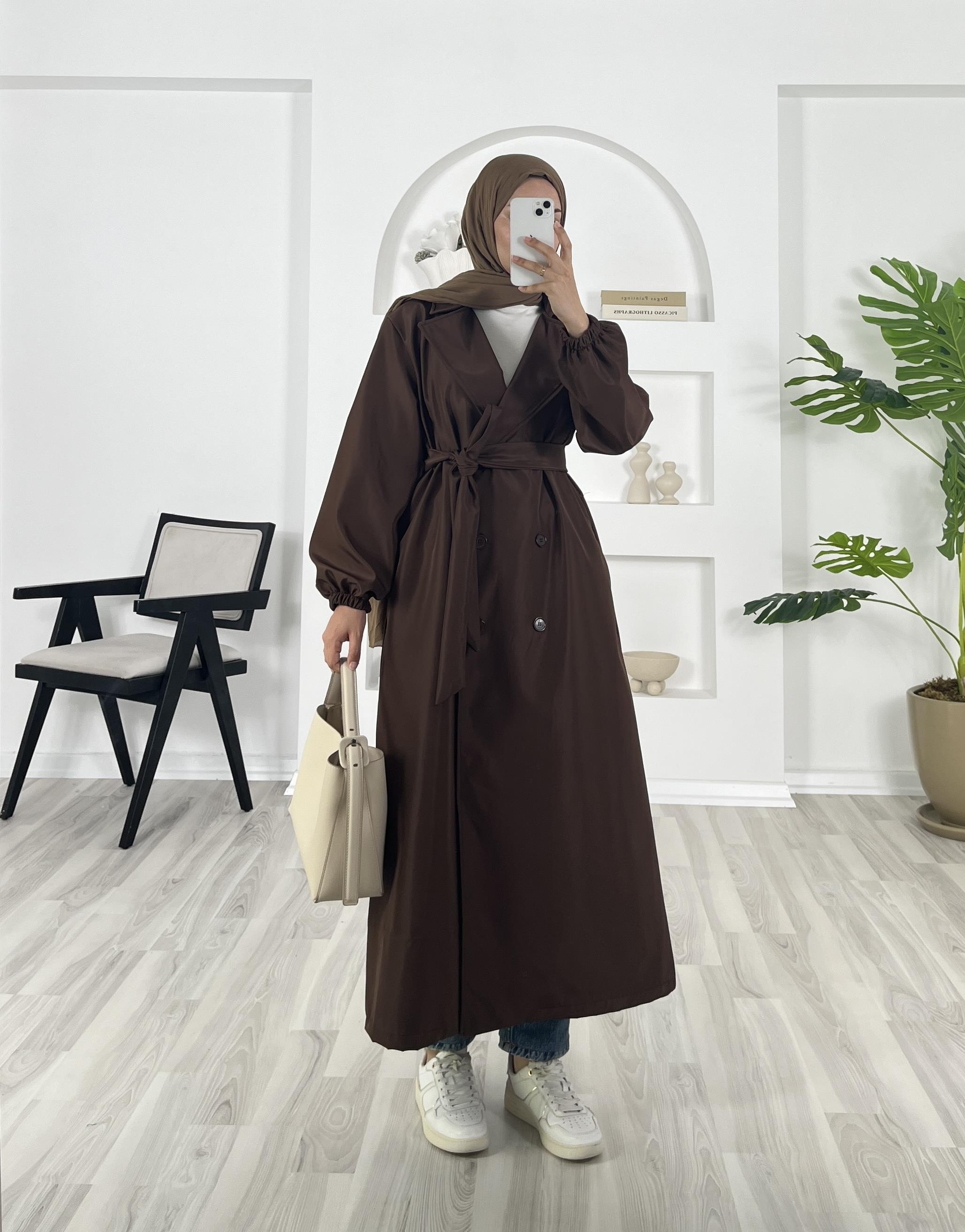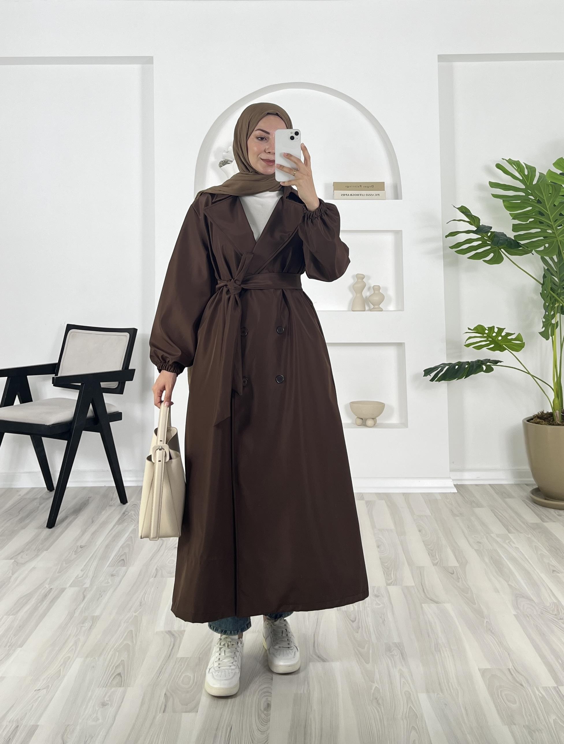 1749-bondit kumaş-bilek ucu lastikli kemerli trenç-acı kahve (1749)