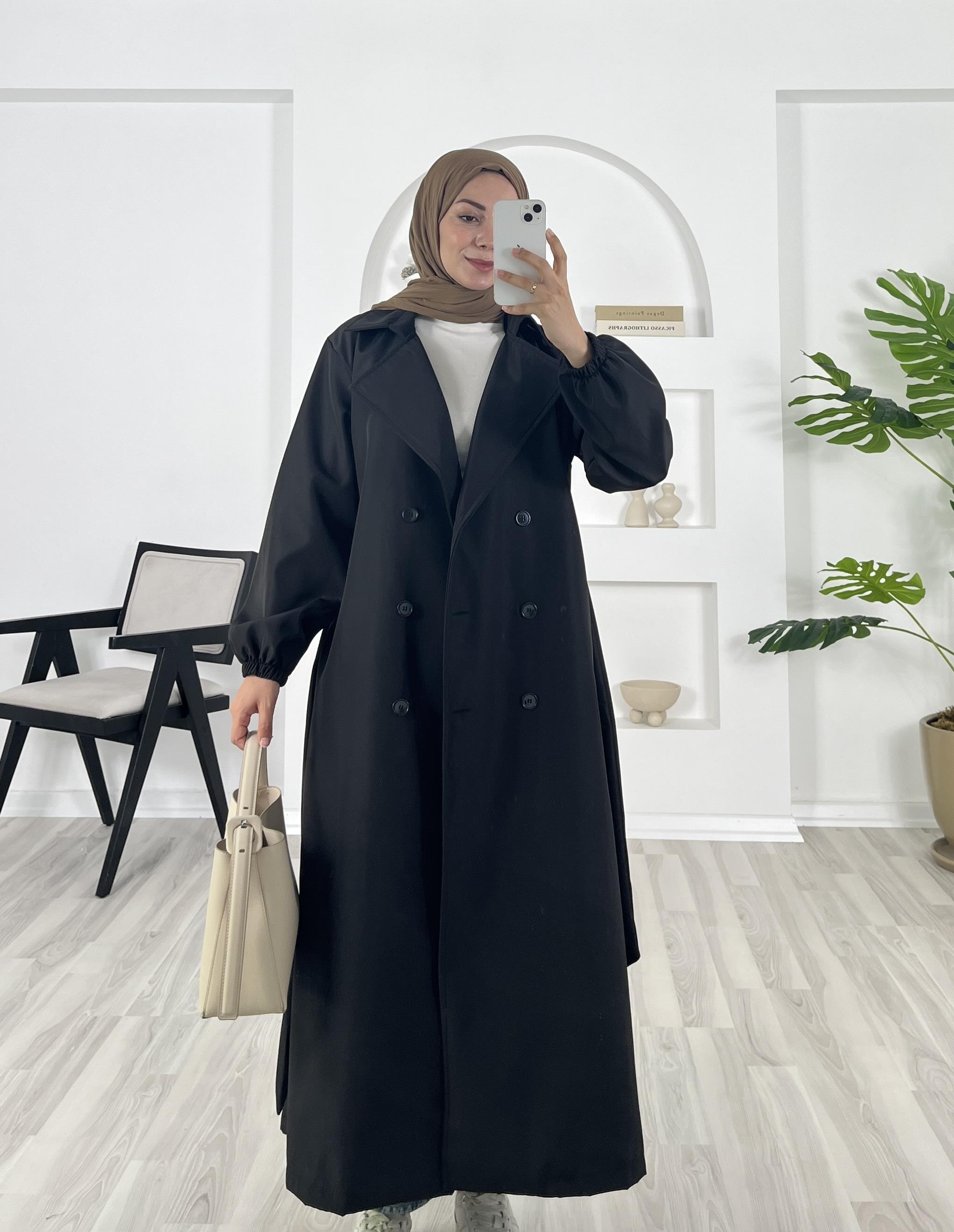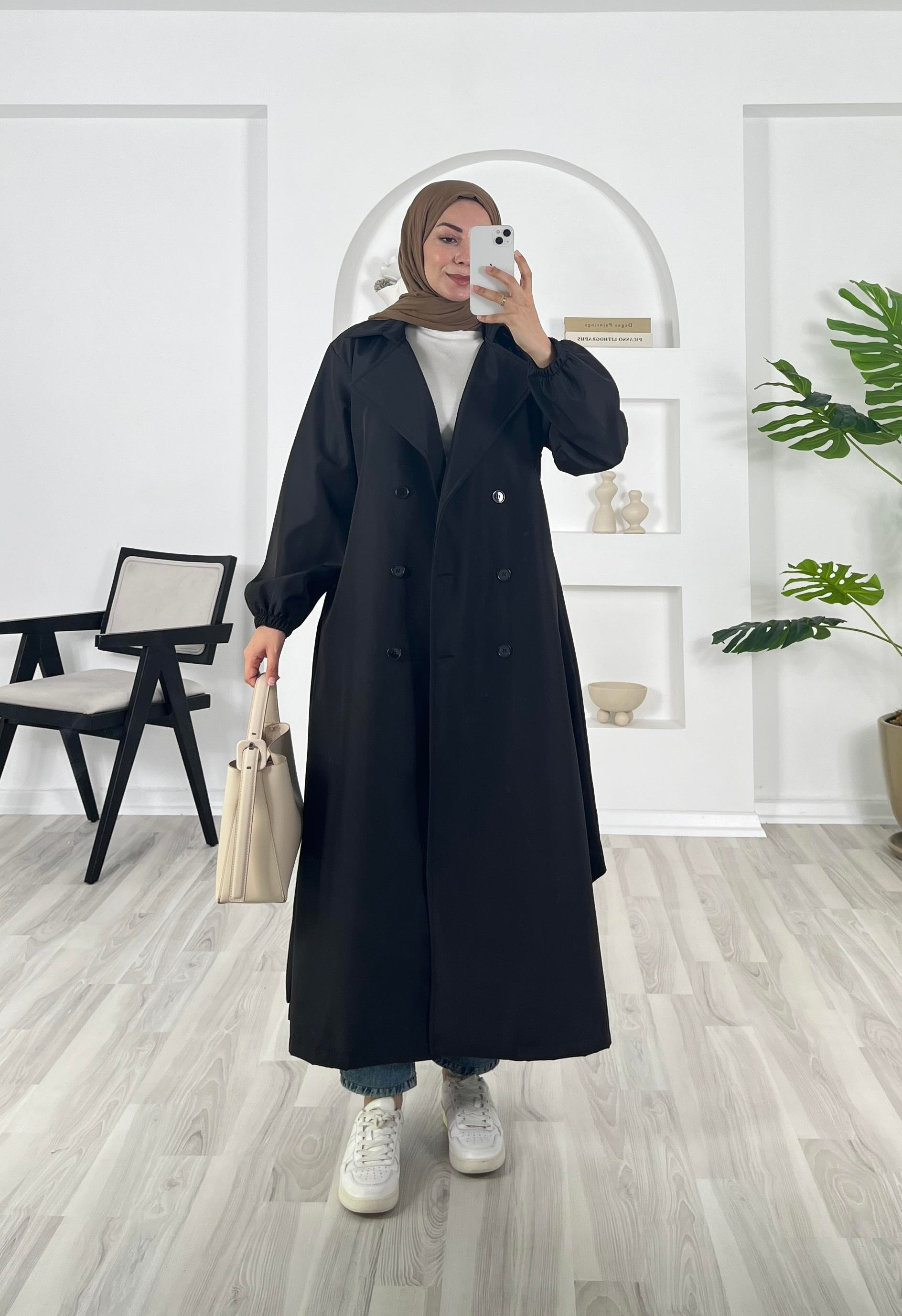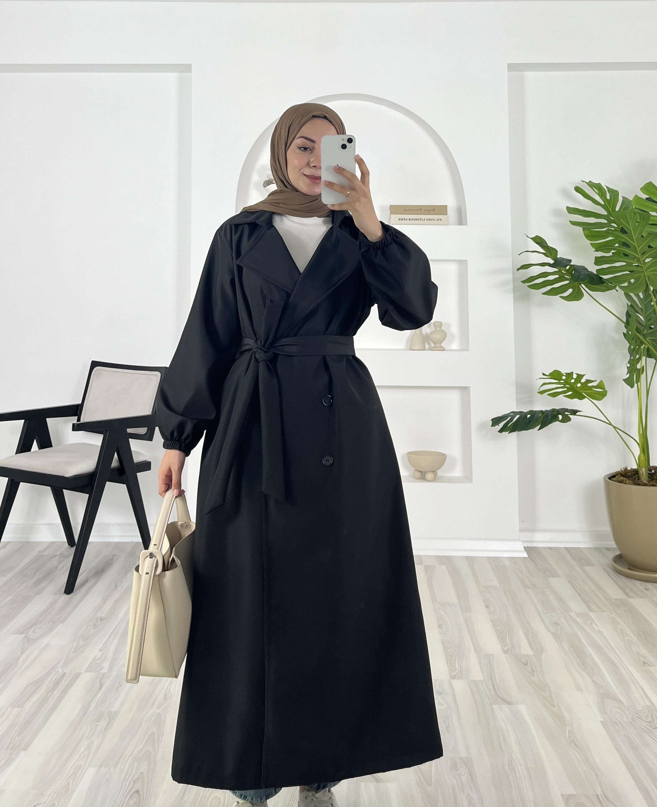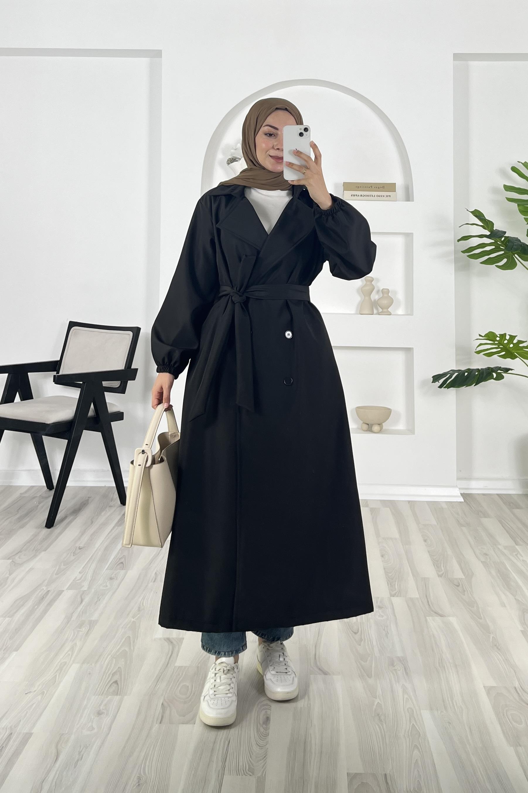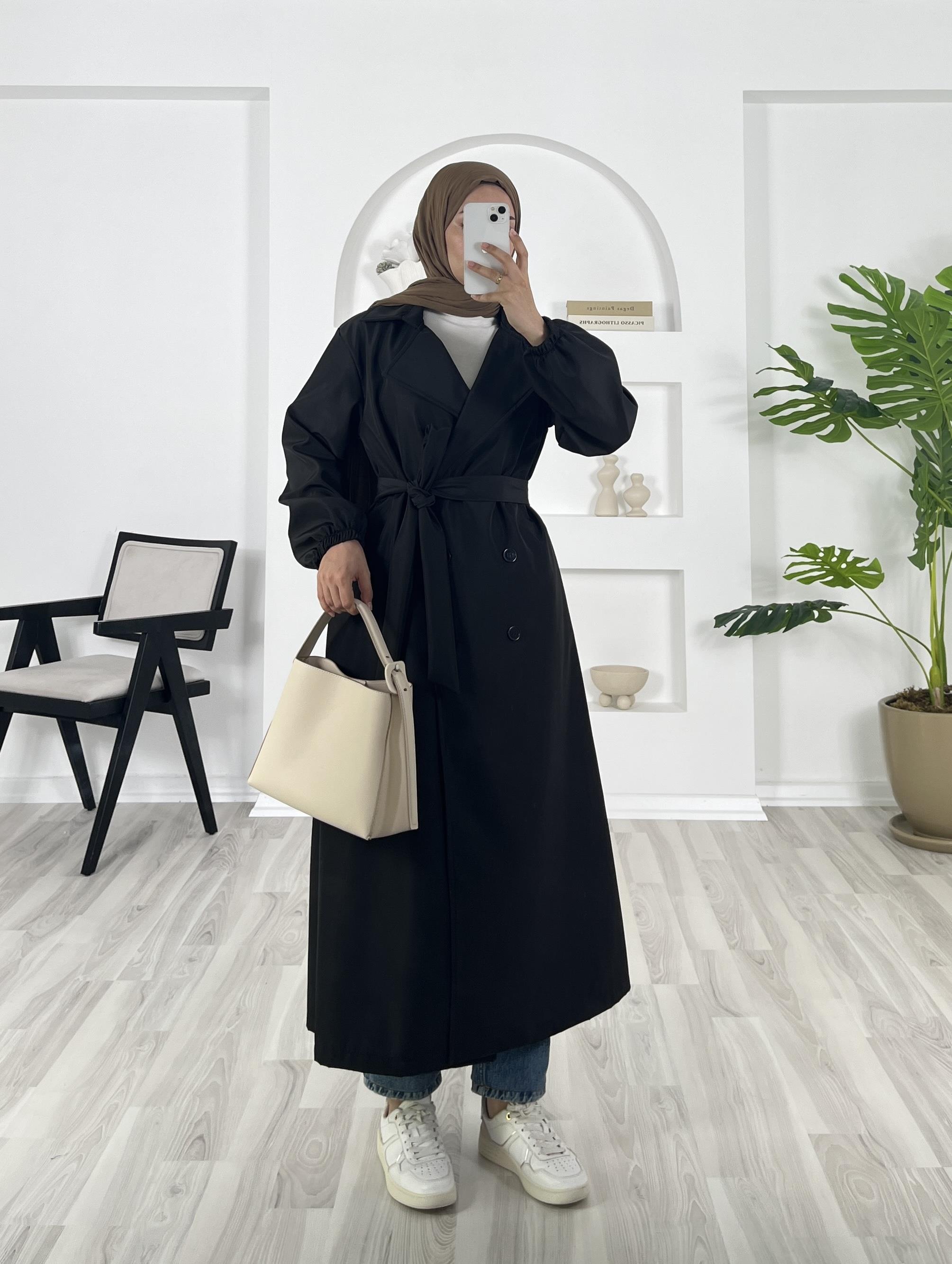 1749-bondit kumaş-bilek ucu lastikli kemerli trenç-siyah (1749)