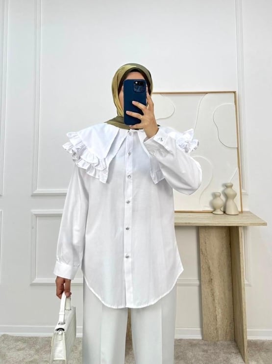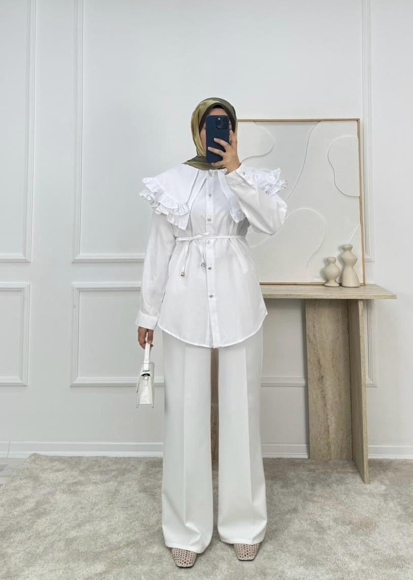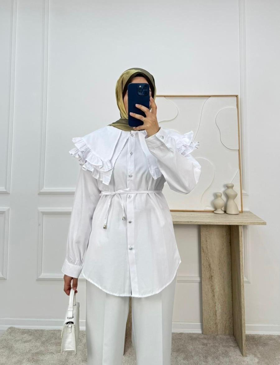 1854-terikoton kumaş yakalı kuşaklı gömlek-beyaz (1854)