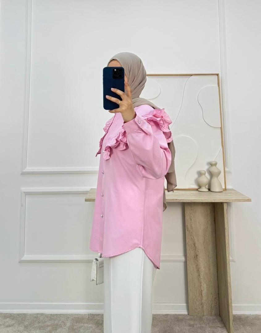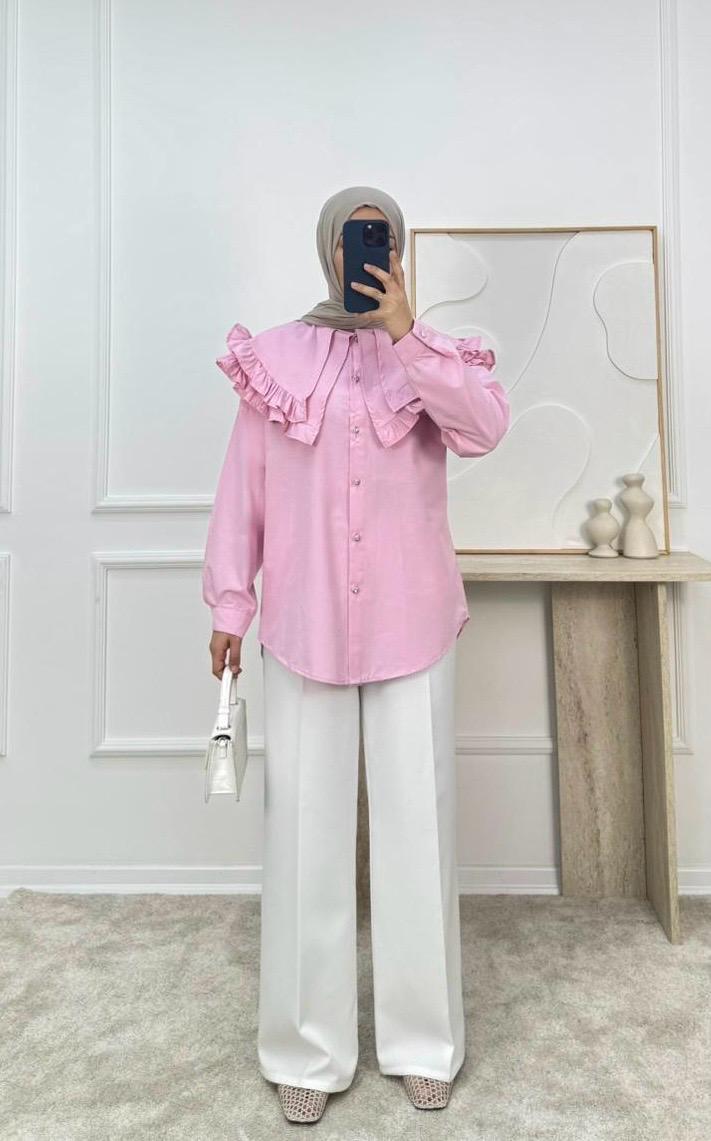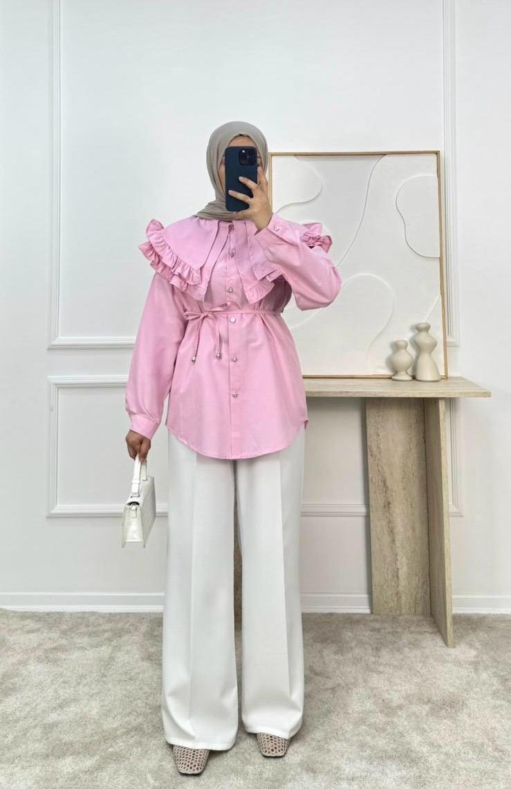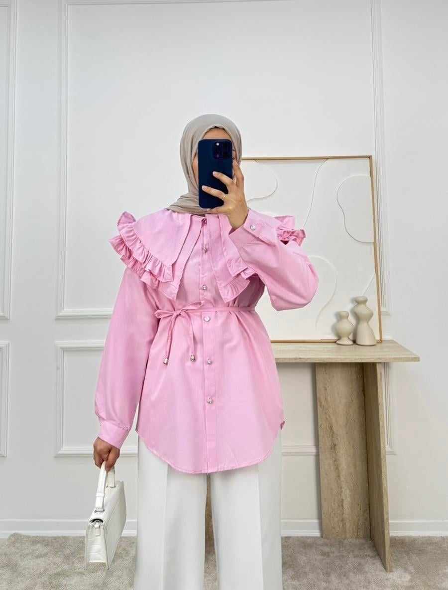 1854-terikoton kumaş yakalı kuşaklı gömlek-pembe (1854)