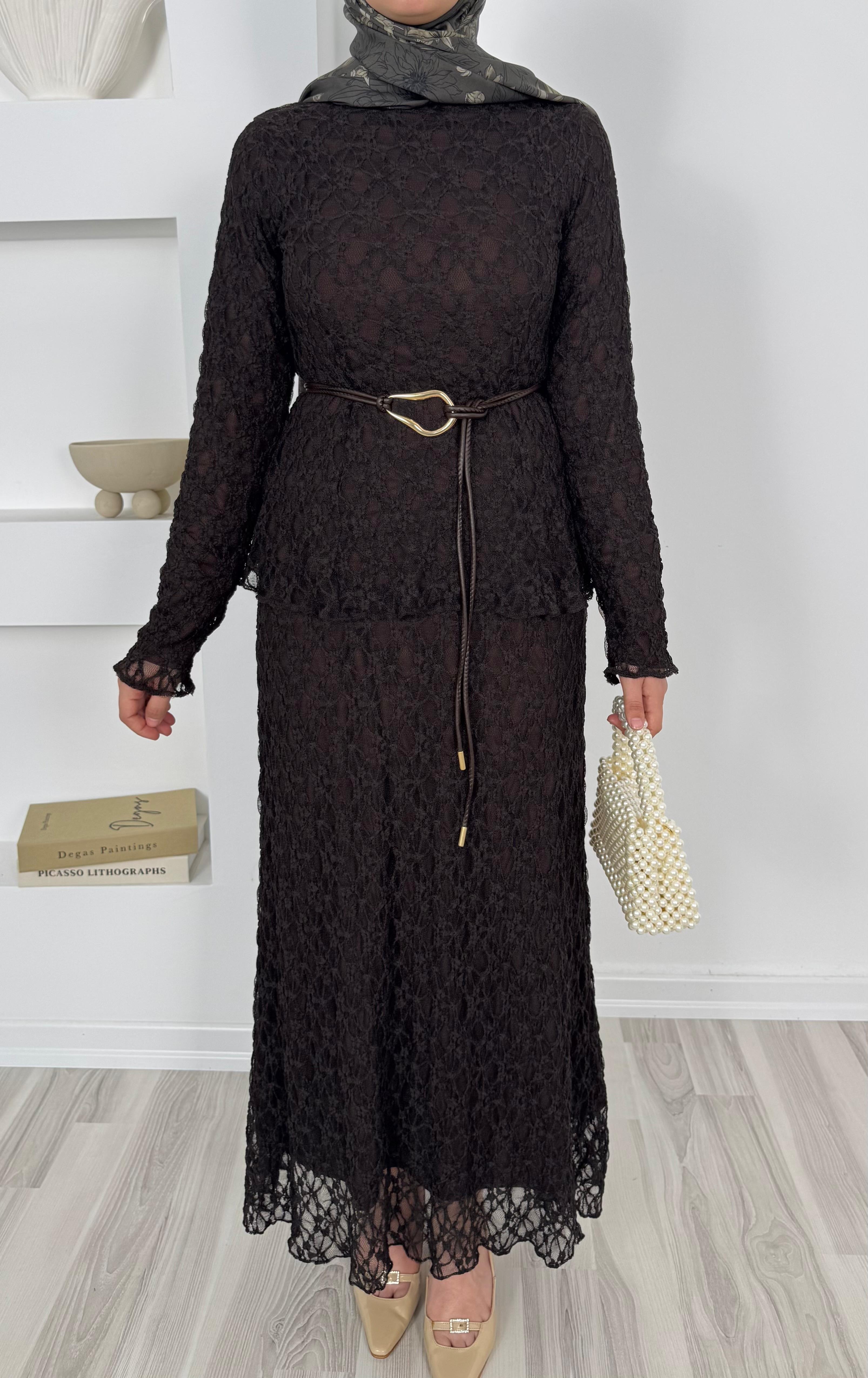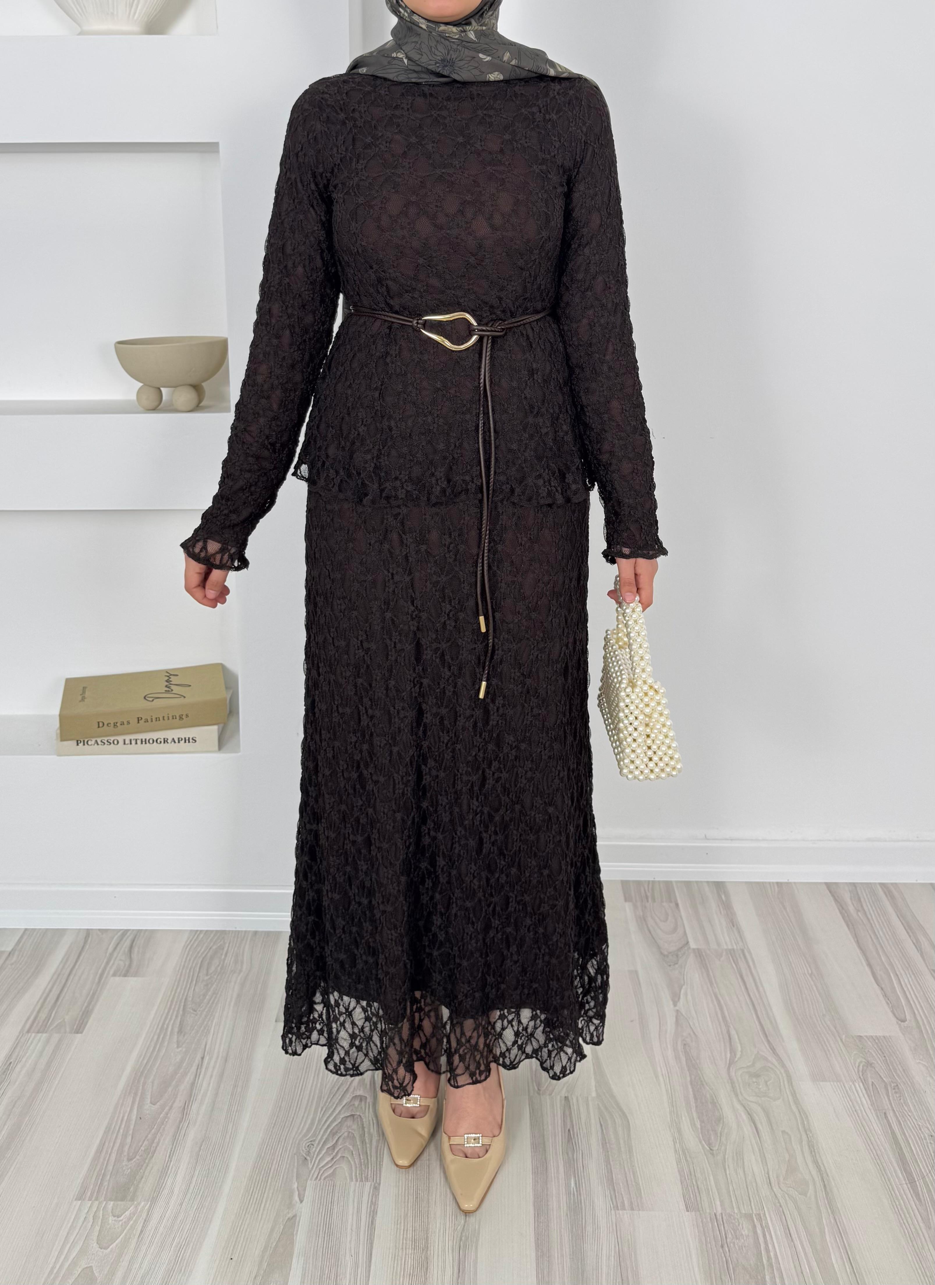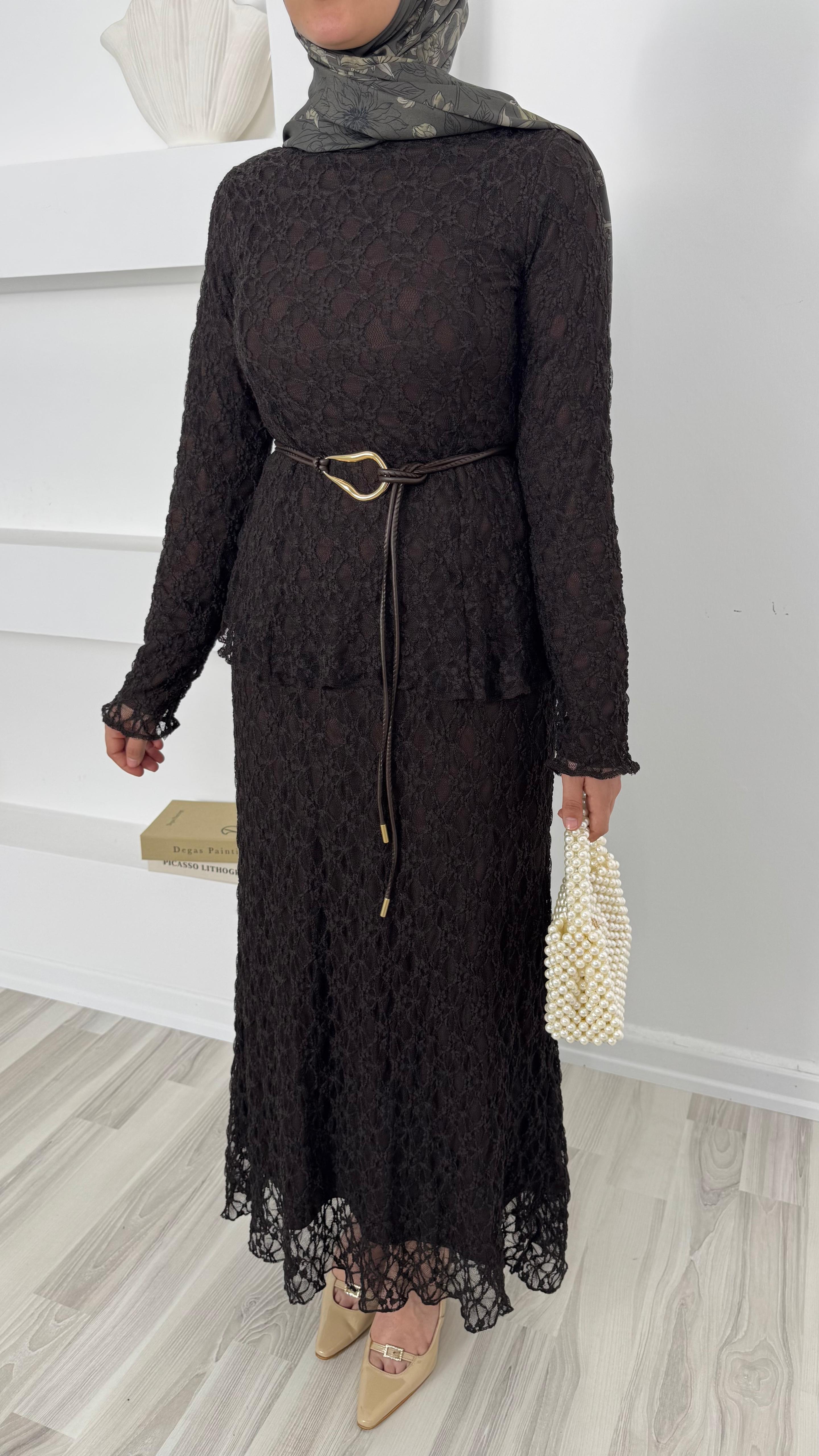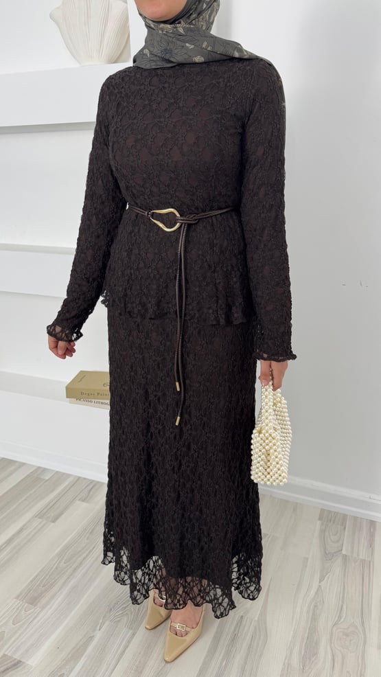 dantel işlemeli kemerli etekli takım