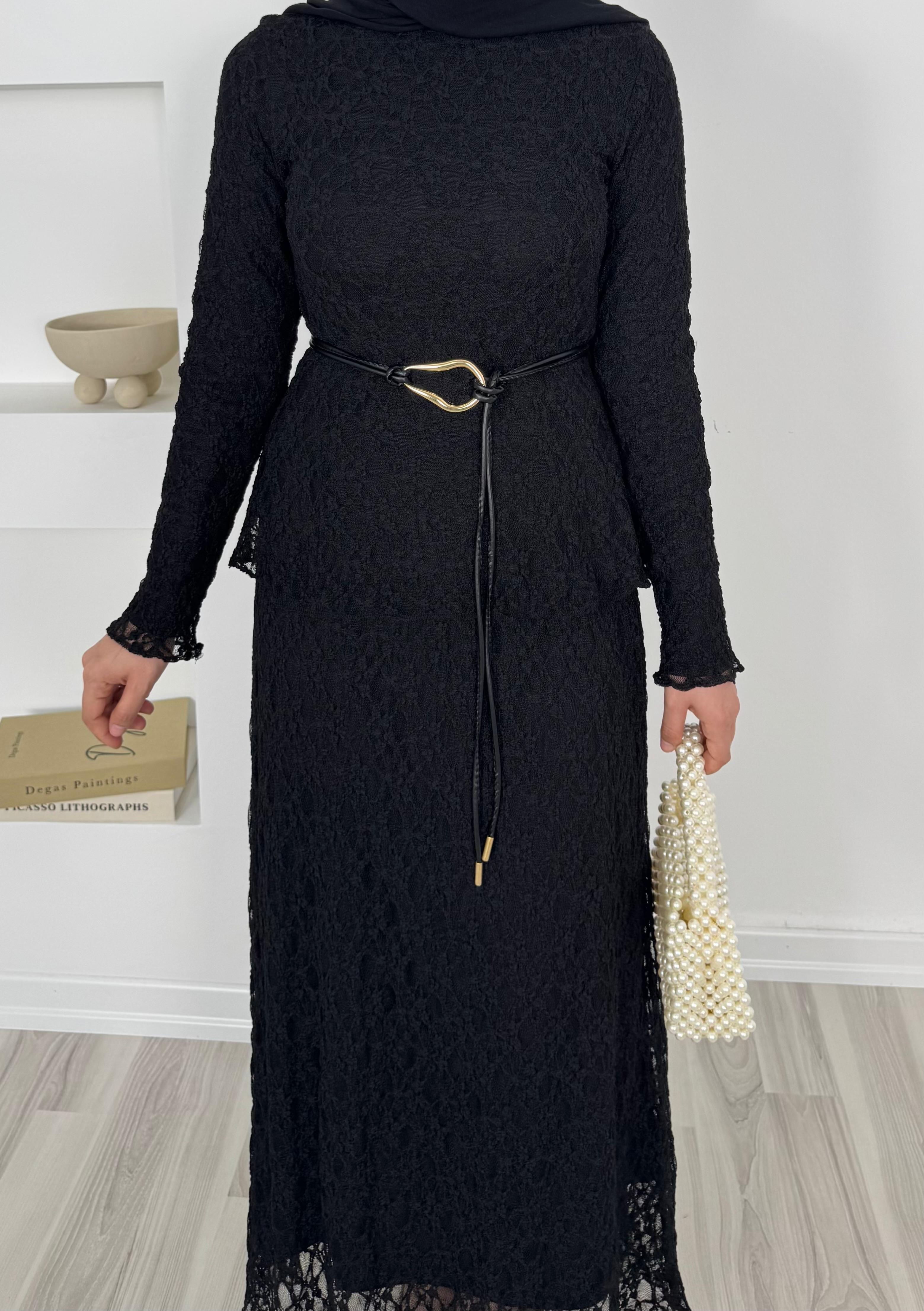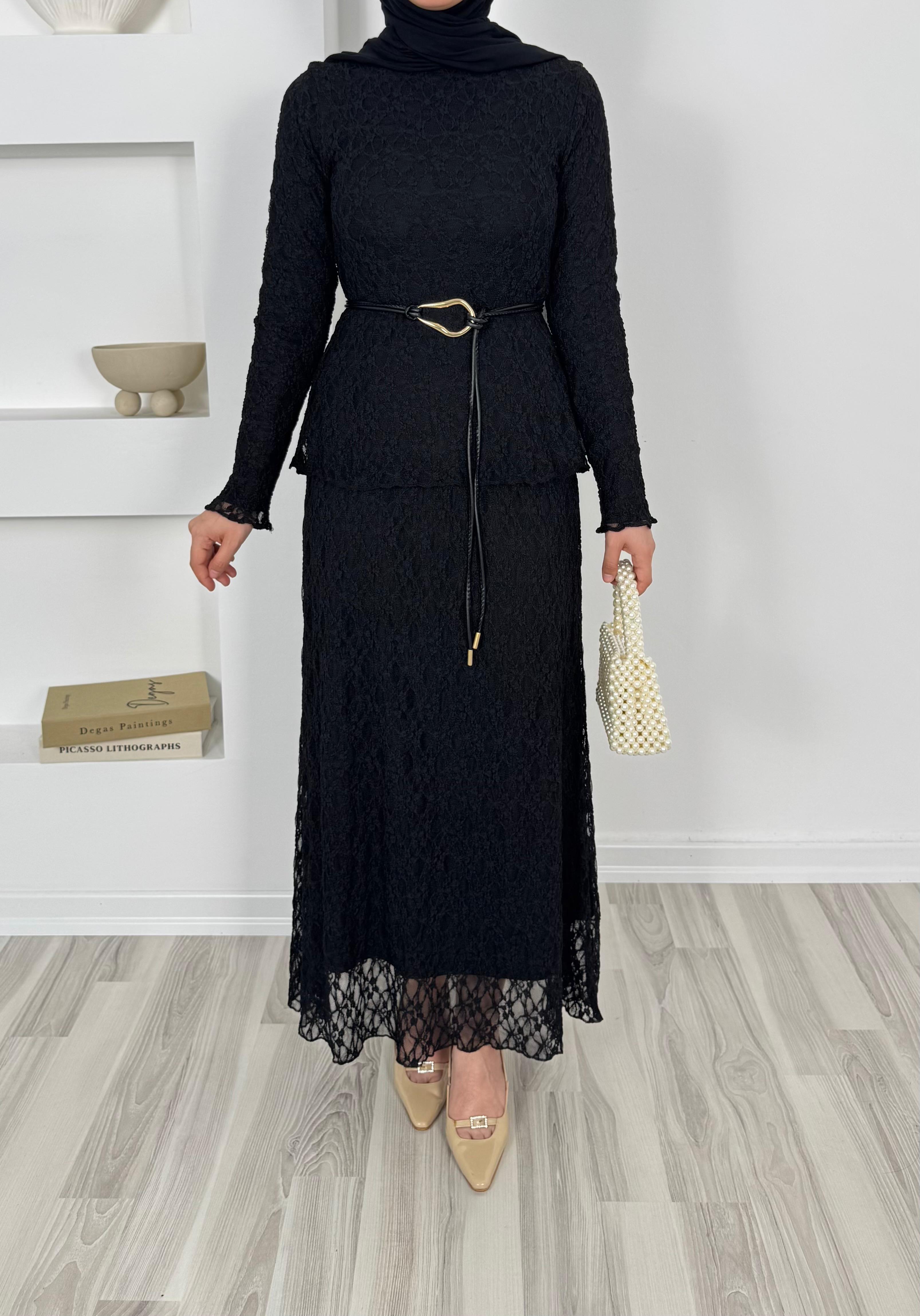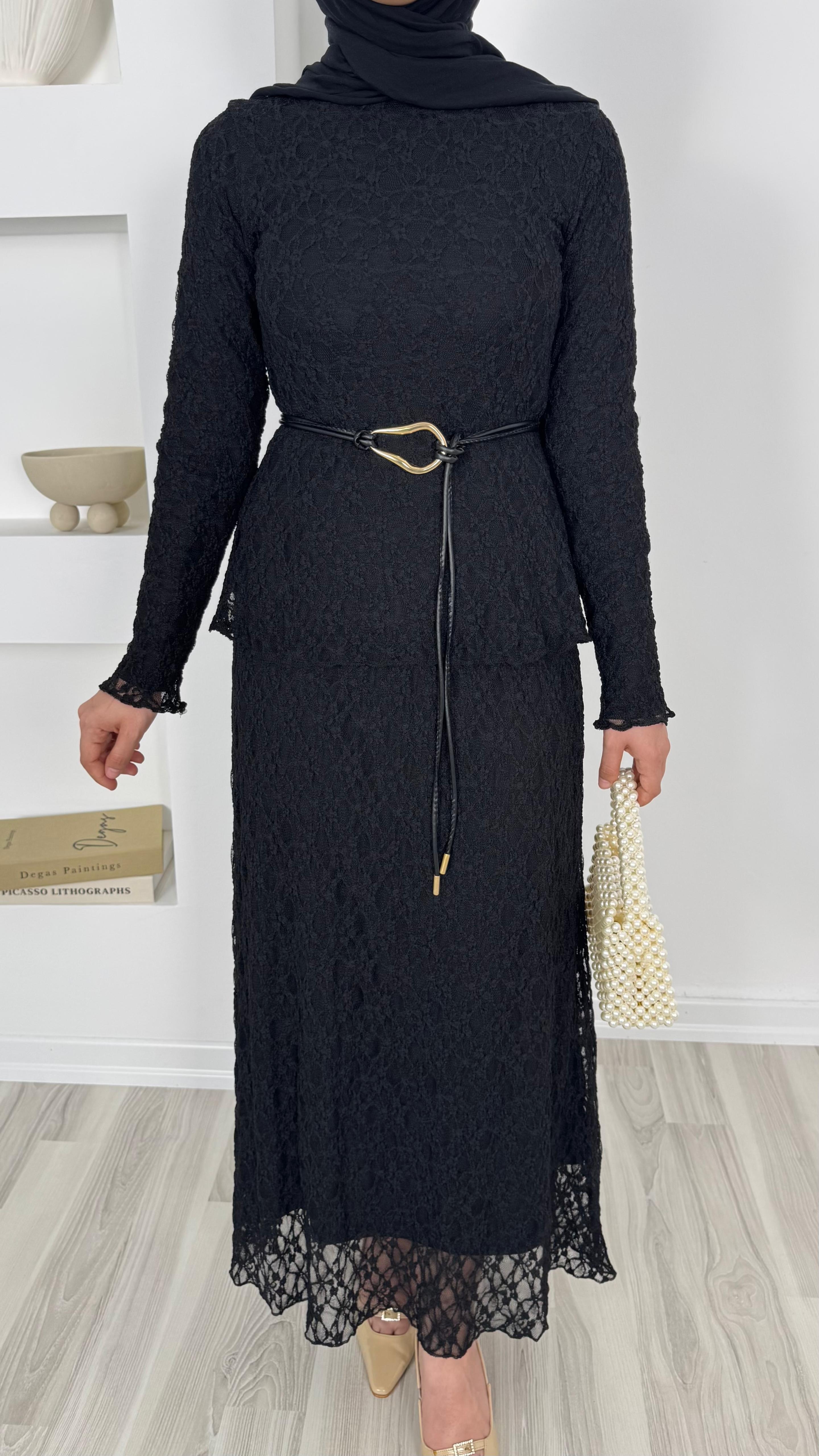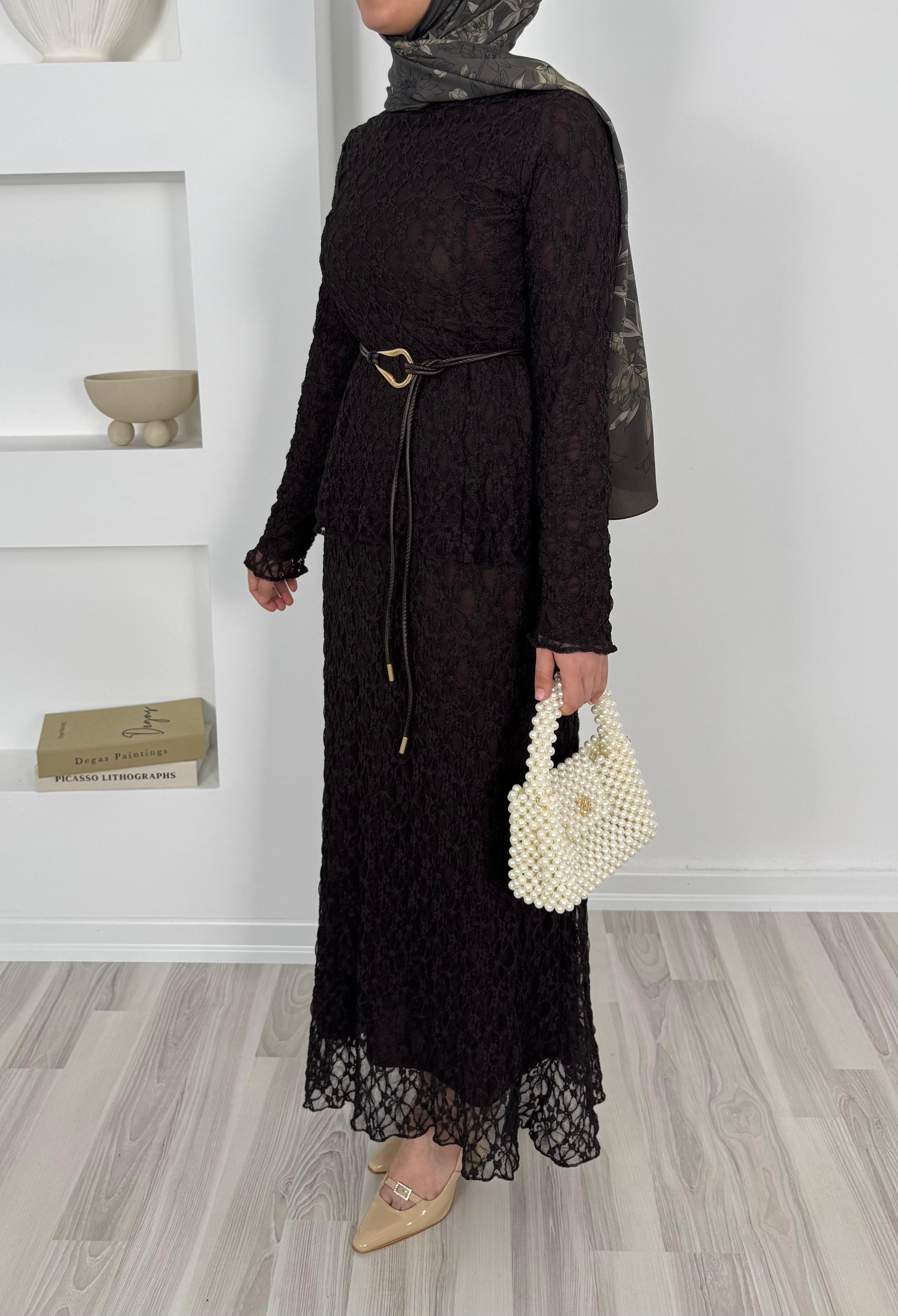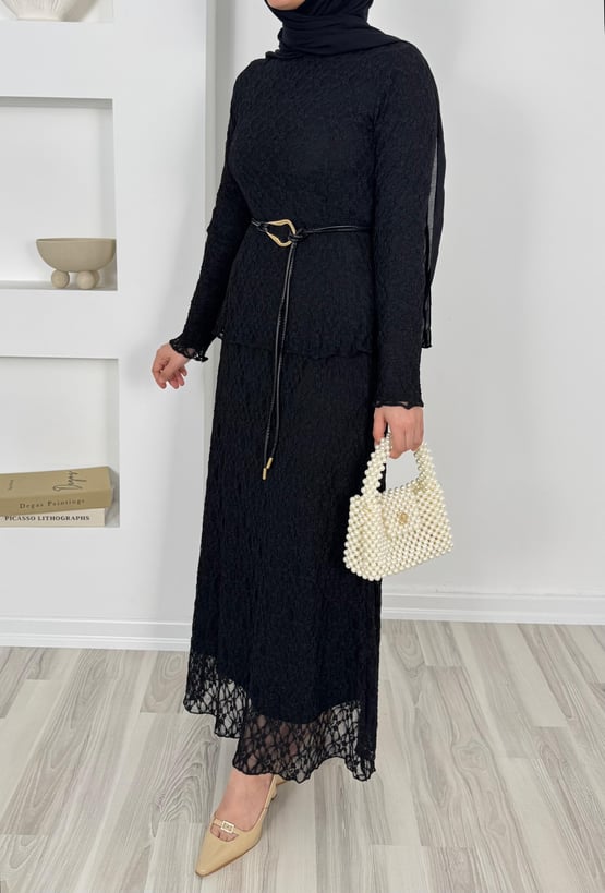 1859-dantel işlemeli kemerli etekli takım-siyah (1859)