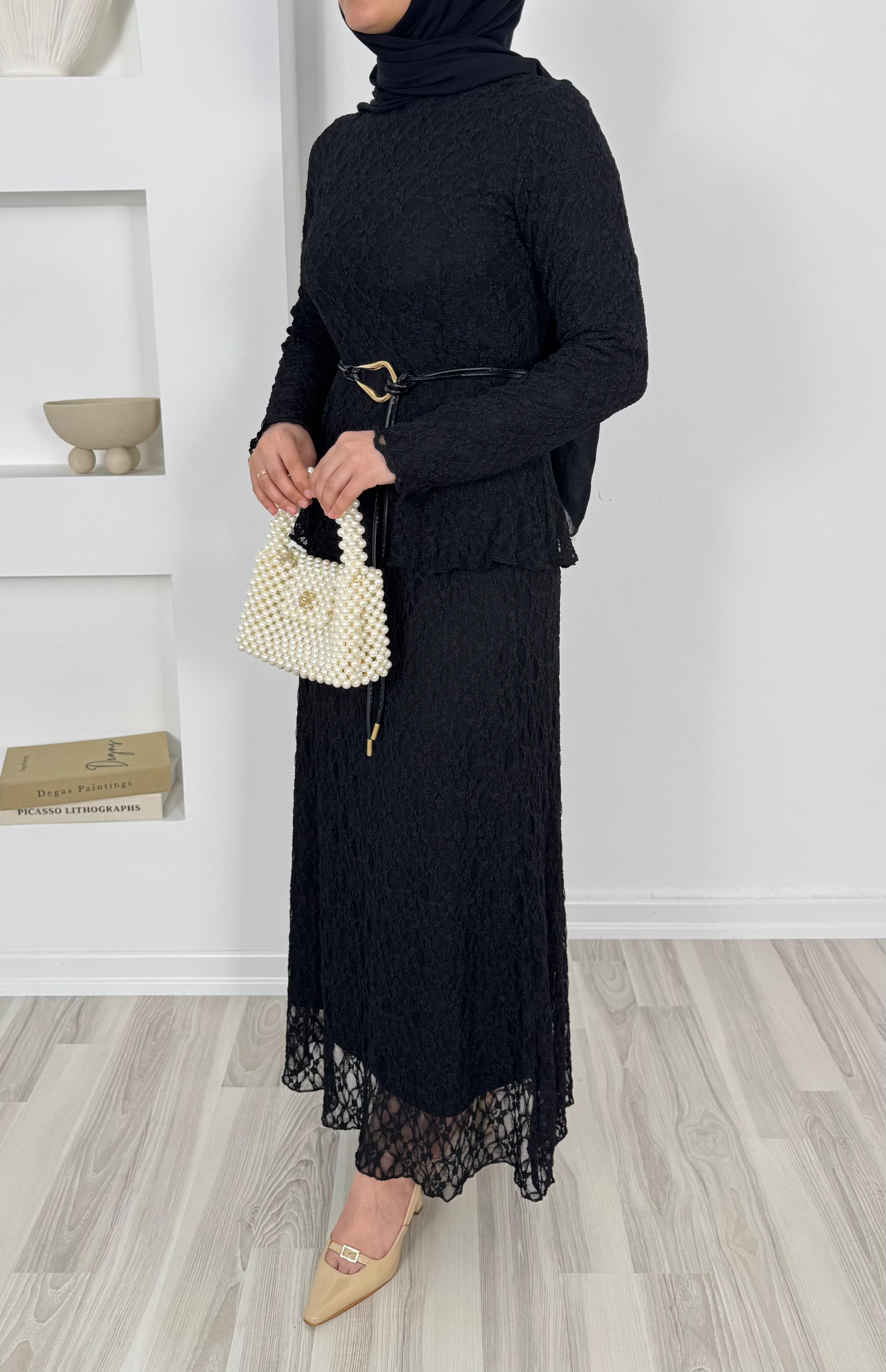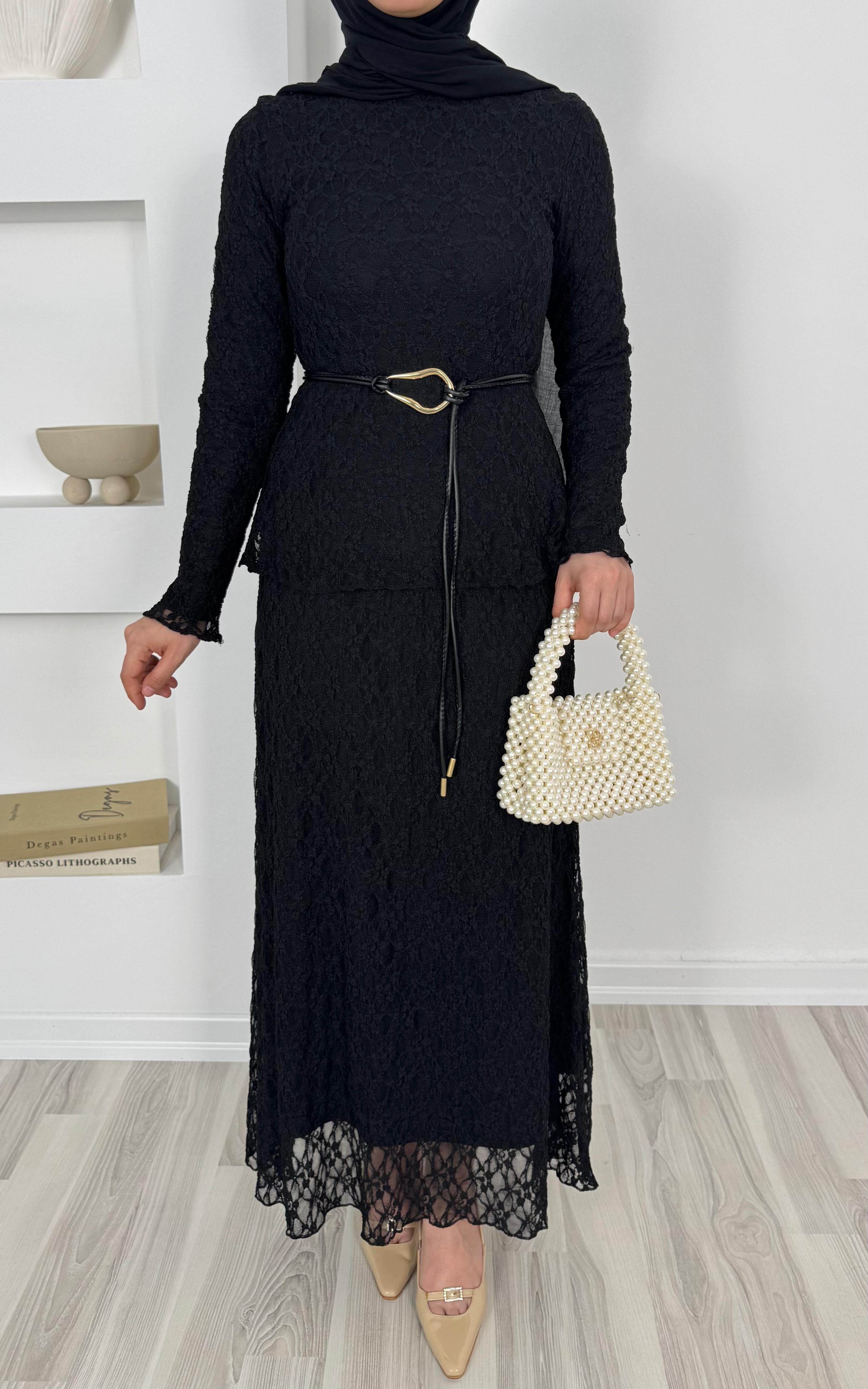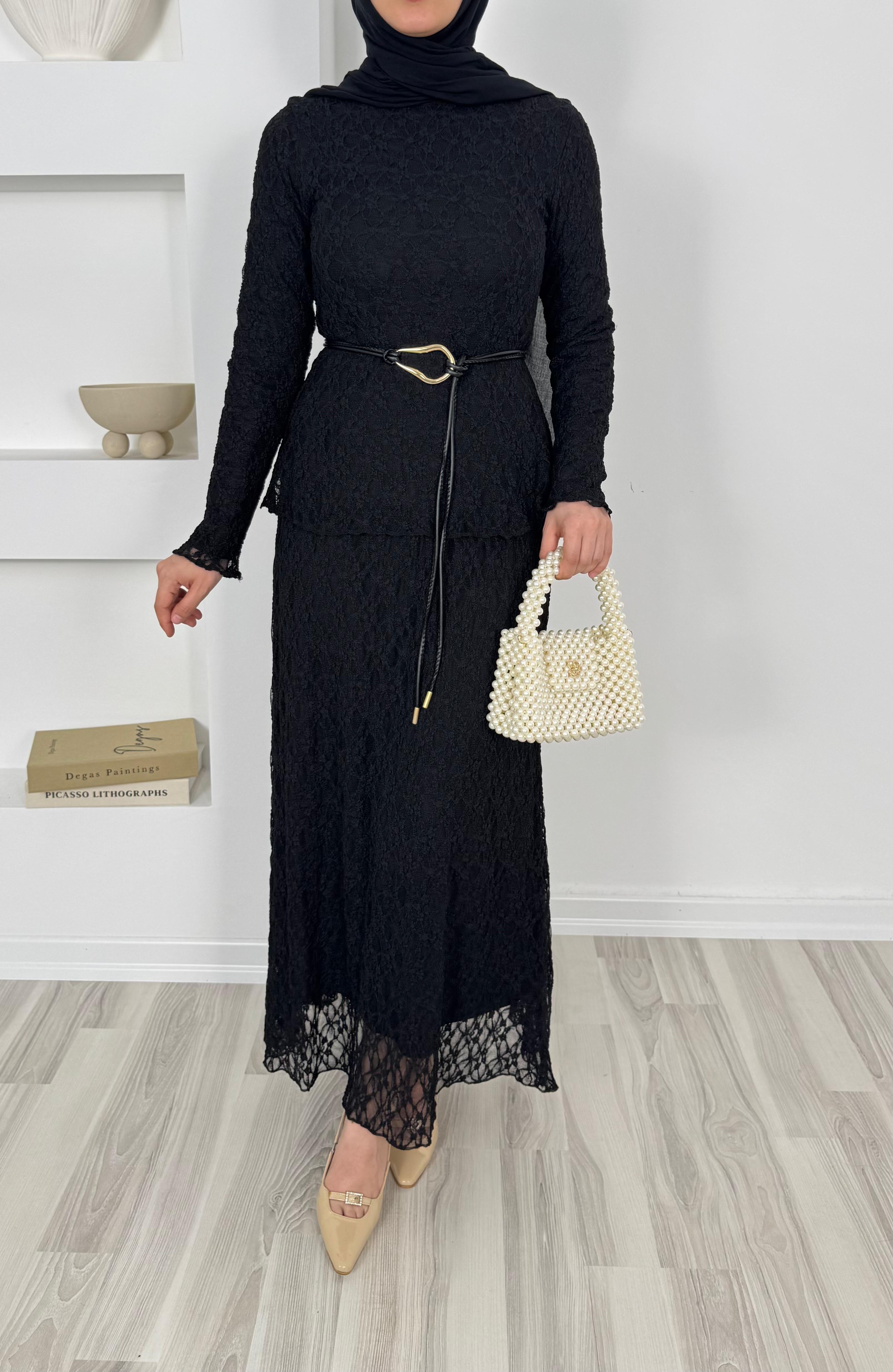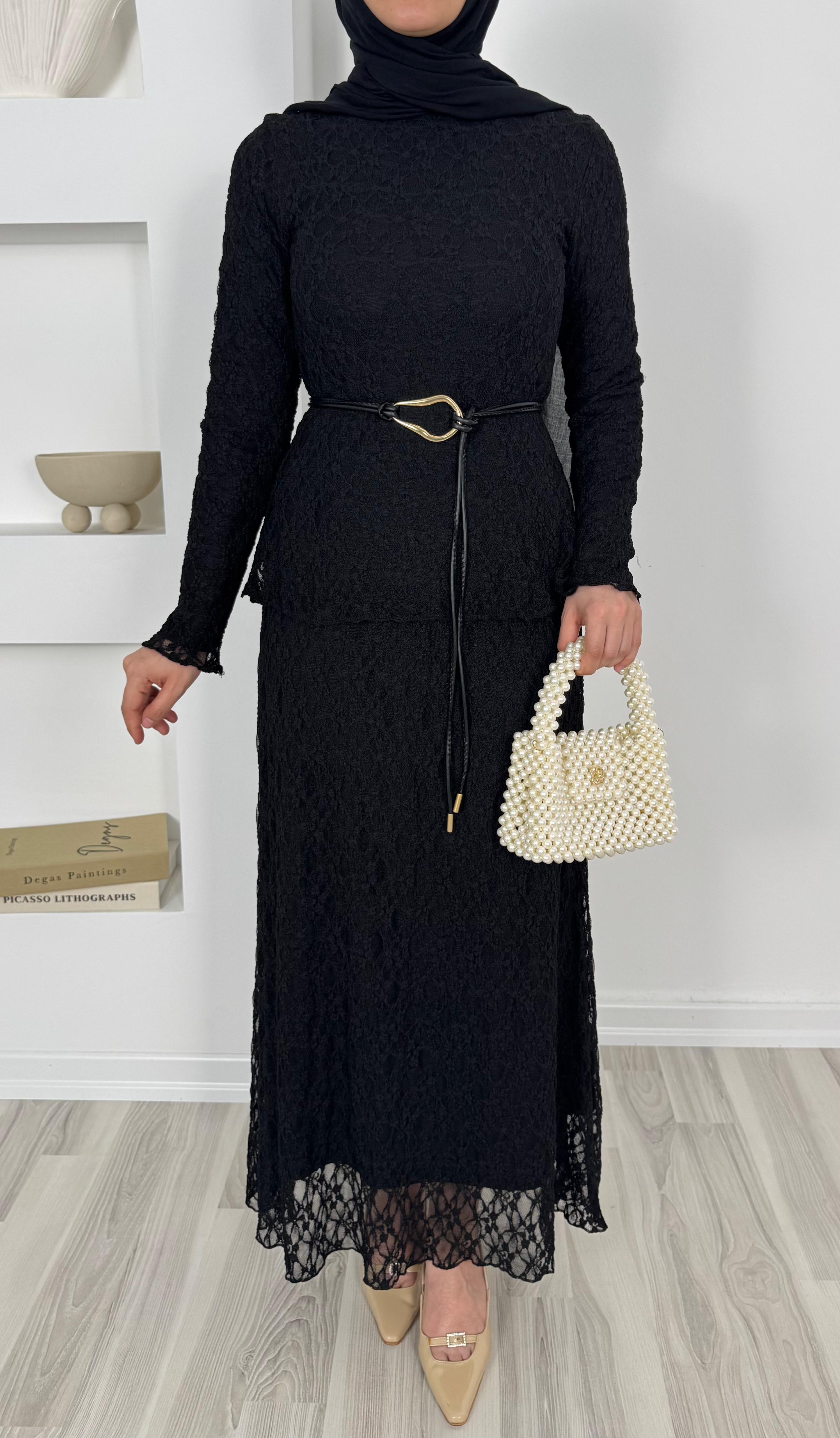 1859-dantel işlemeli kemerli etekli takım-siyah (1859)