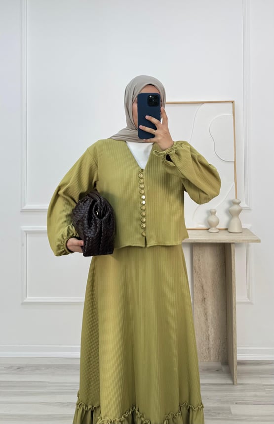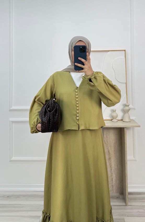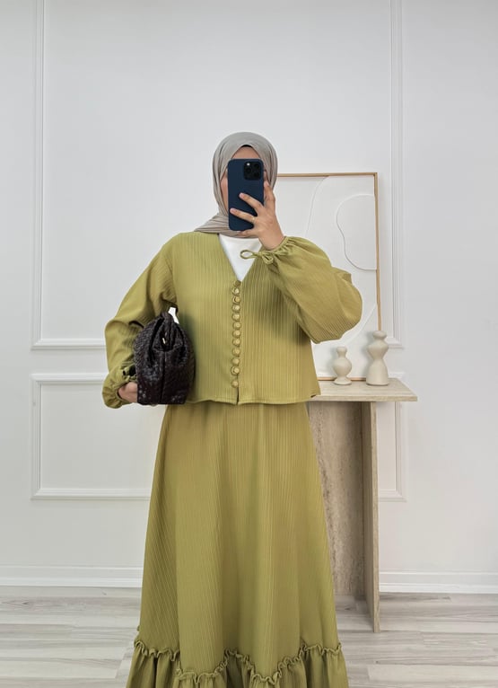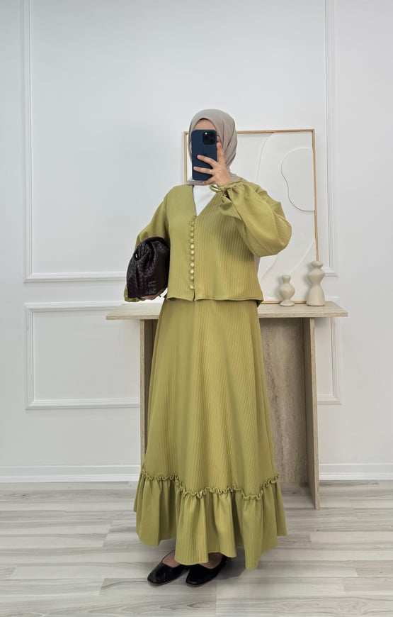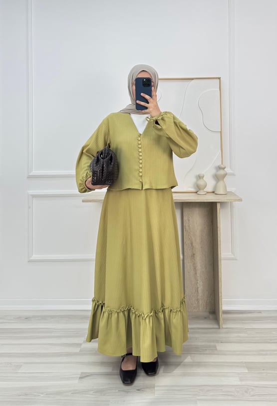 1882-dubai kumaş-kol bağcıklı boydan düğmeli eteği fırfır detaylı takım-yağ yeşili (1882)