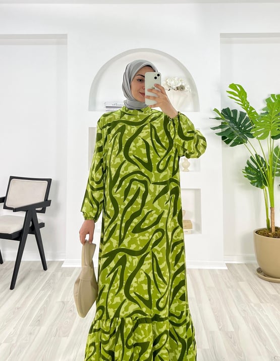 1957-pamuk viskon kumaş-etnik desenli etek altı fırfırlı elbise-yağ yeşili (1957)