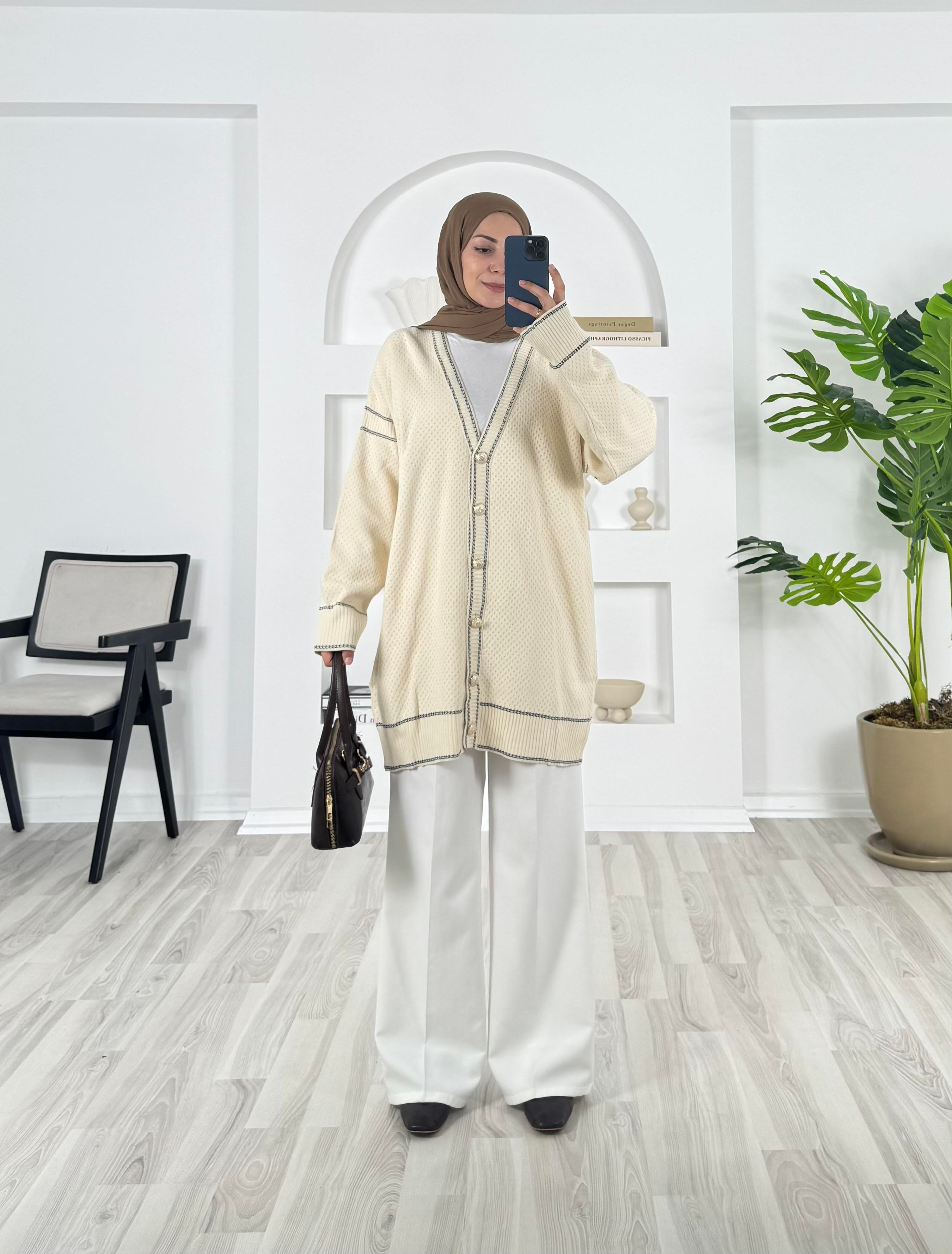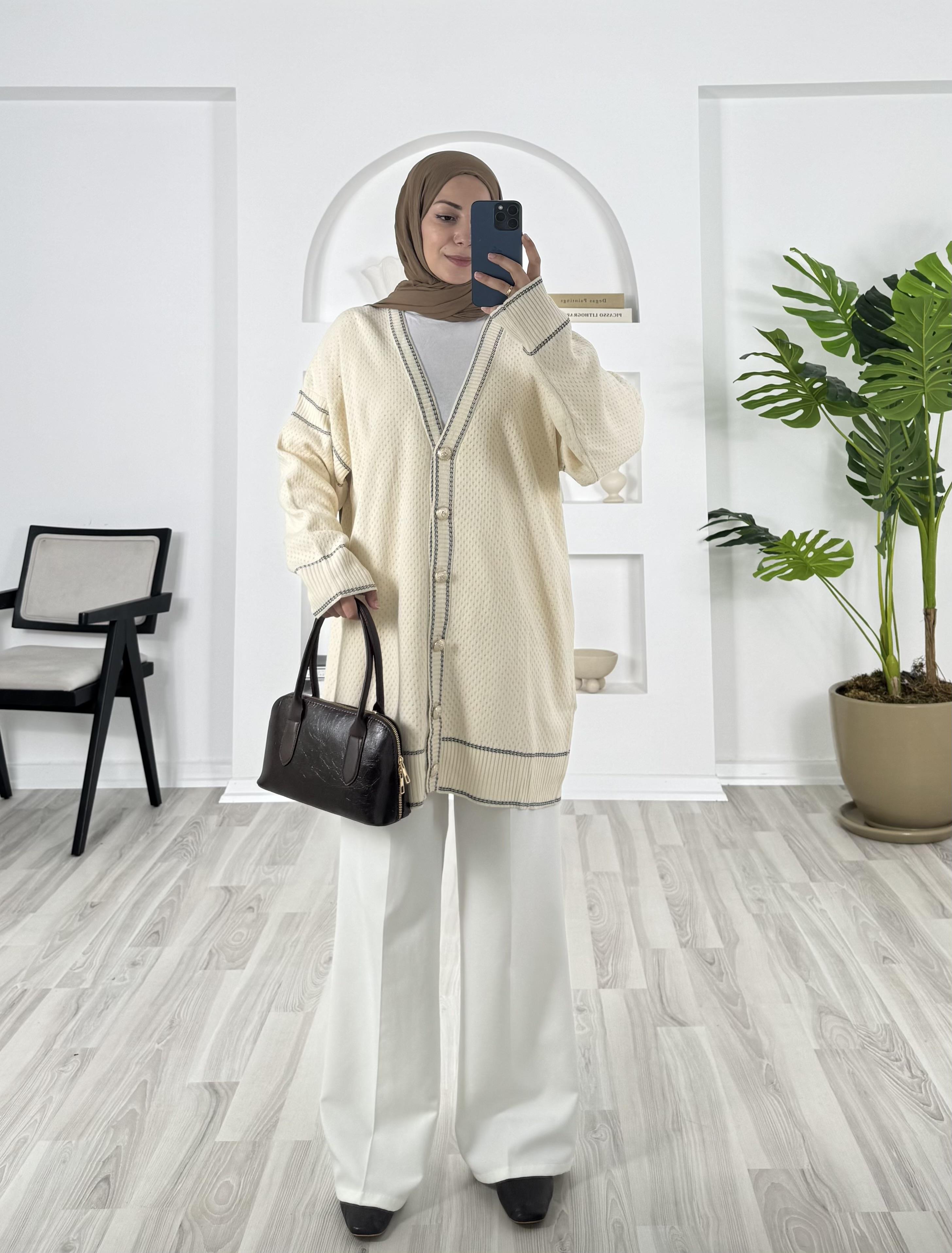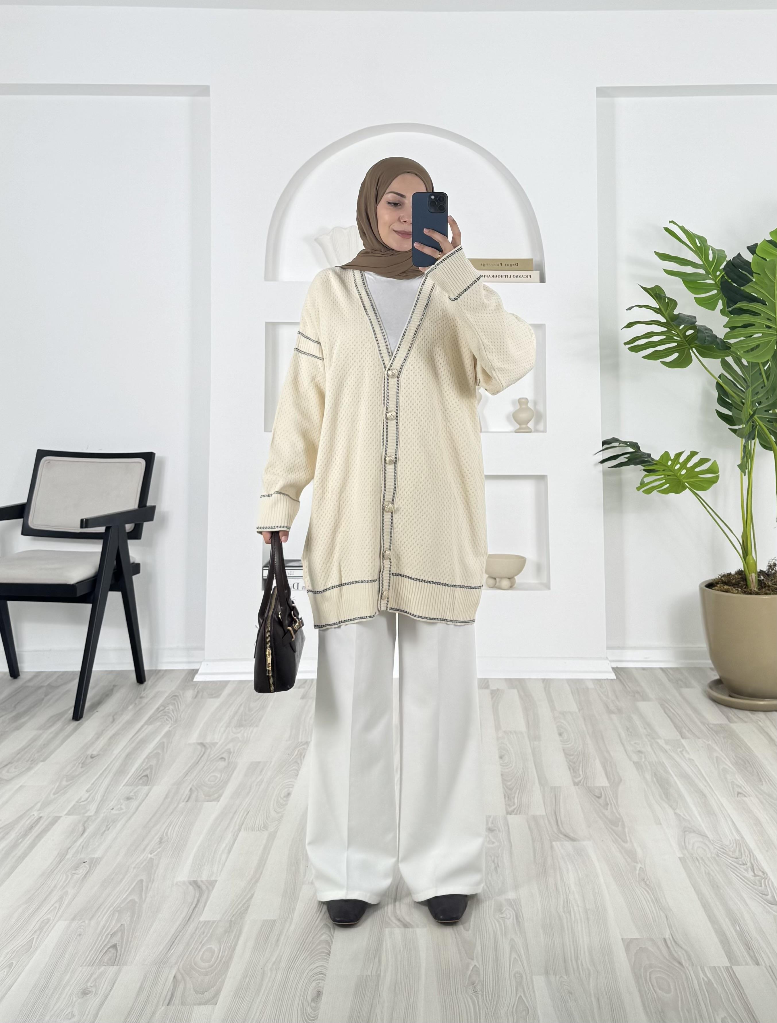 19634 - önü dügmeli çizgi detaylı triko hırka - beyaz (19634)