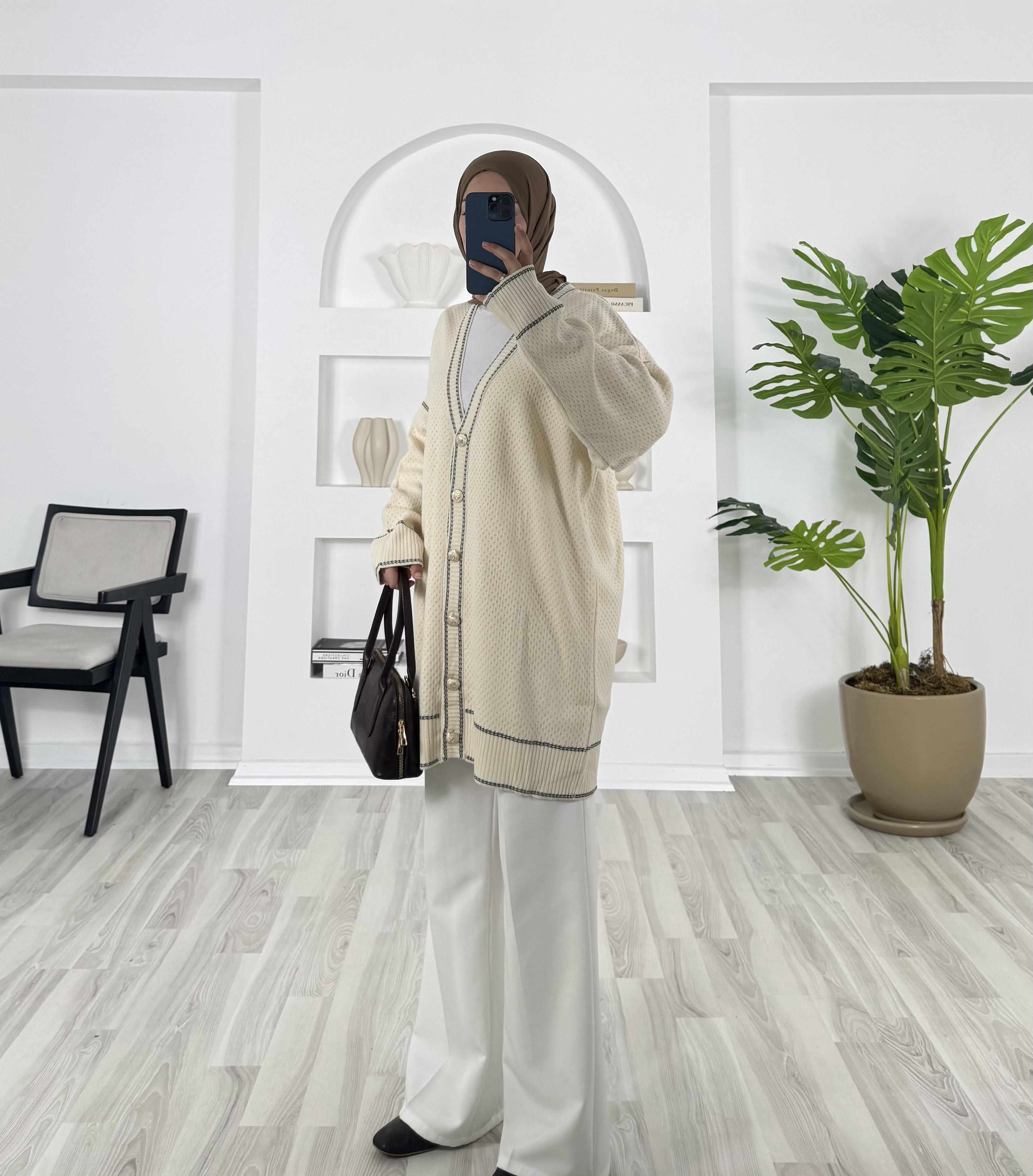 önü dügmeli çizgi detaylı triko hırka