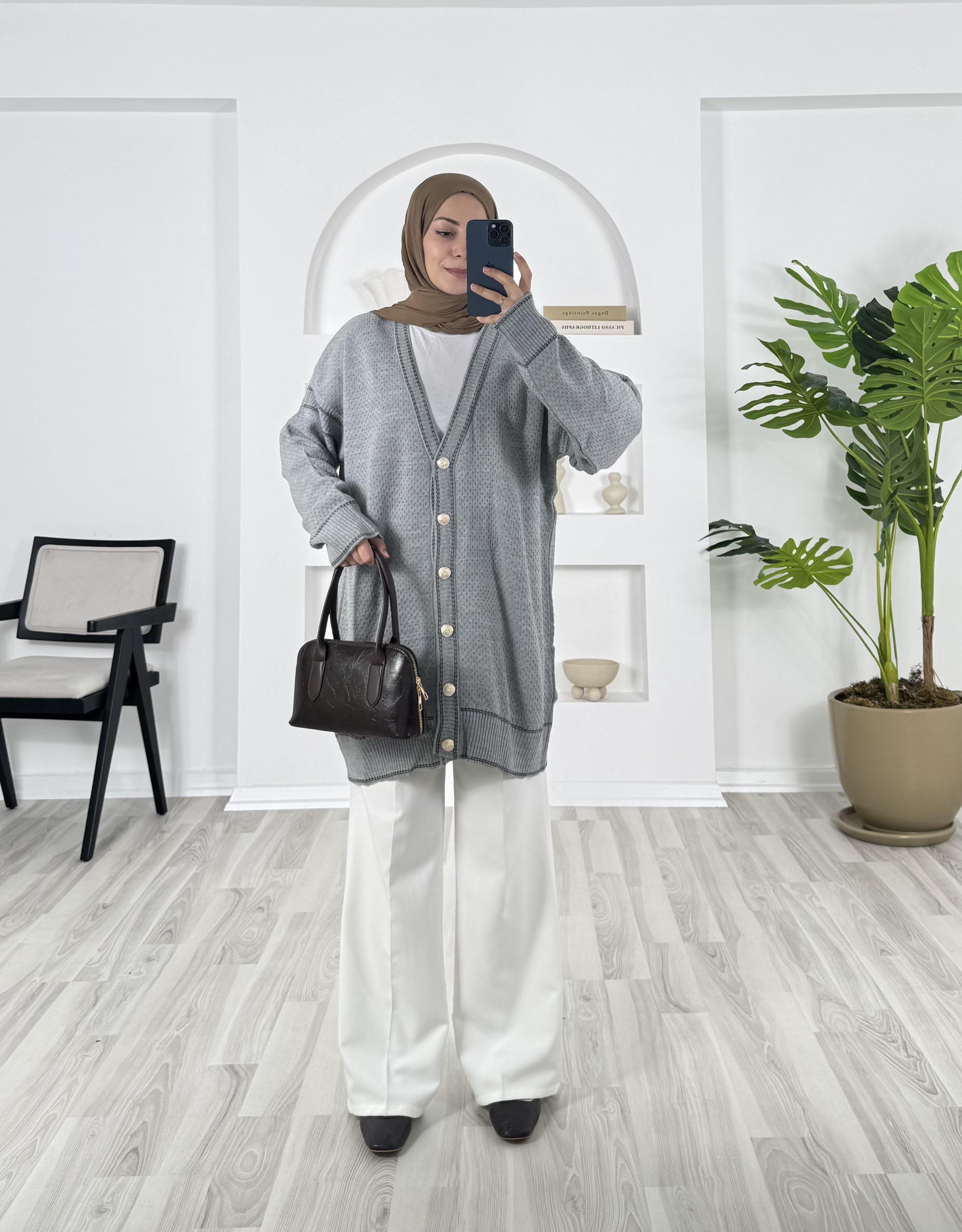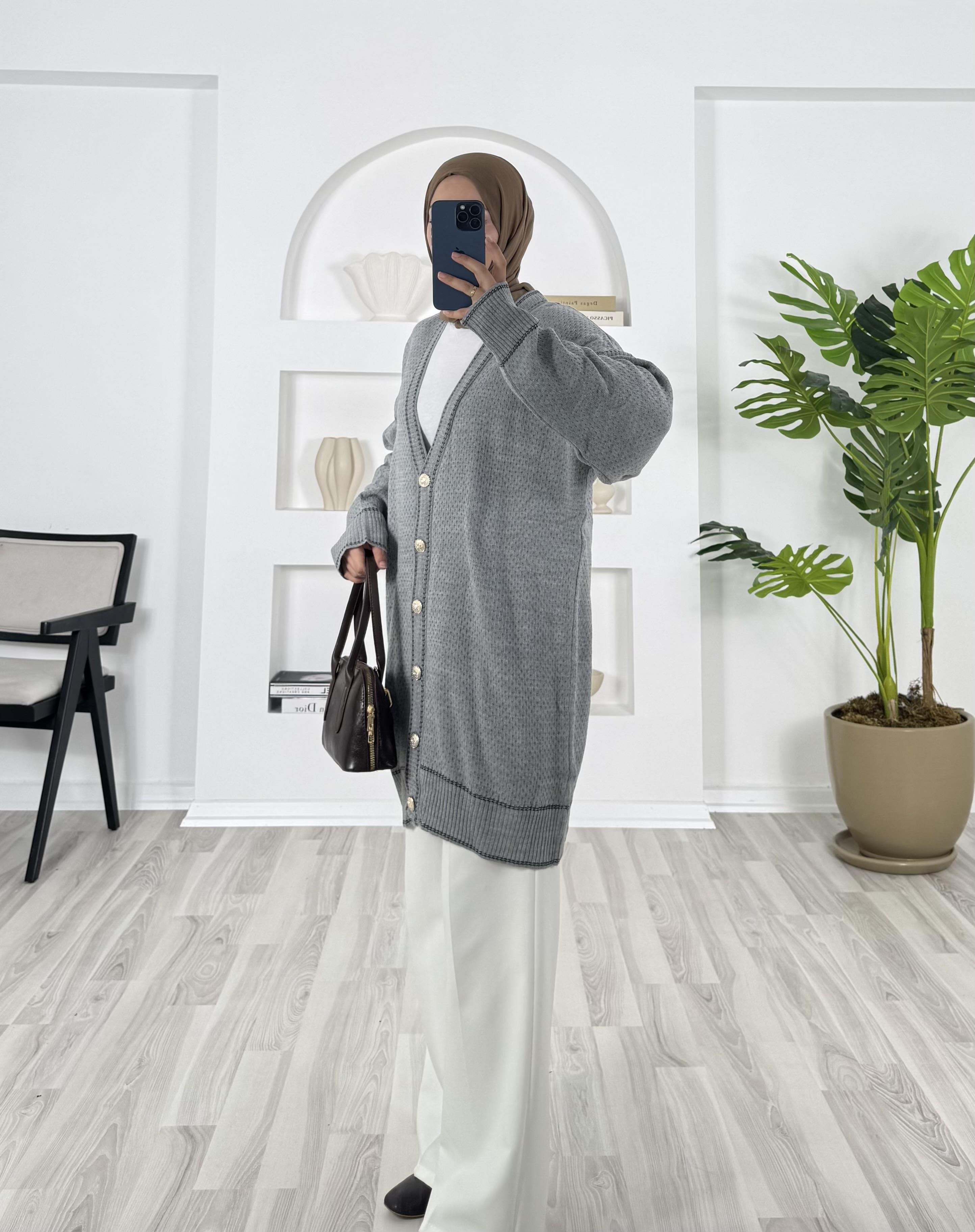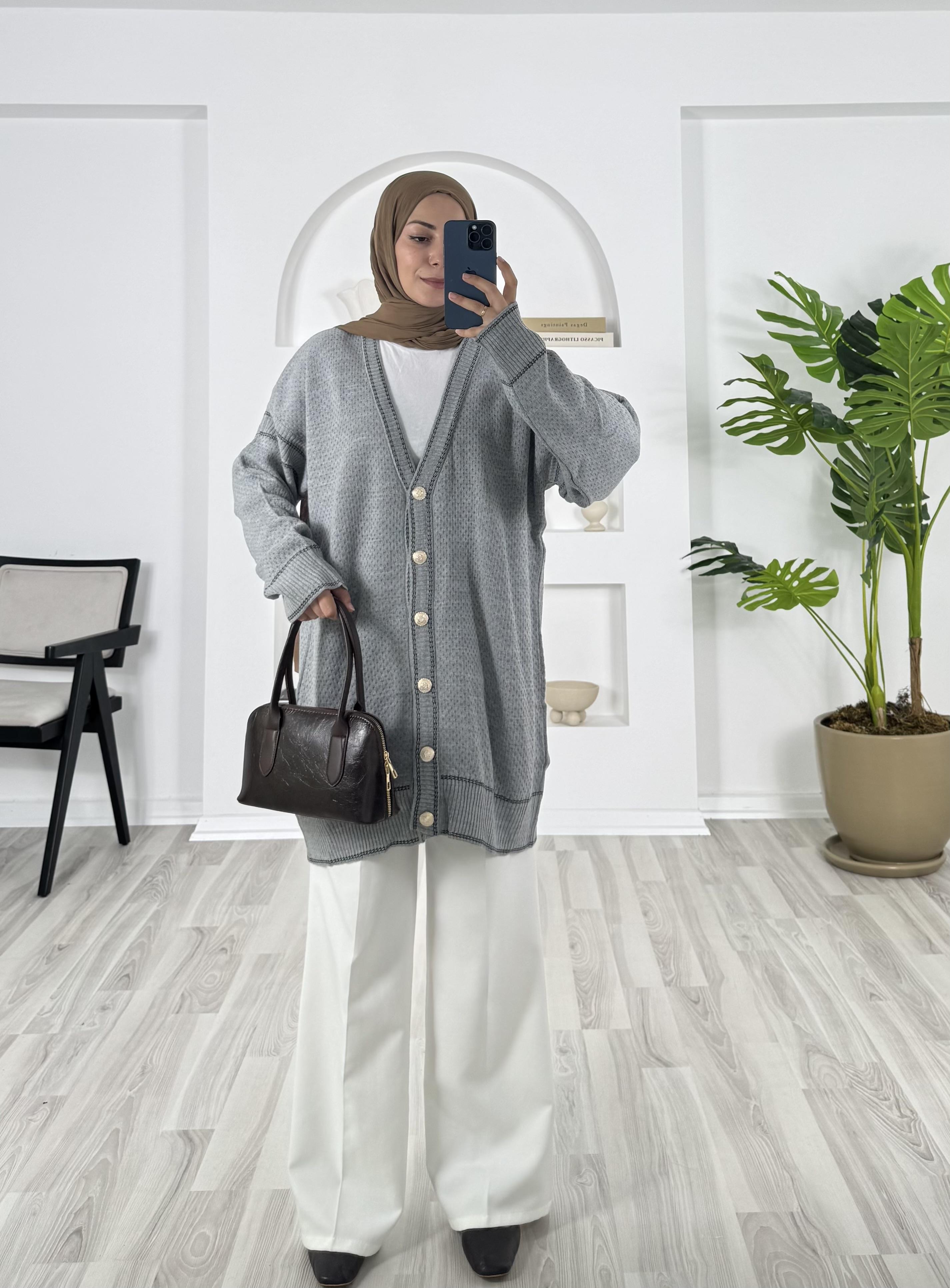 19634 - önü dügmeli çizgi detaylı triko hırka - gri (19634)